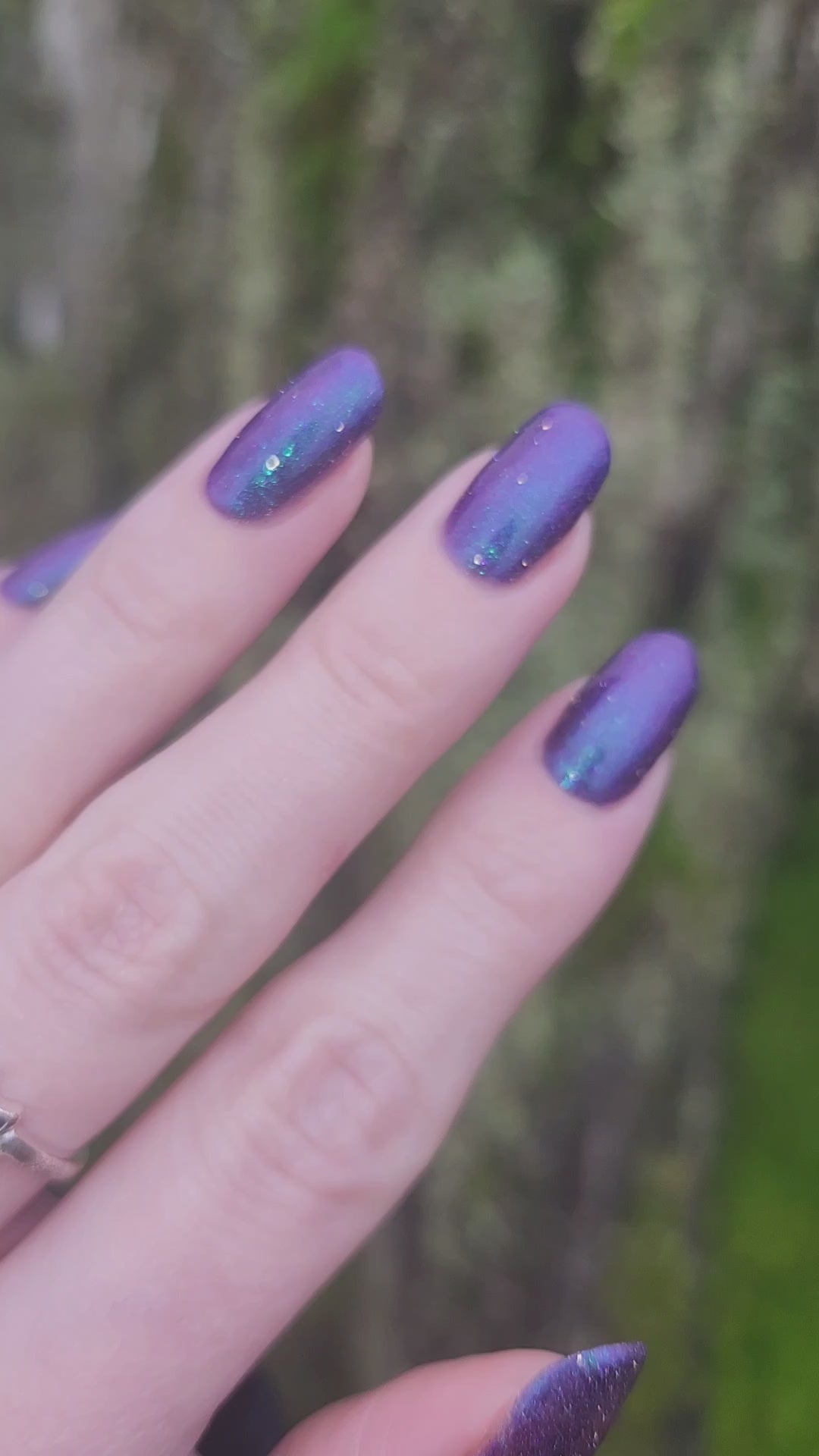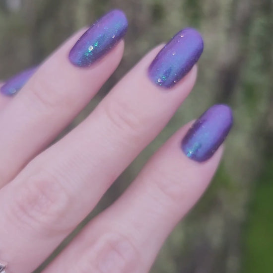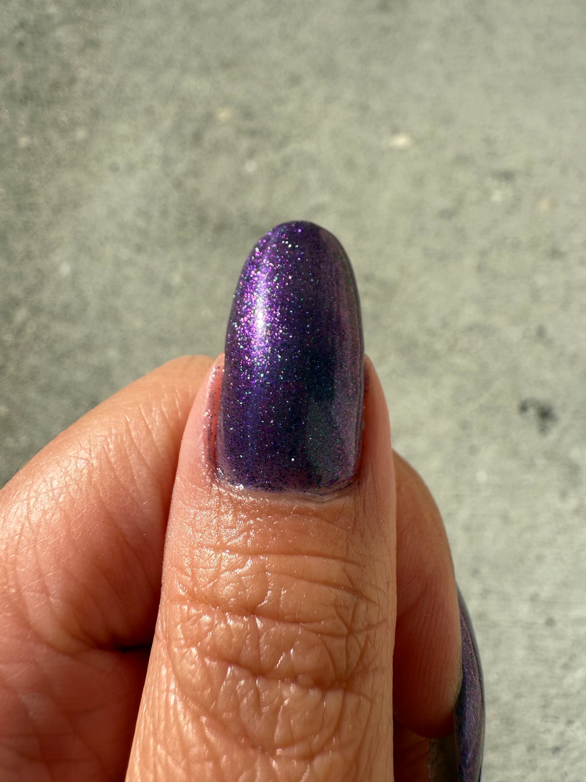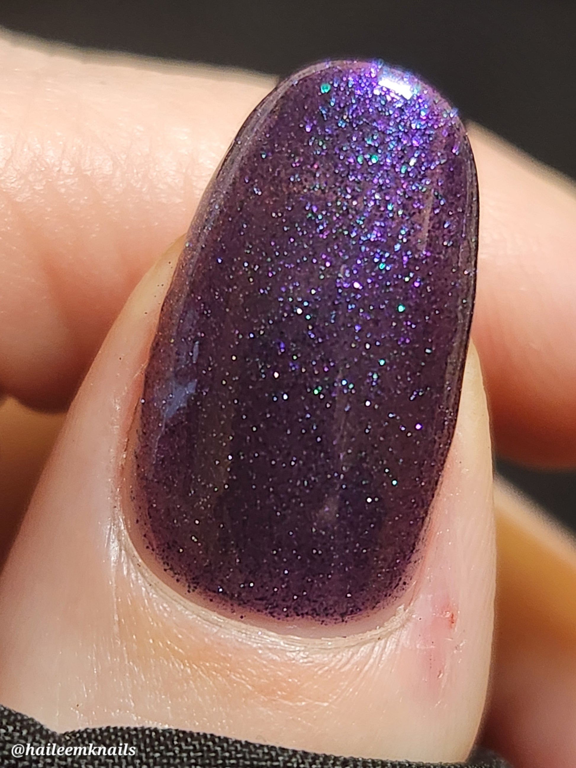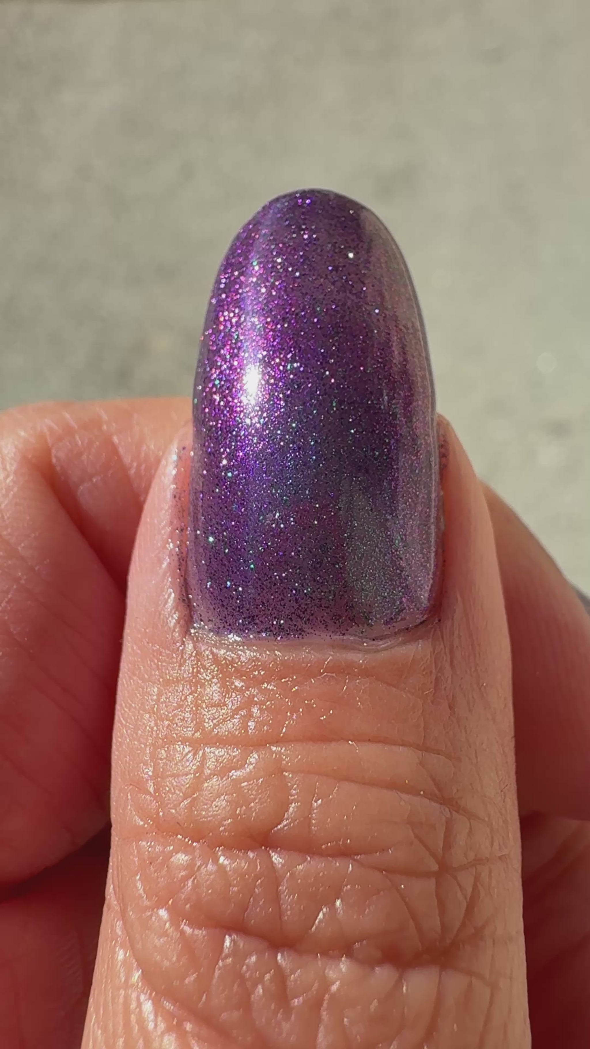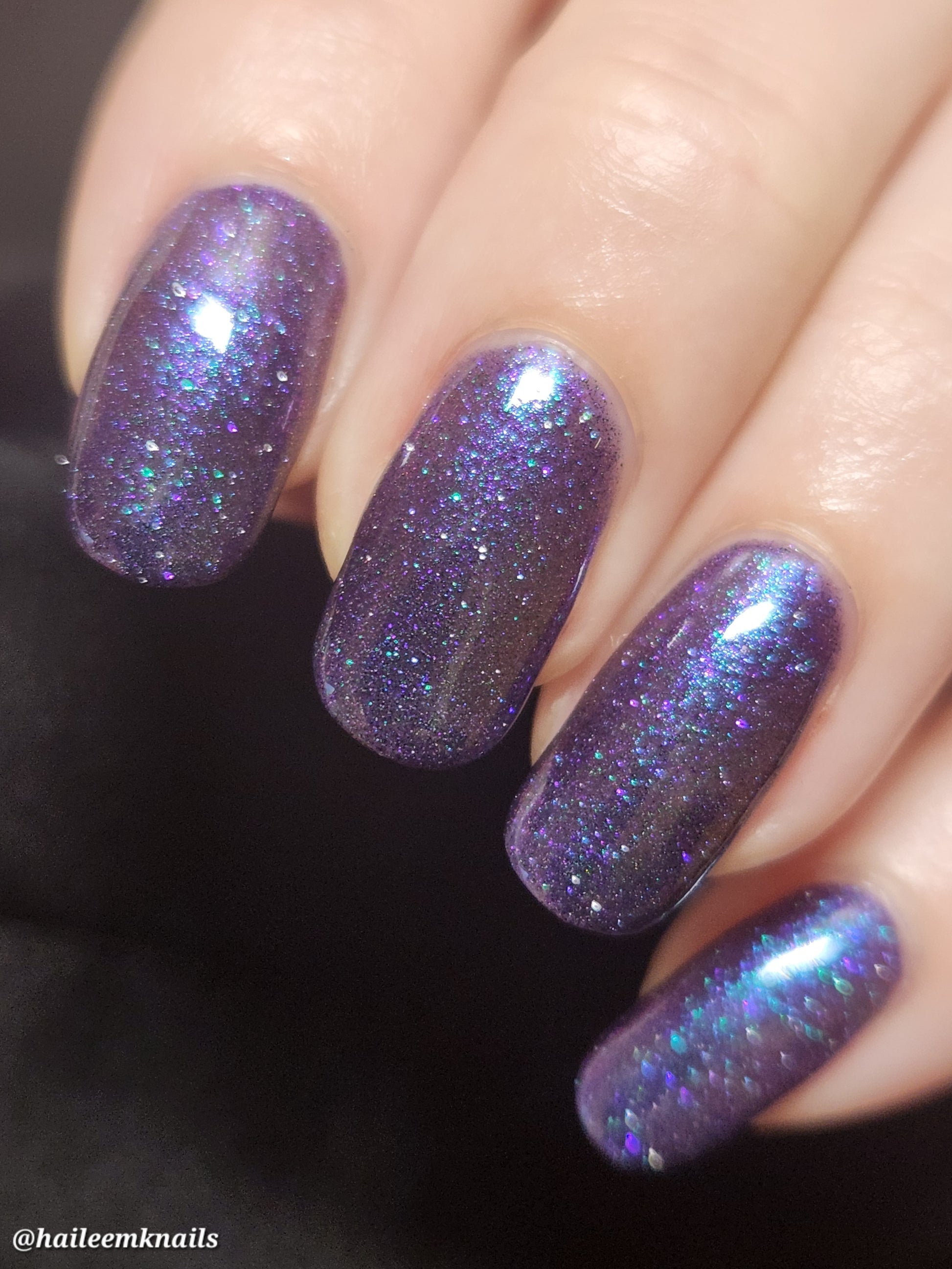 A light purple base with purple and green shimmer, purple and green micro glitters, and reflective glitter.