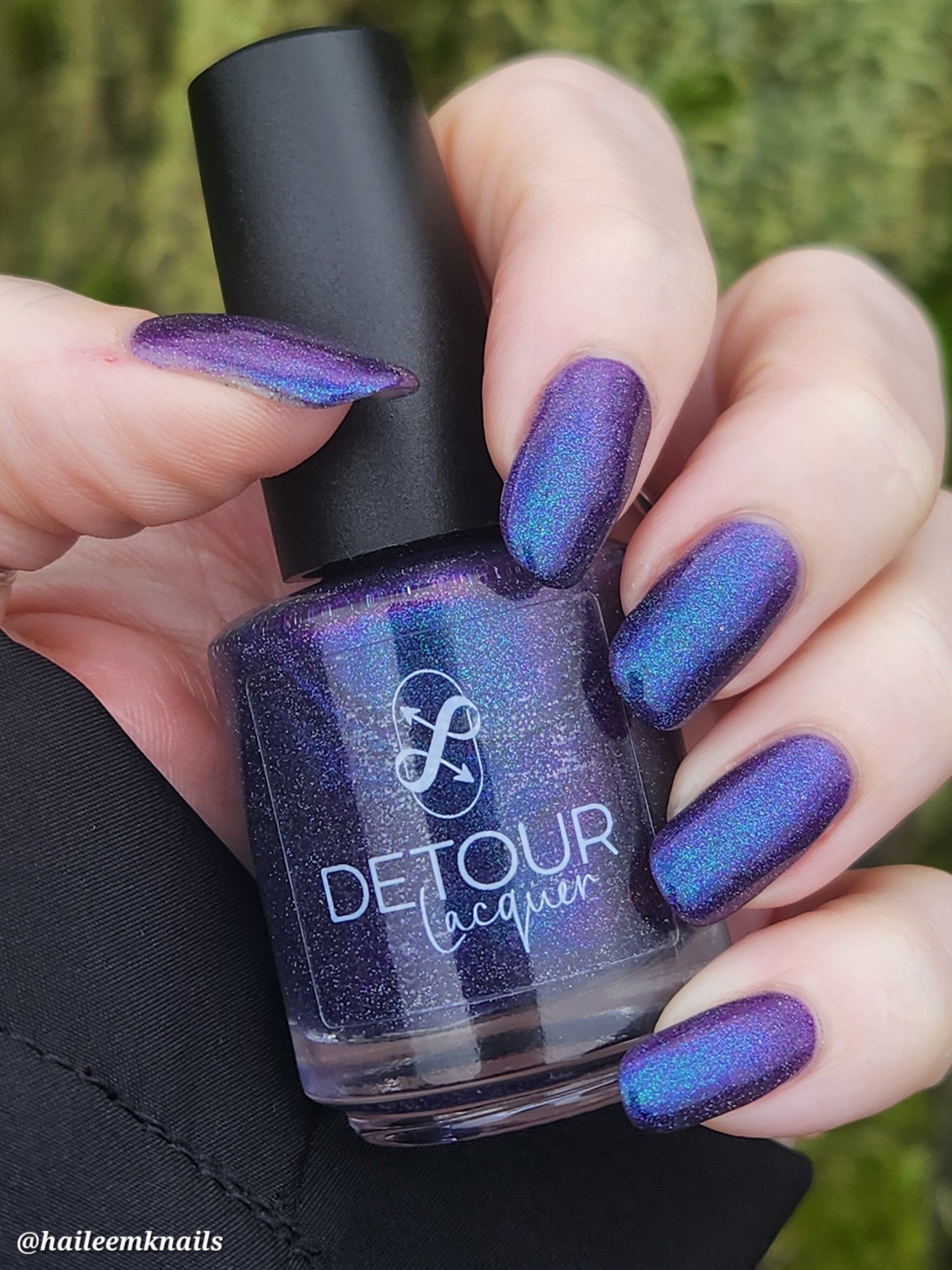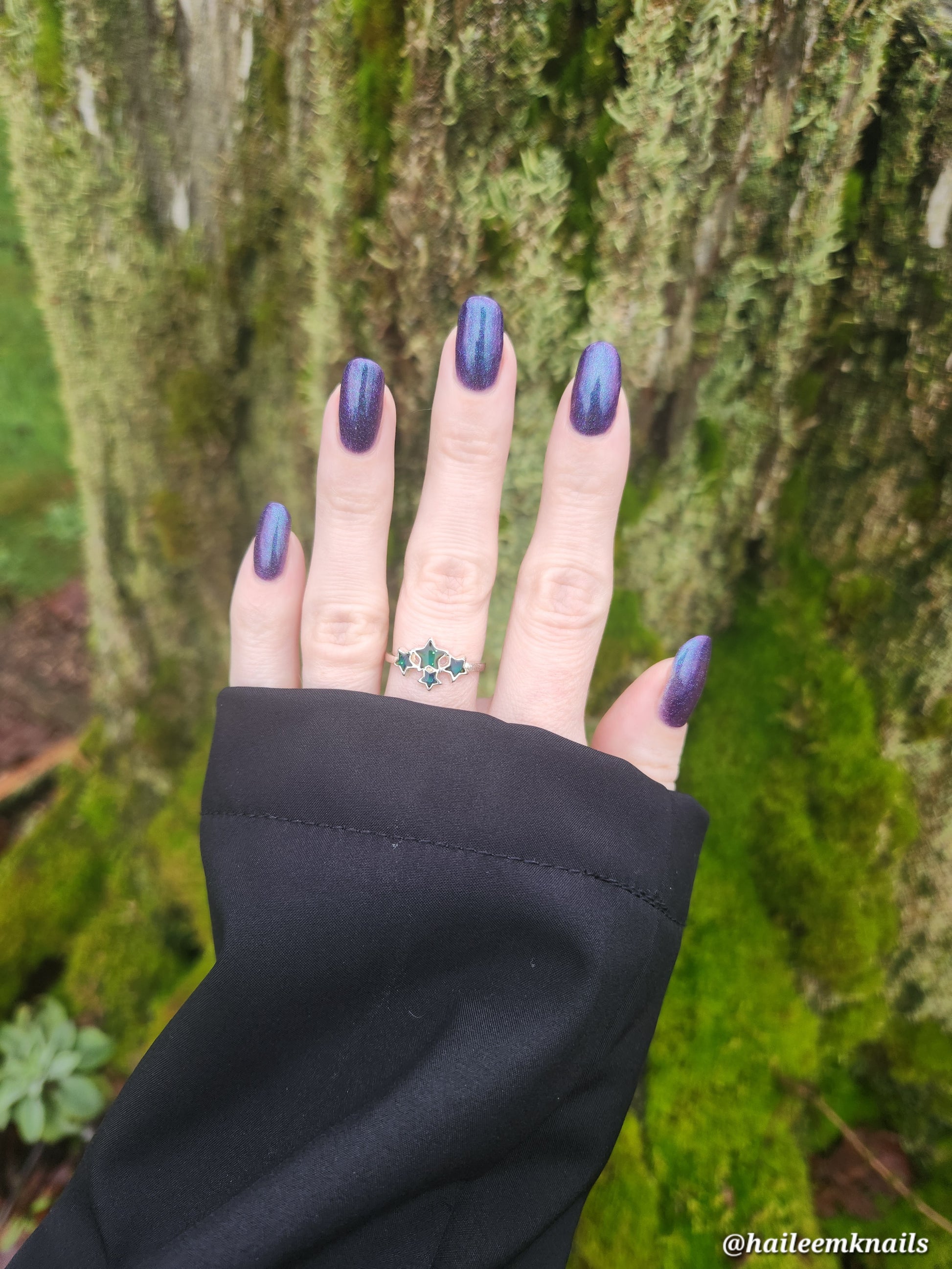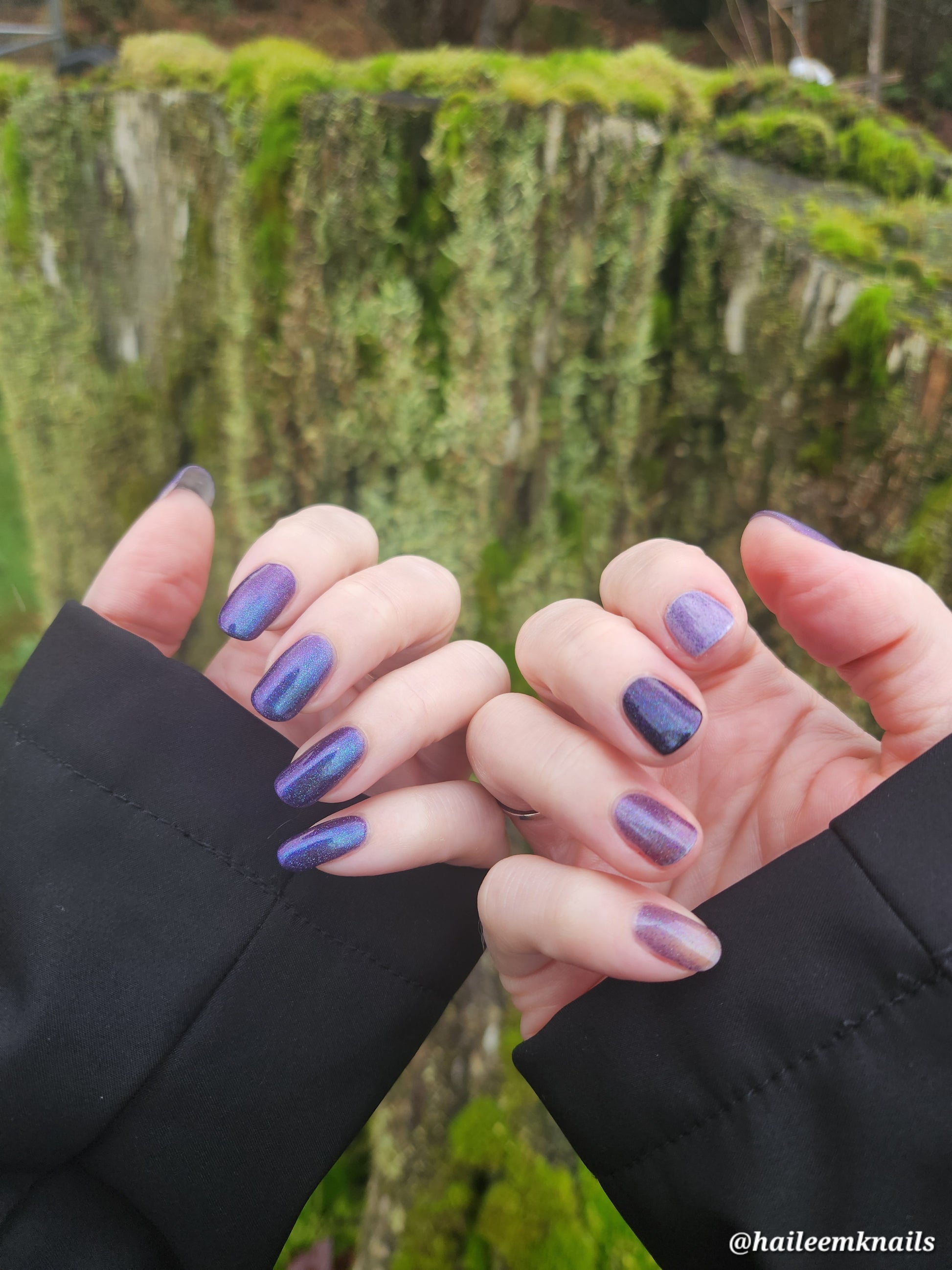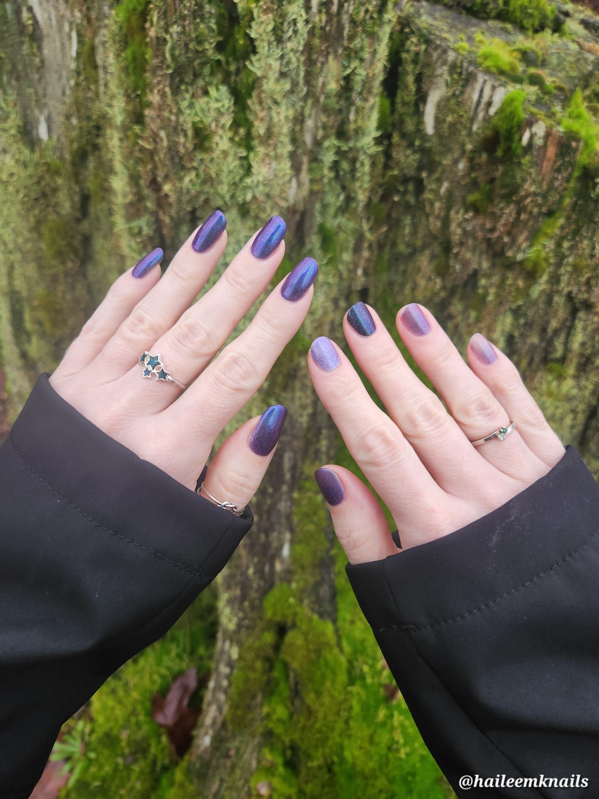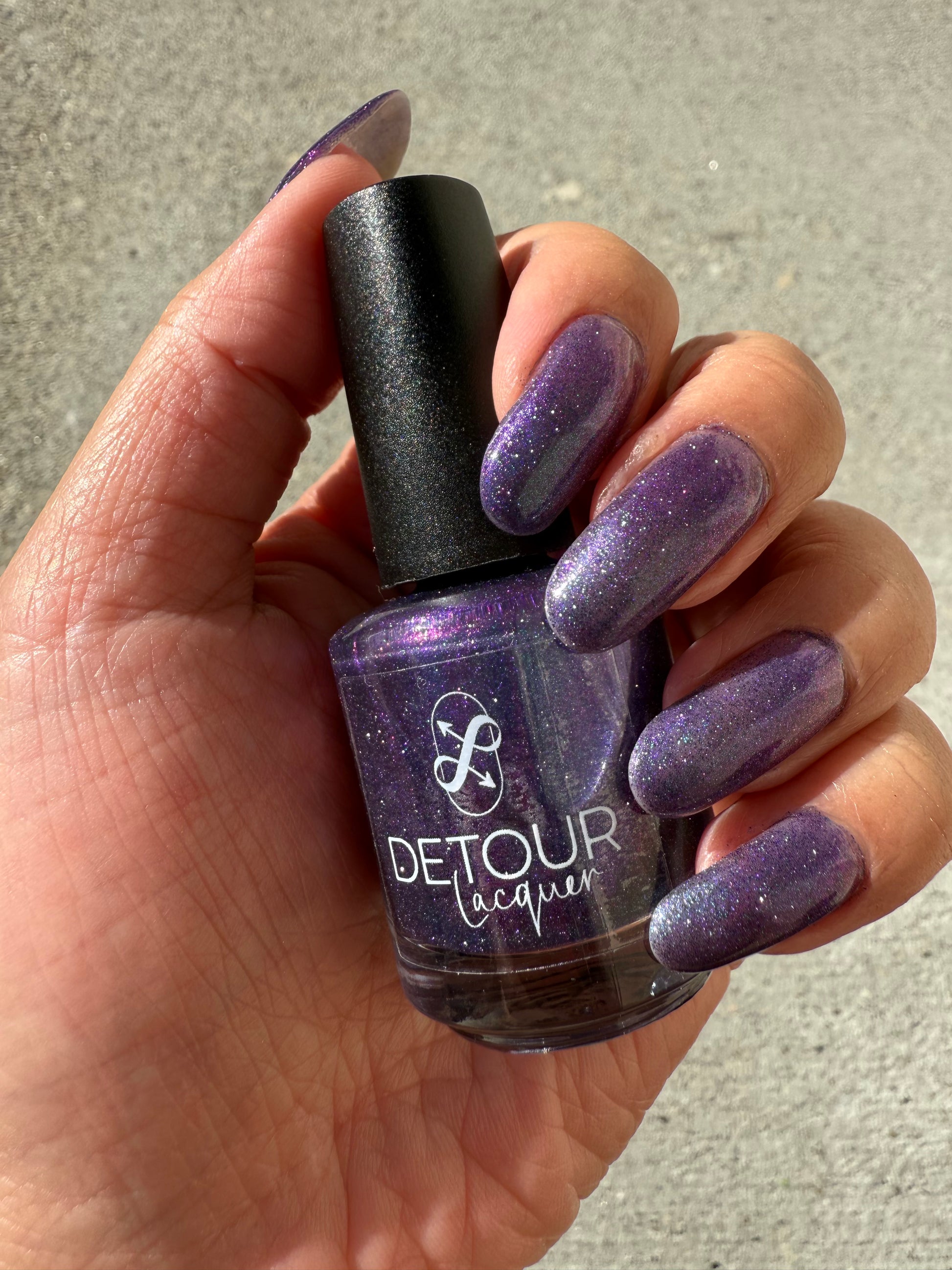 A light purple base with purple and green shimmer, purple and green micro glitters, and reflective glitter.