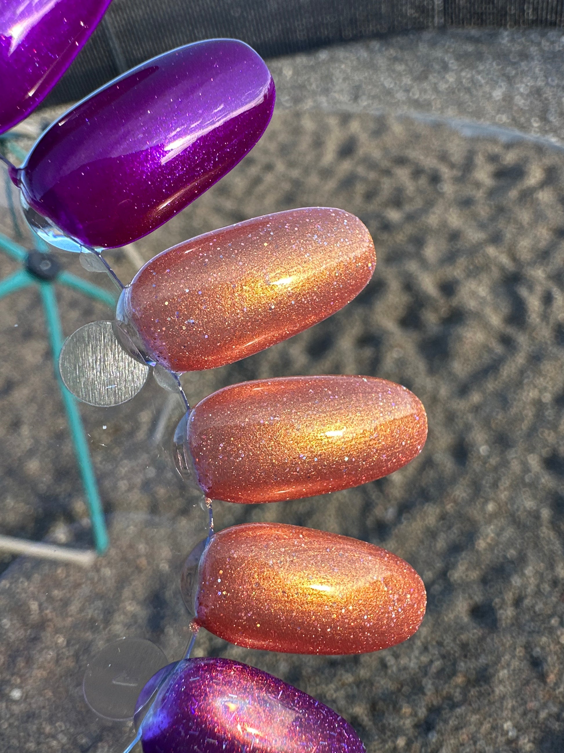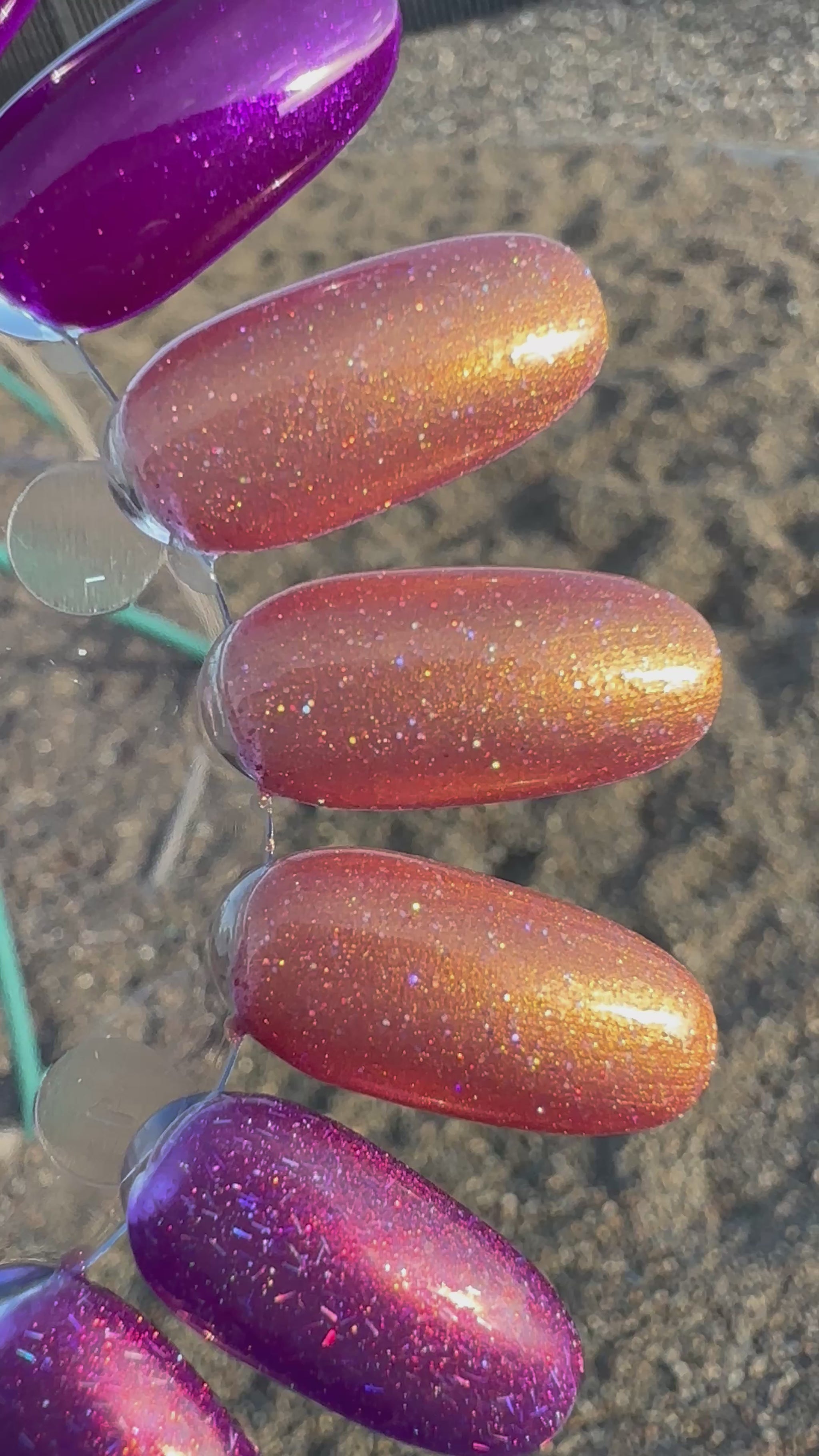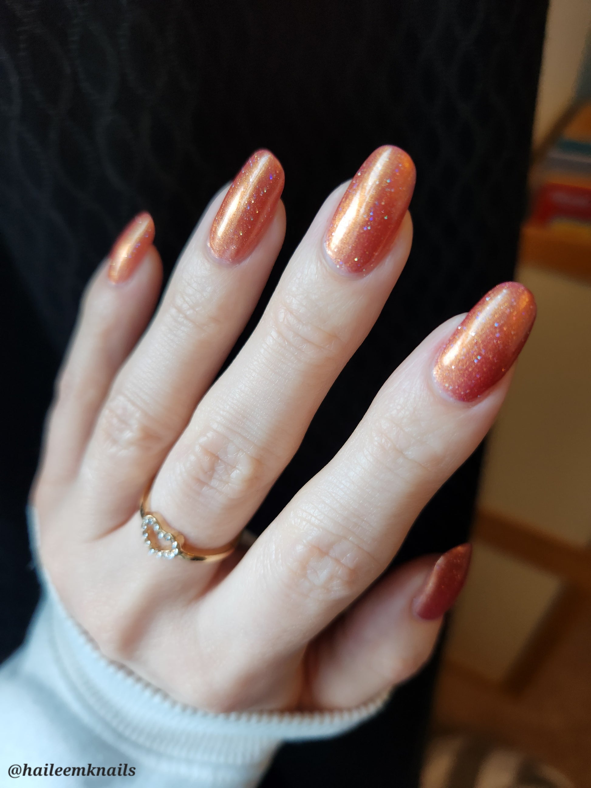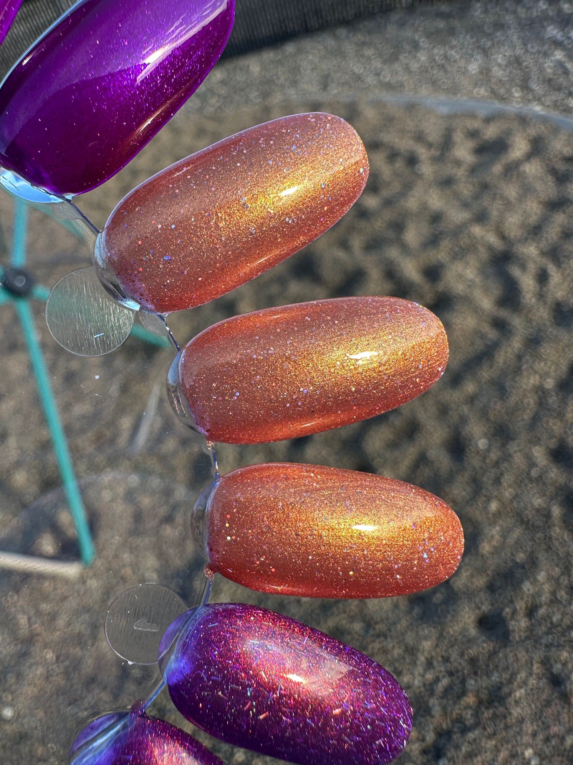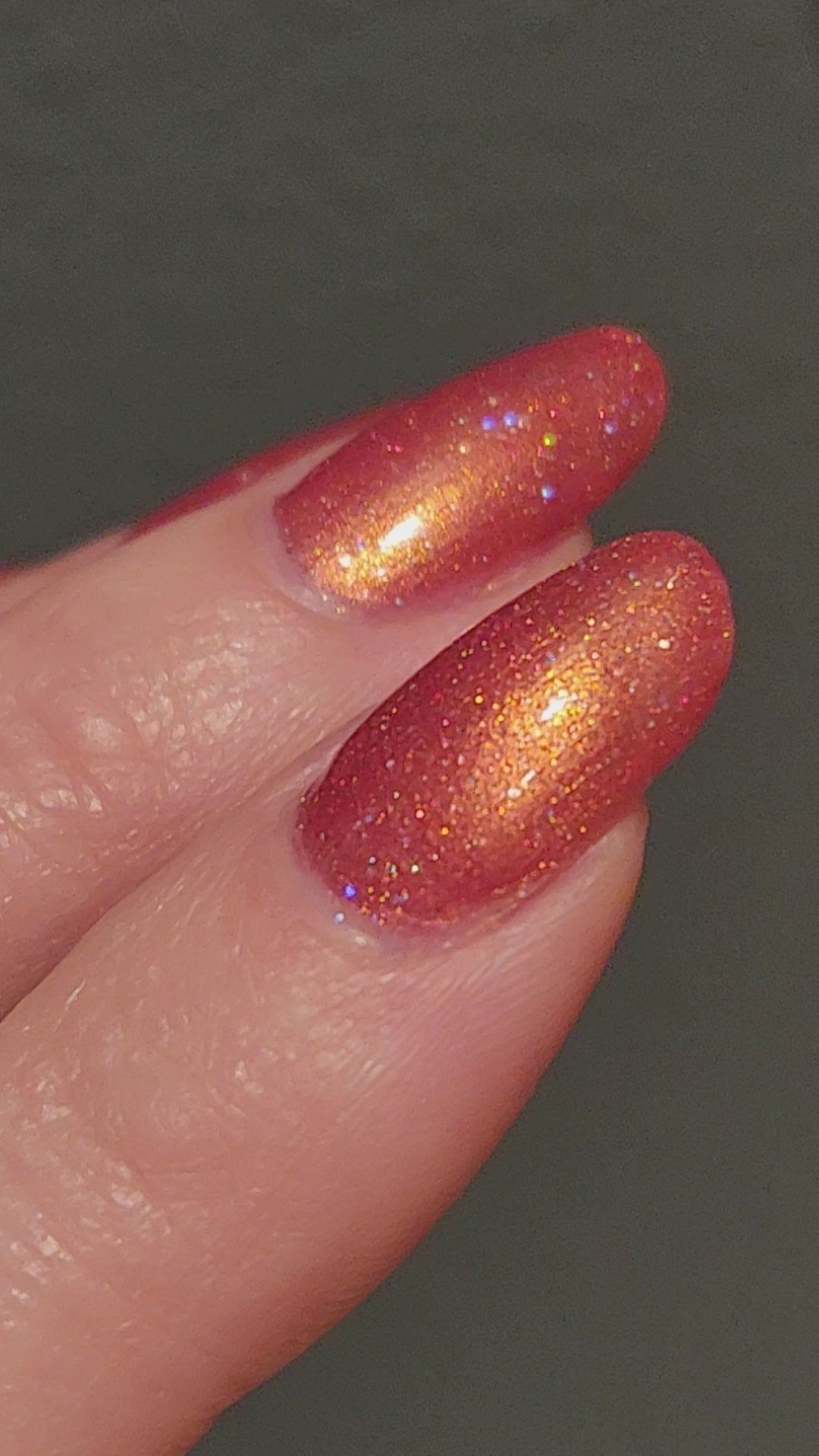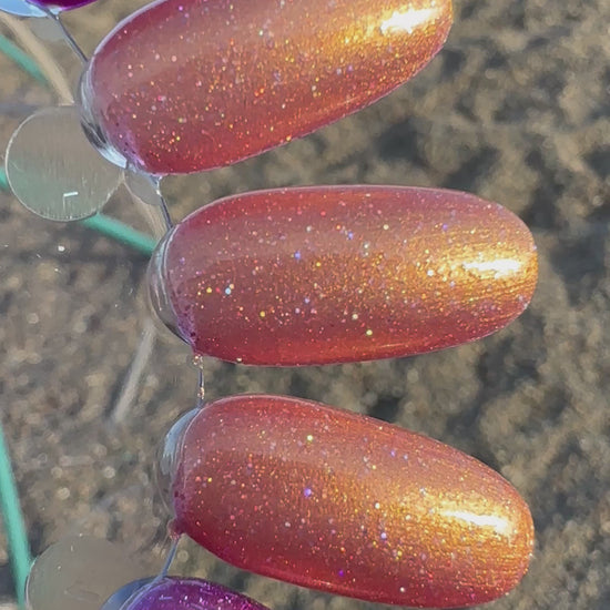 A copper-gold base with gold and rainbow holo and gold light reflective glitter