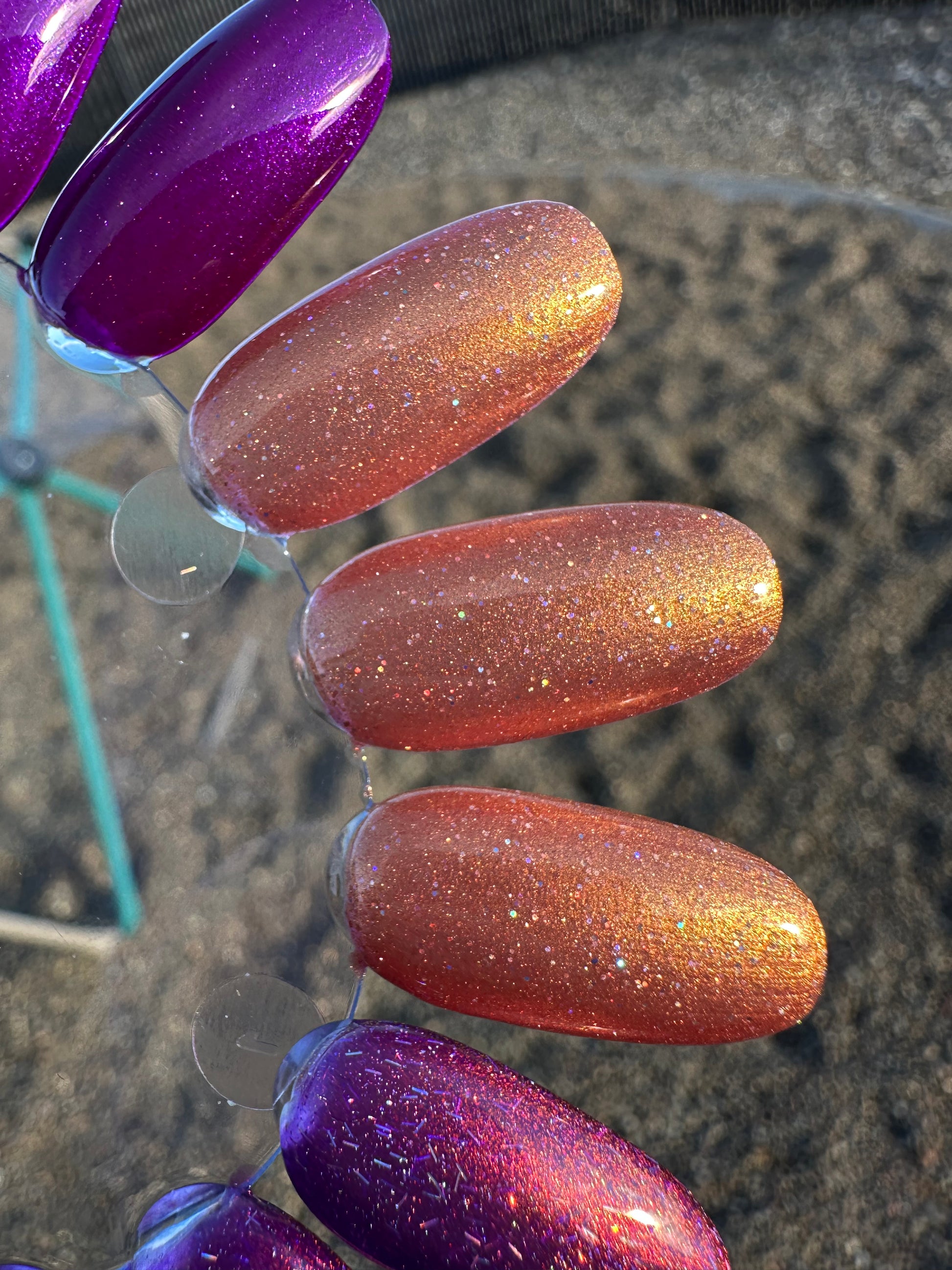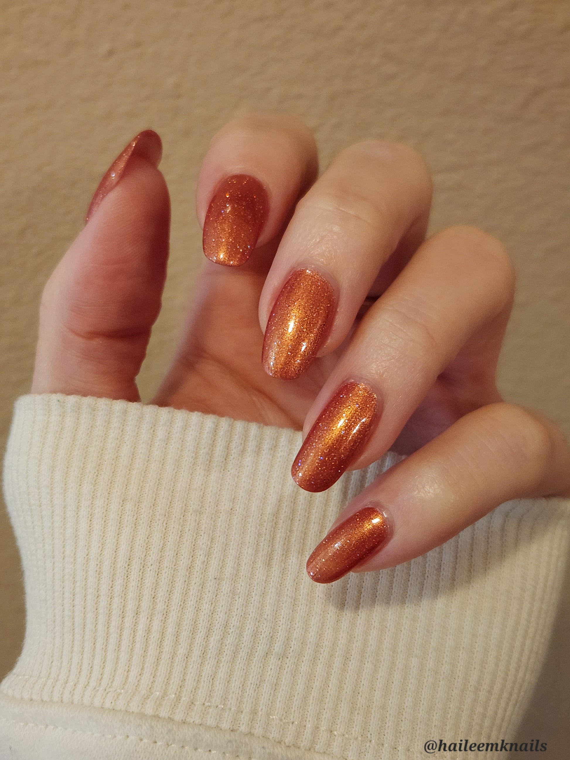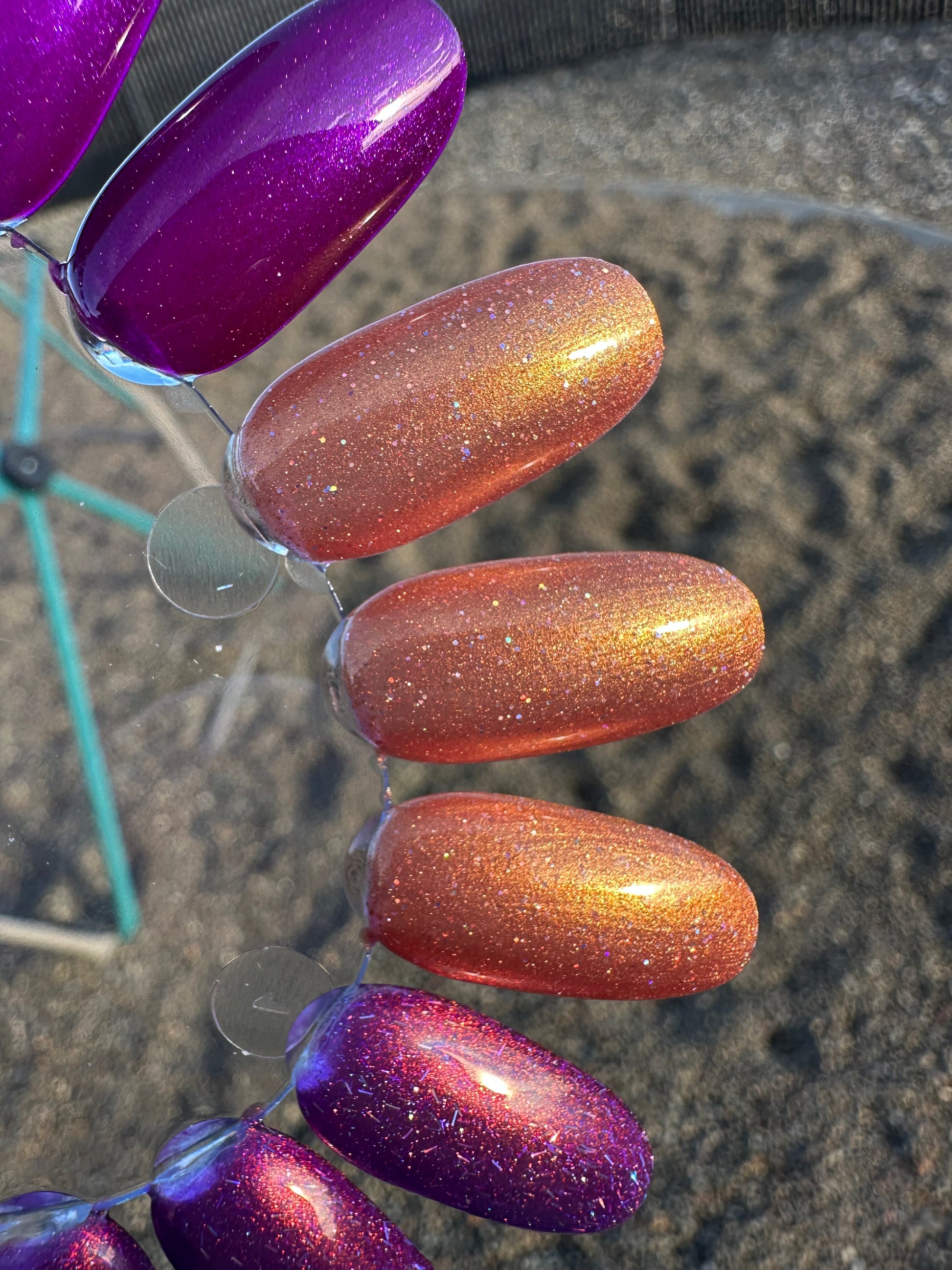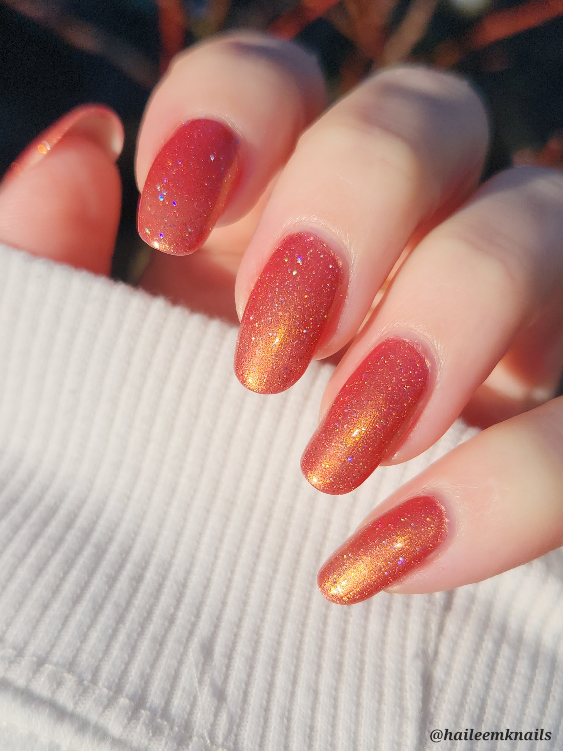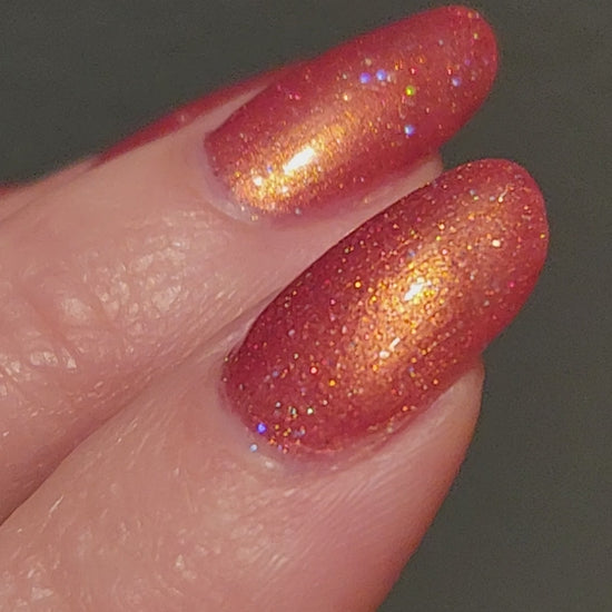 A copper-gold base with gold and rainbow holo and gold light reflective glitter