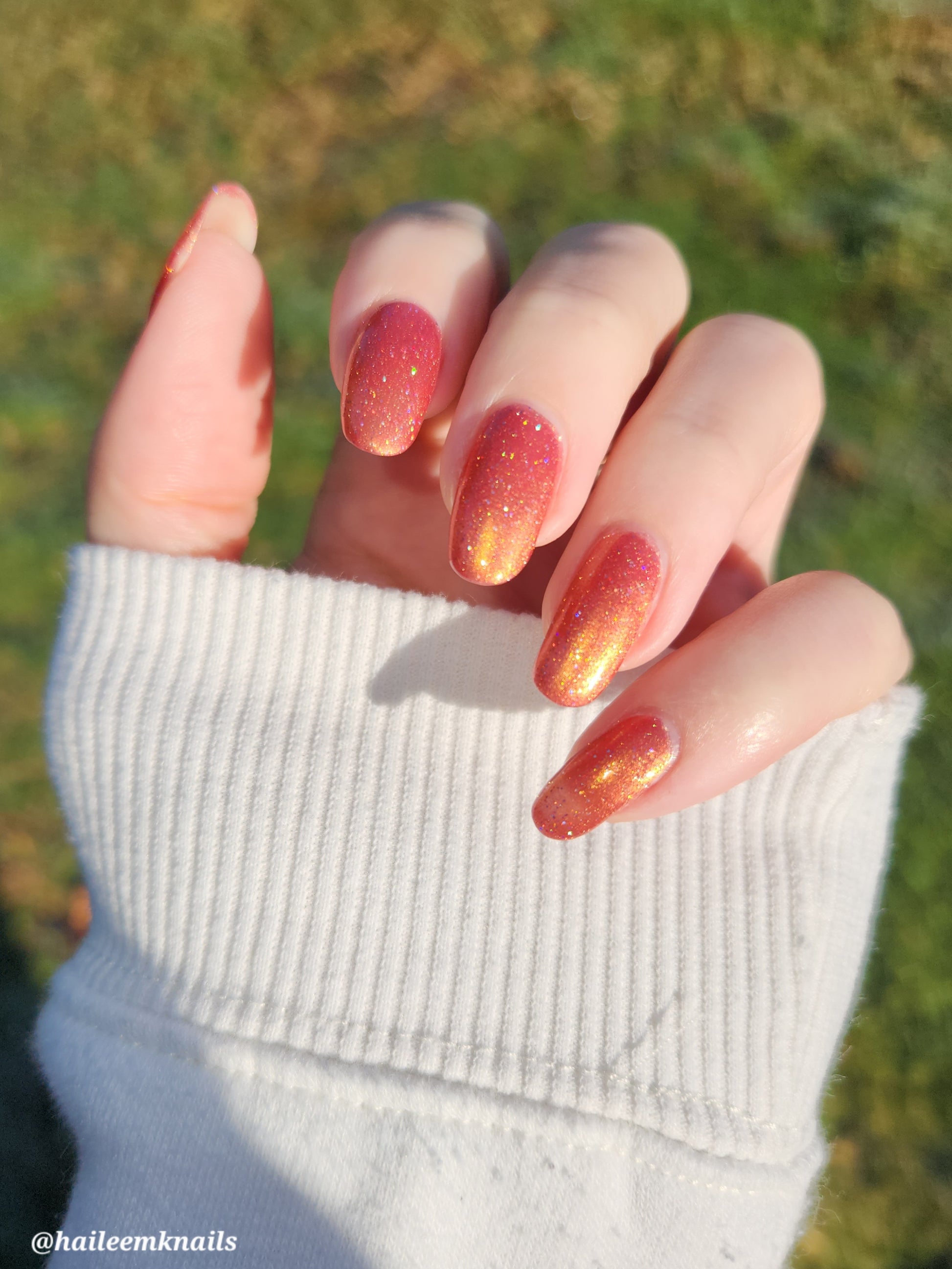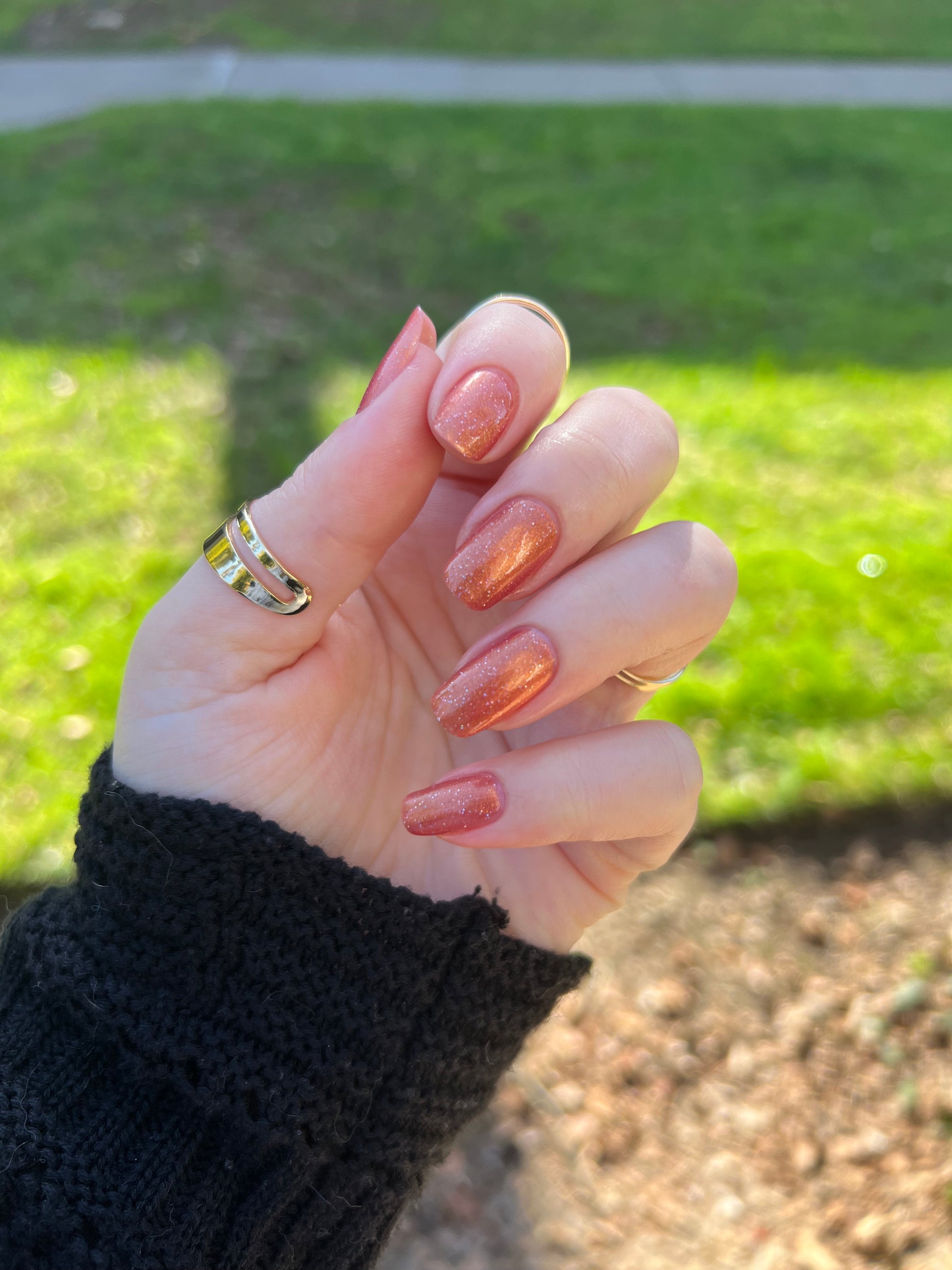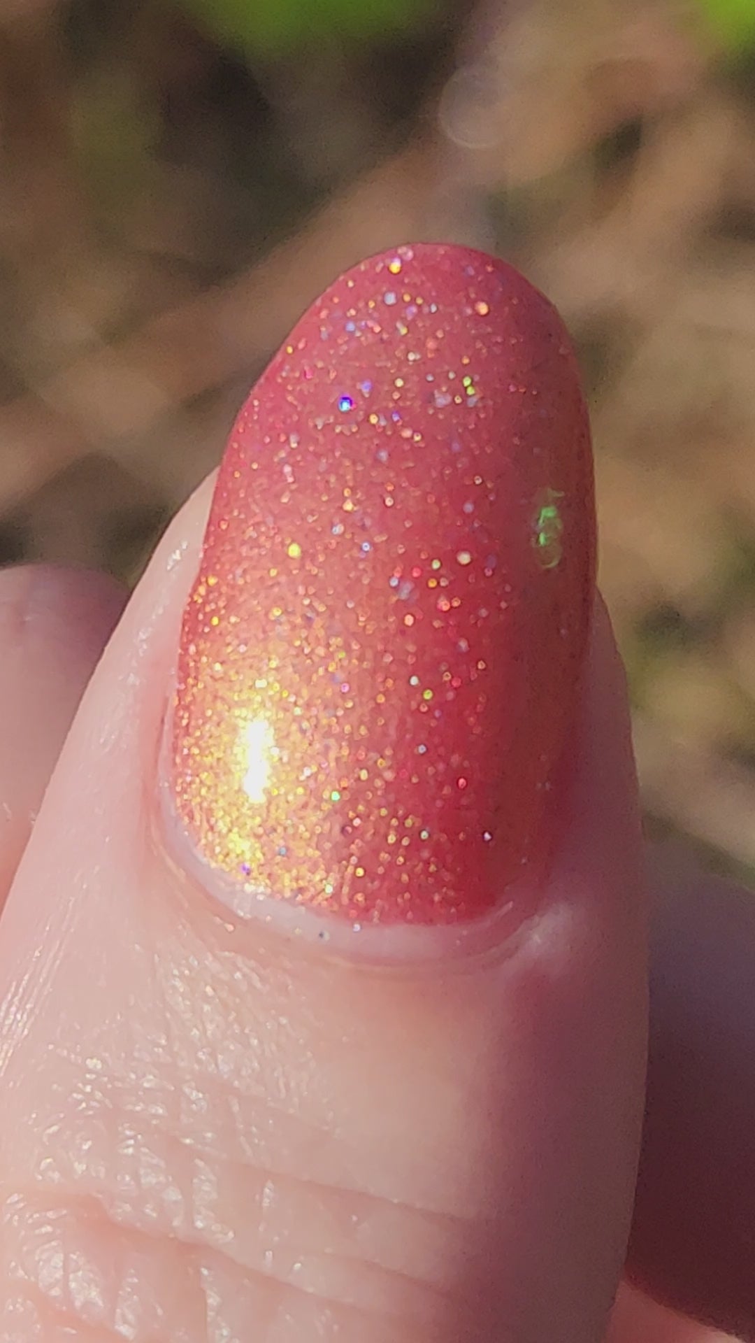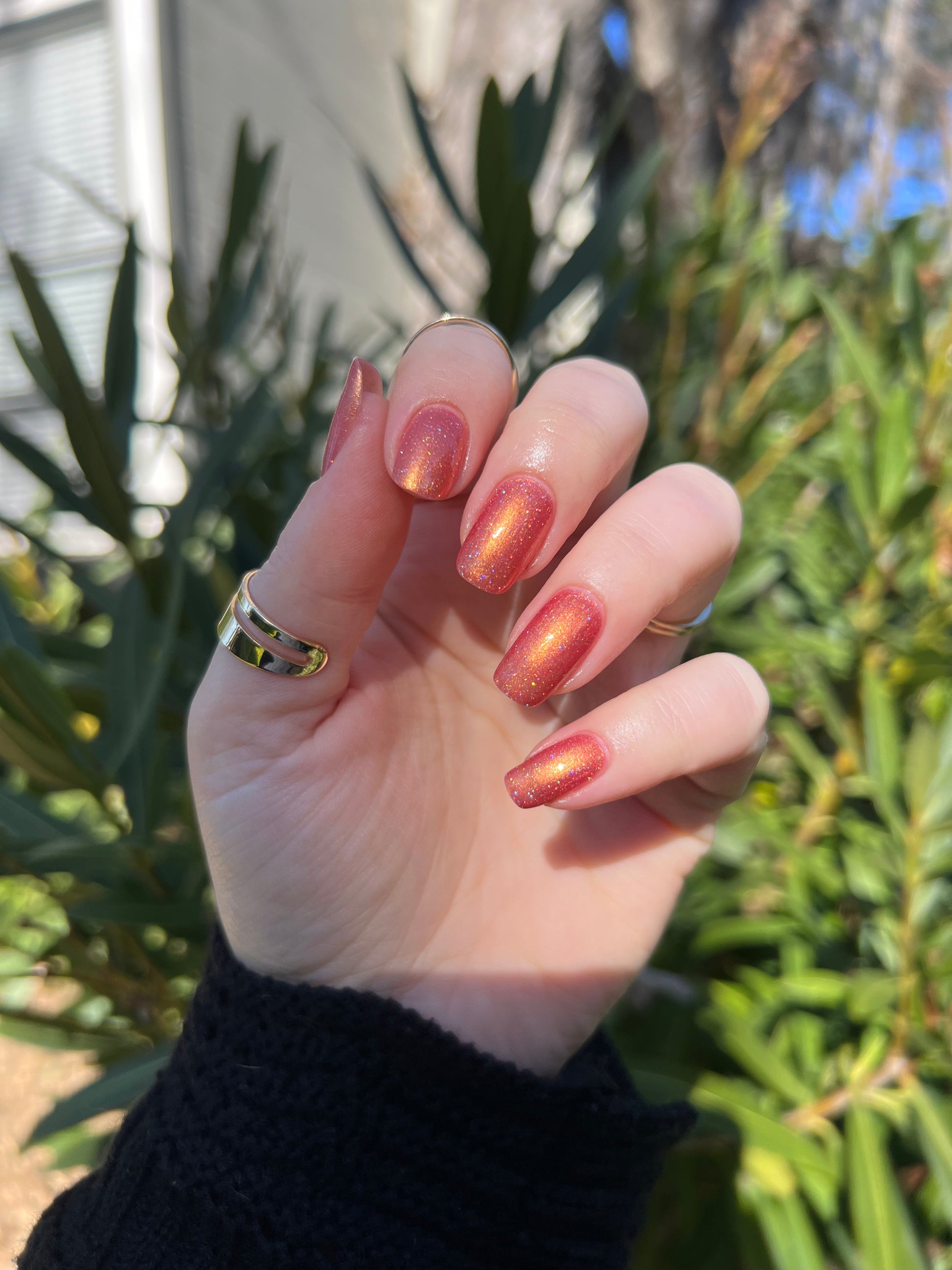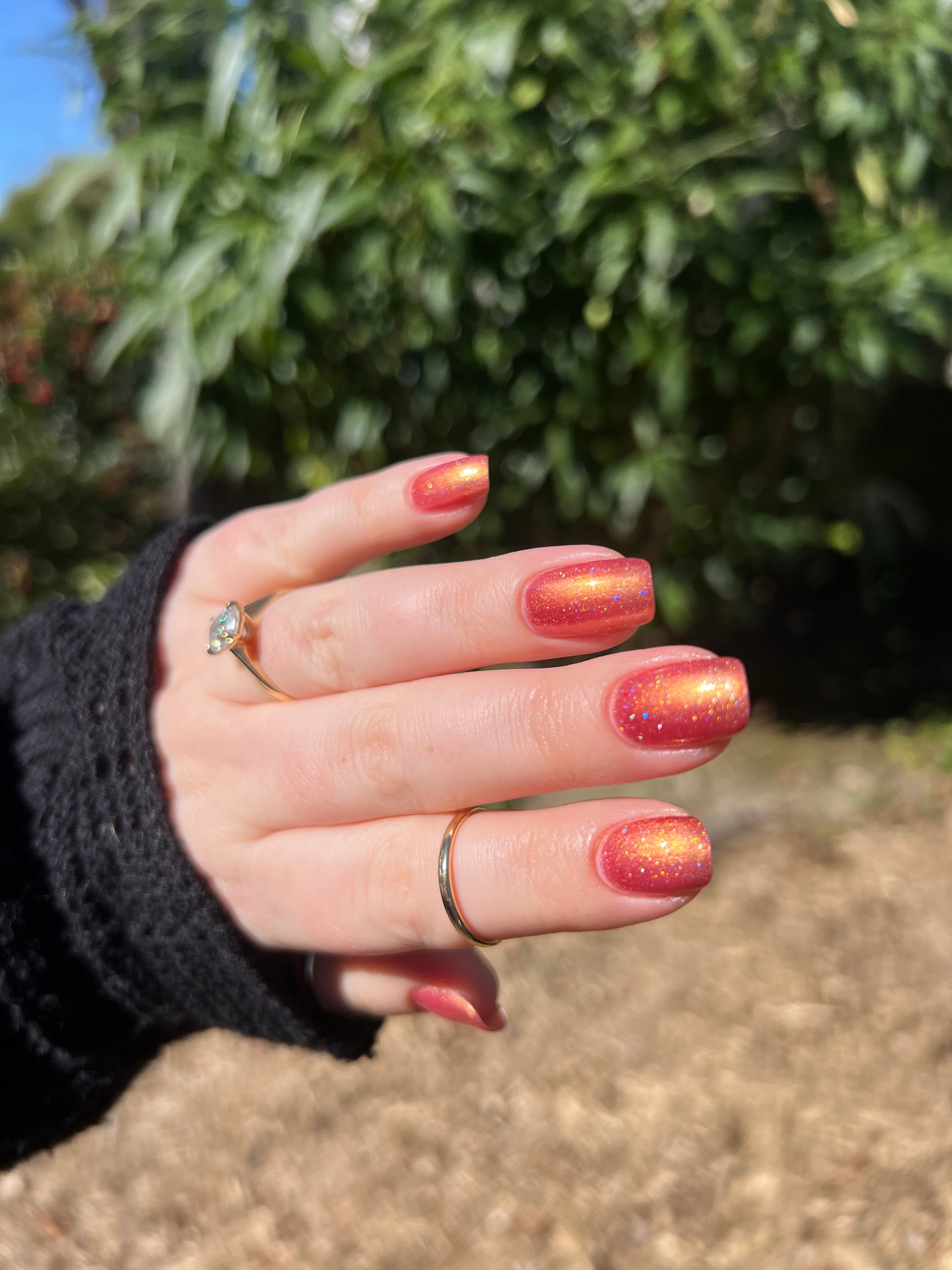 A copper-gold base with gold and rainbow holo and gold light reflective glitter