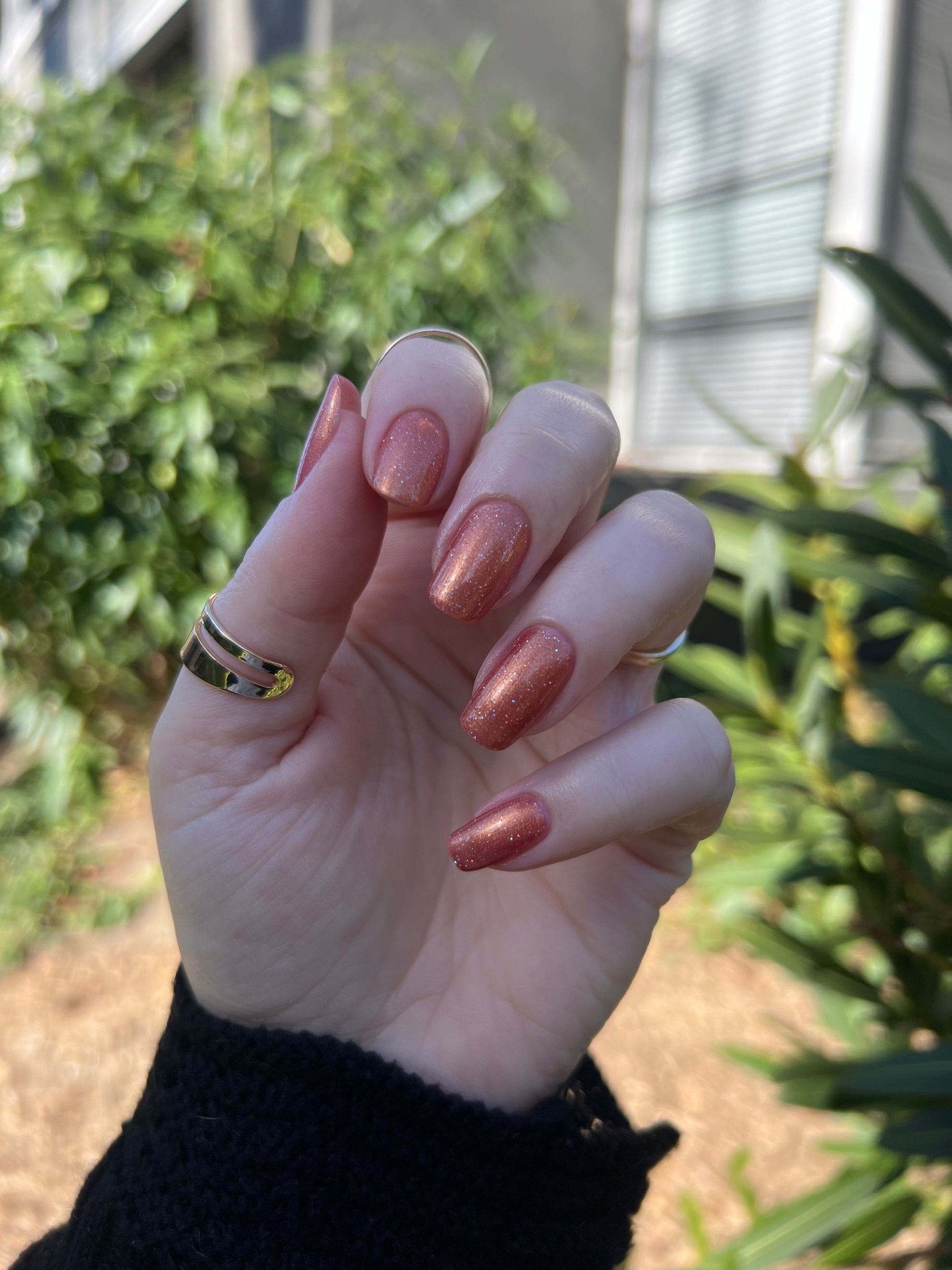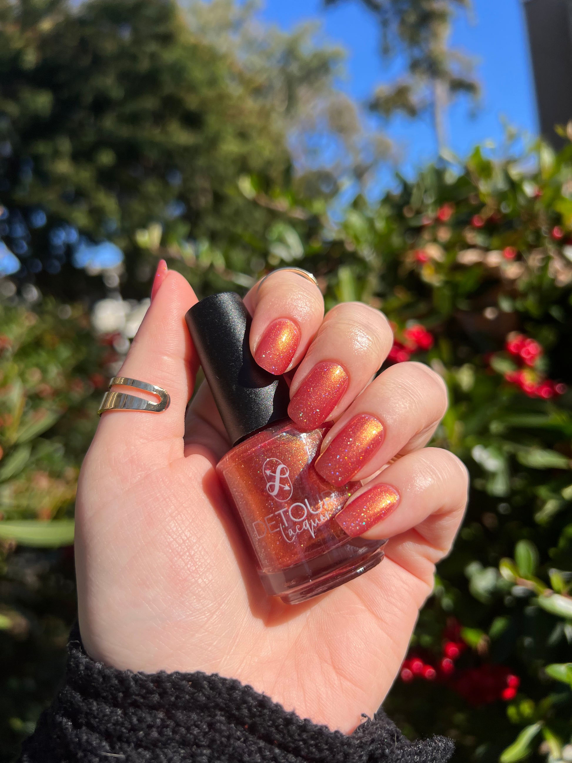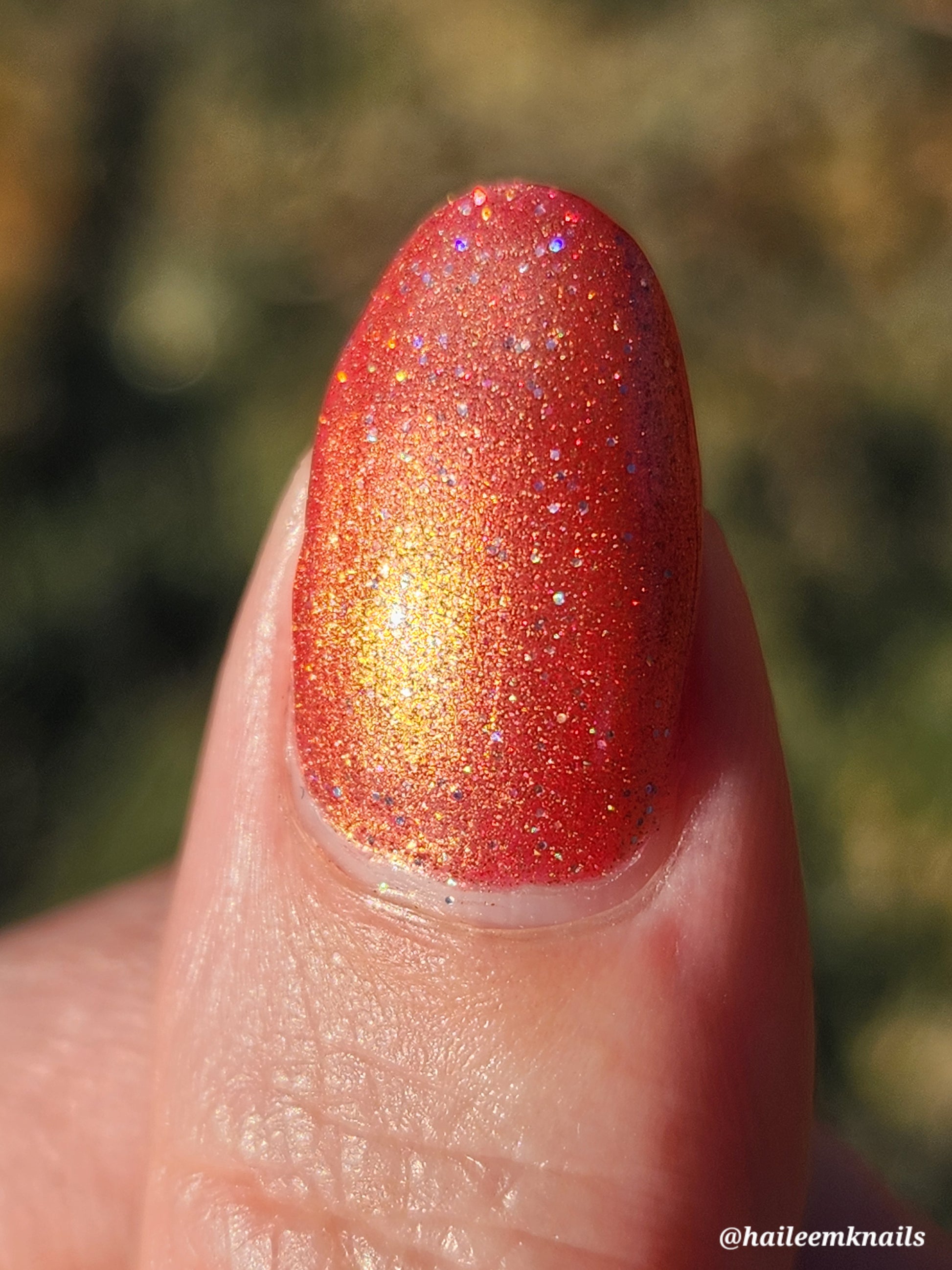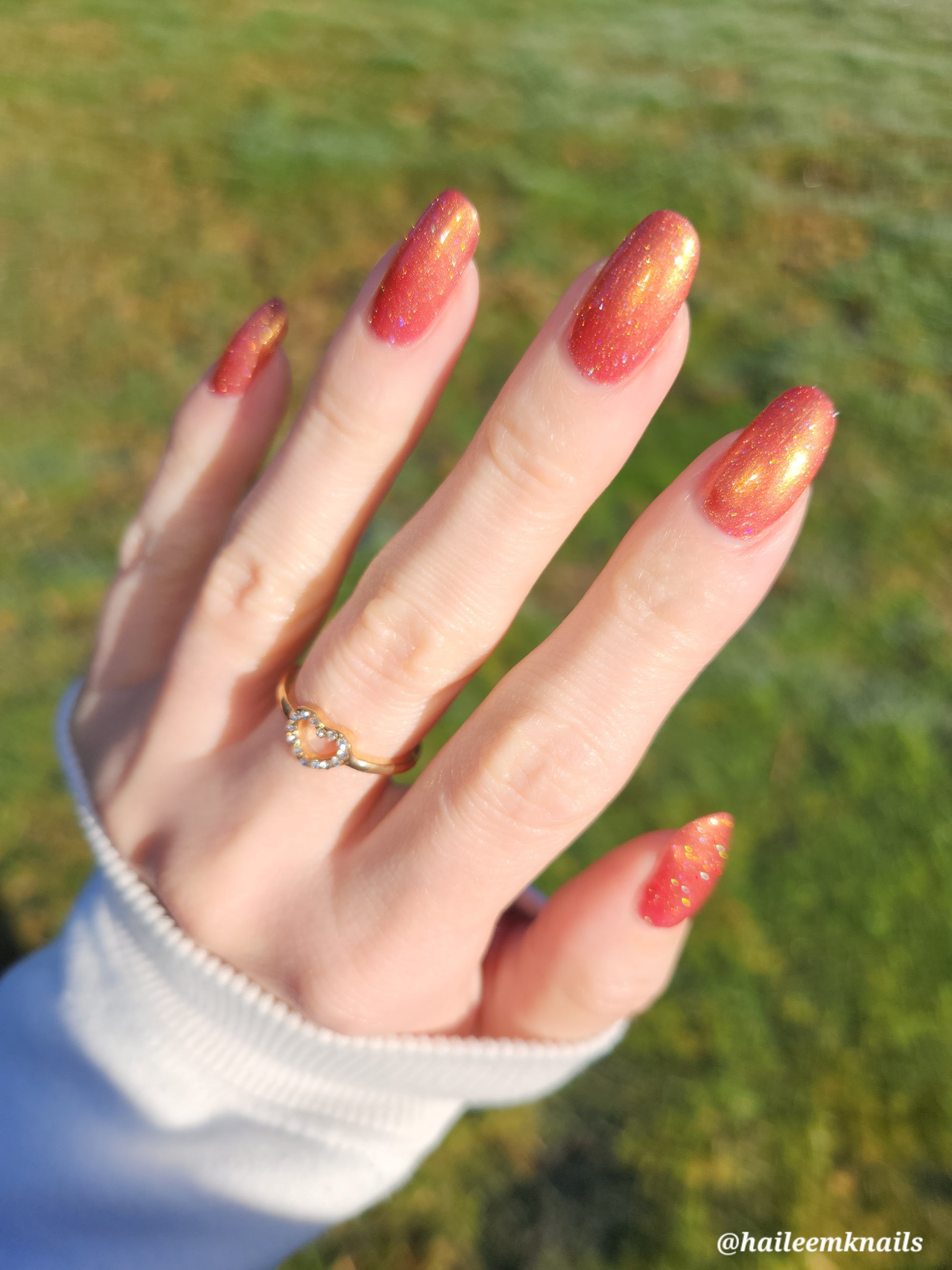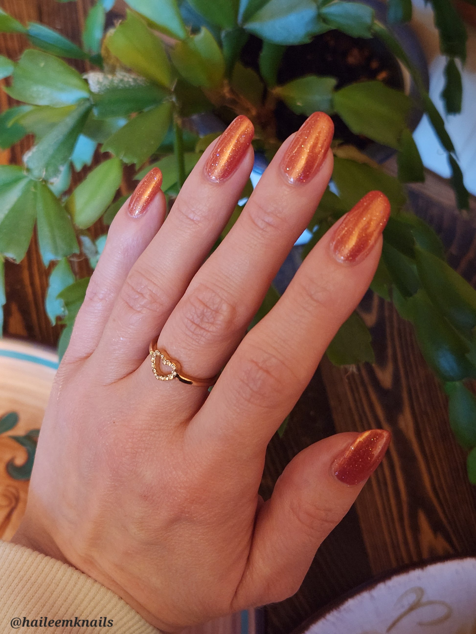 A copper-gold base with gold and rainbow holo and gold light reflective glitter