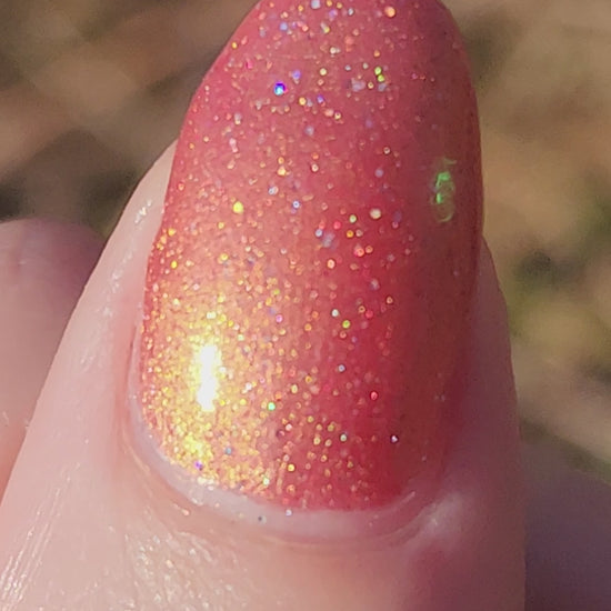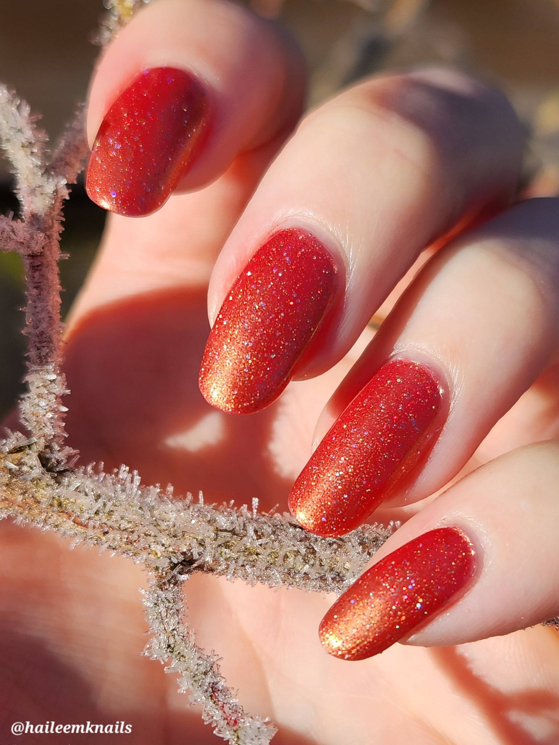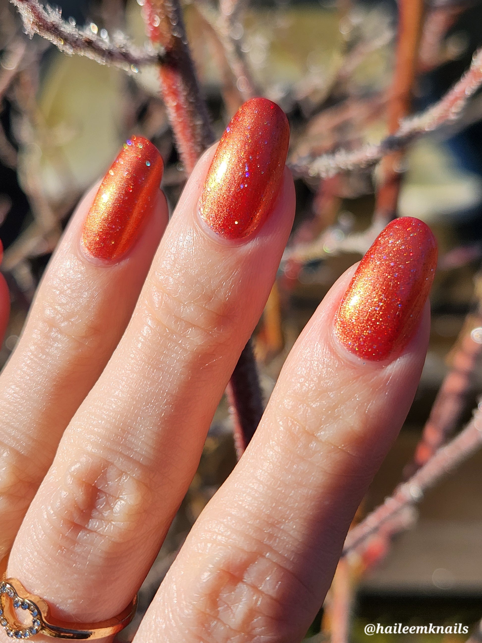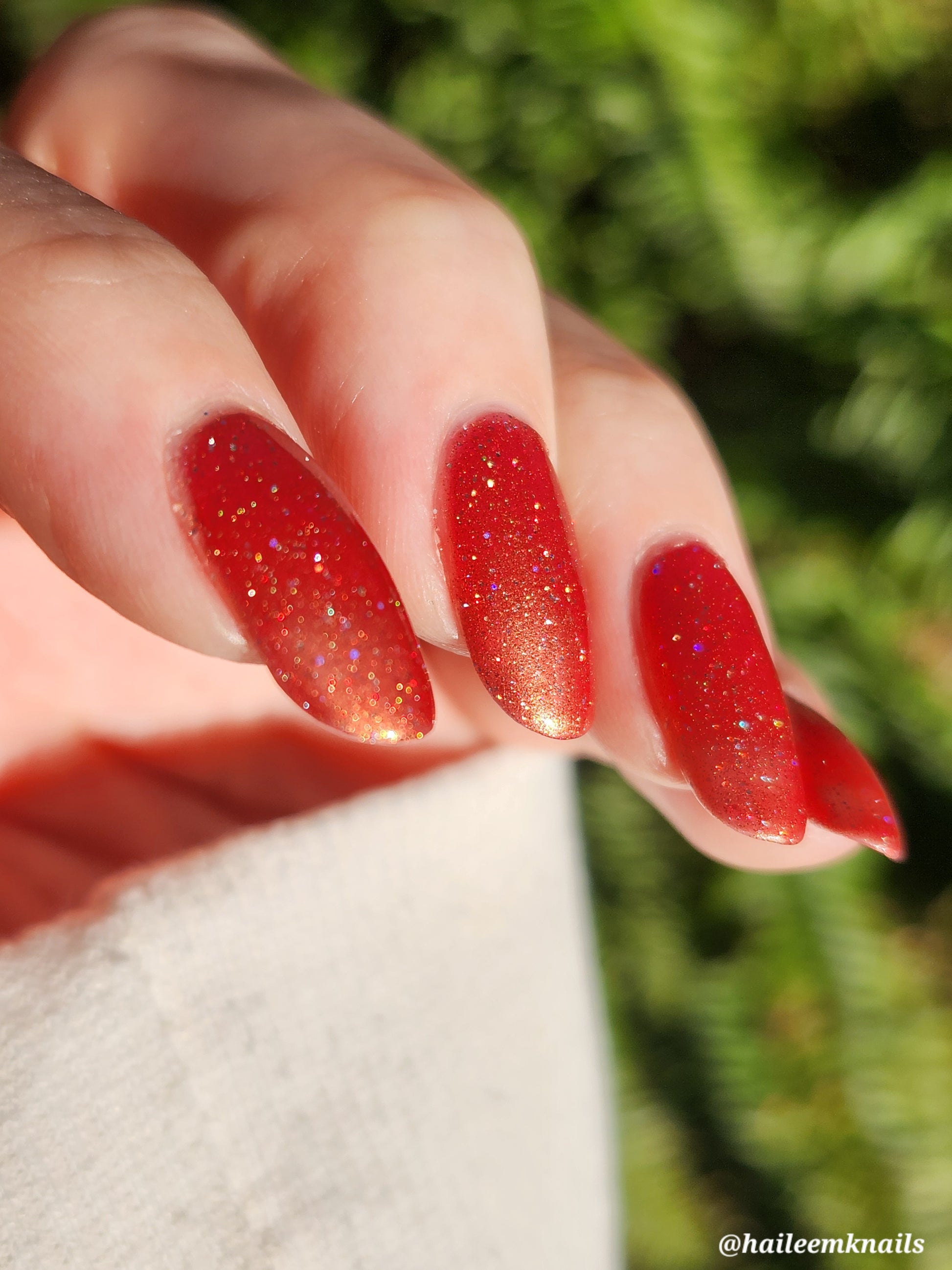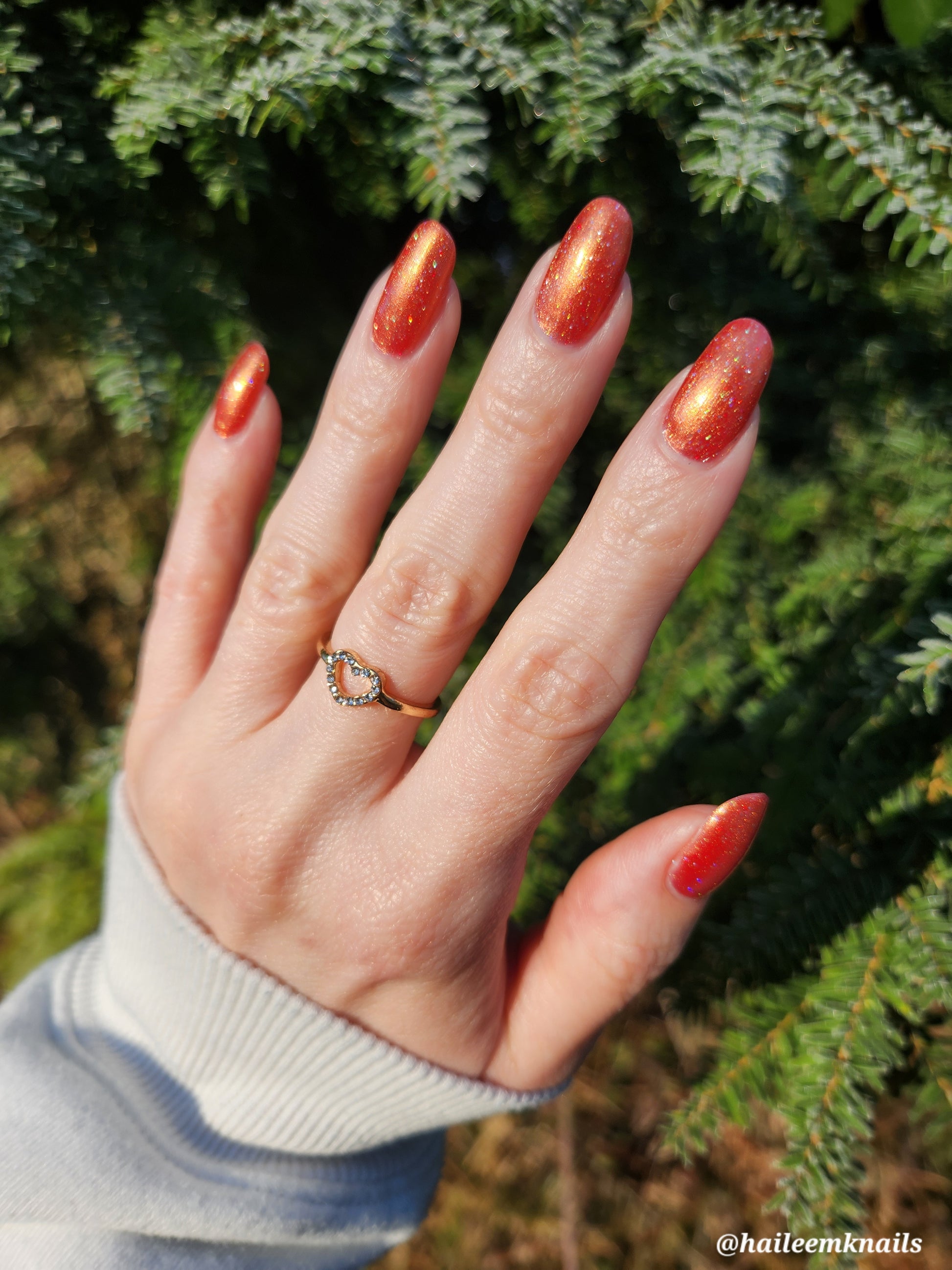 A copper-gold base with gold and rainbow holo and gold light reflective glitter