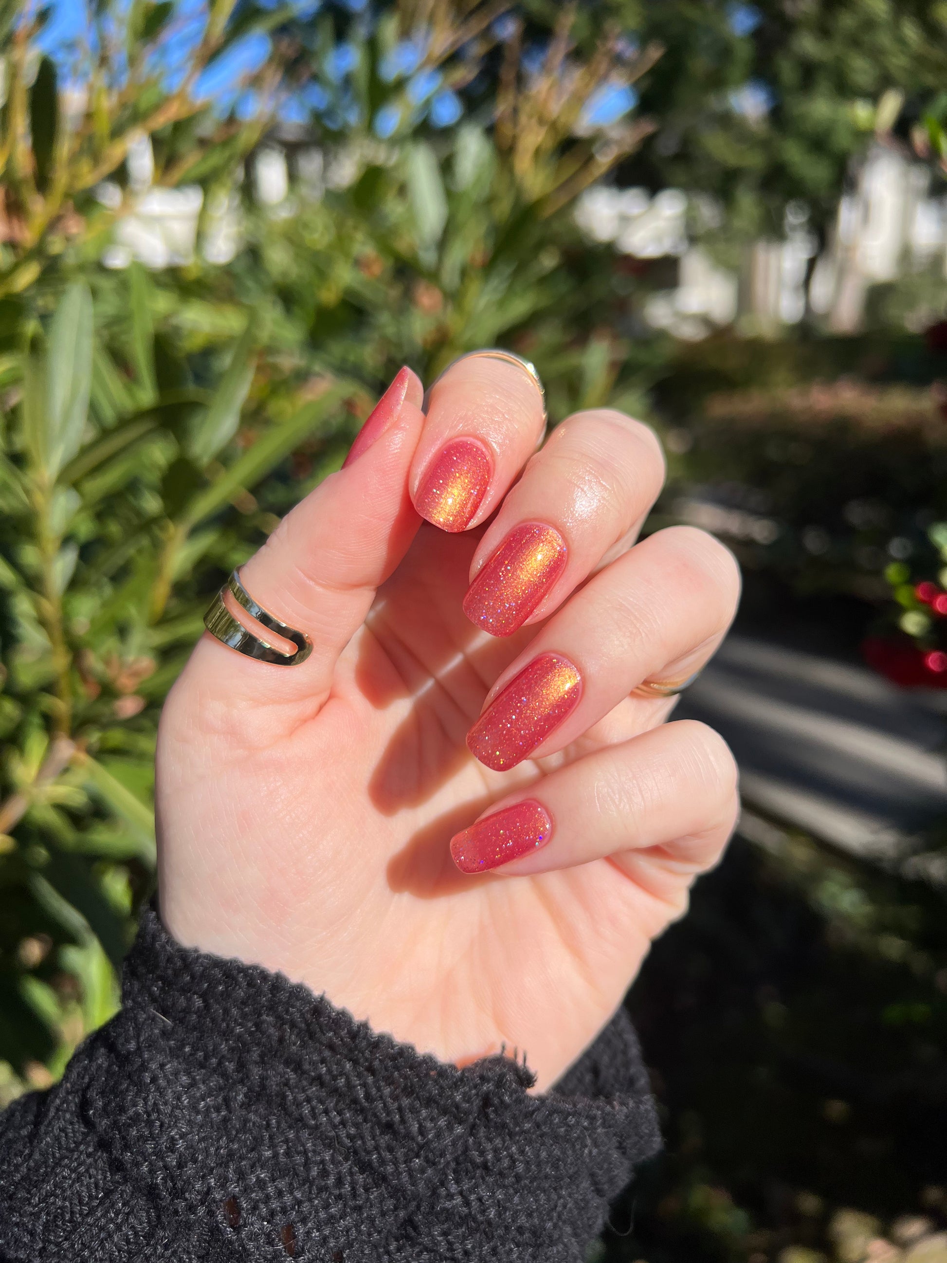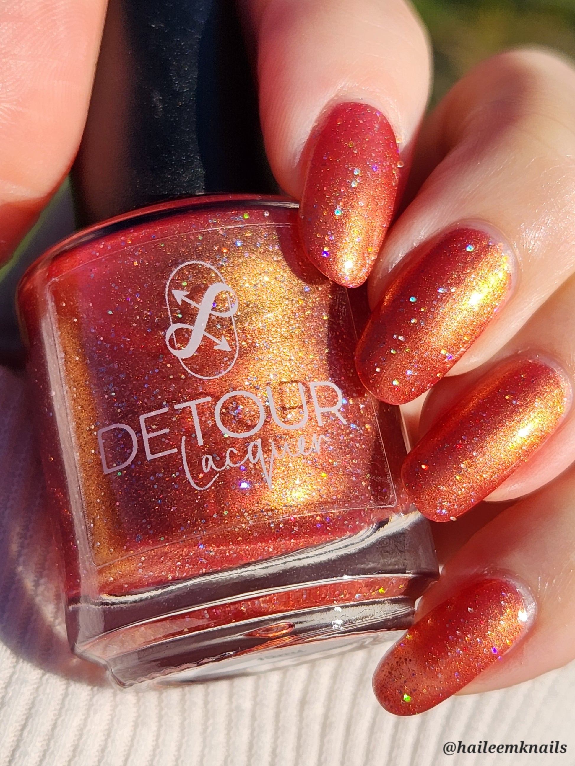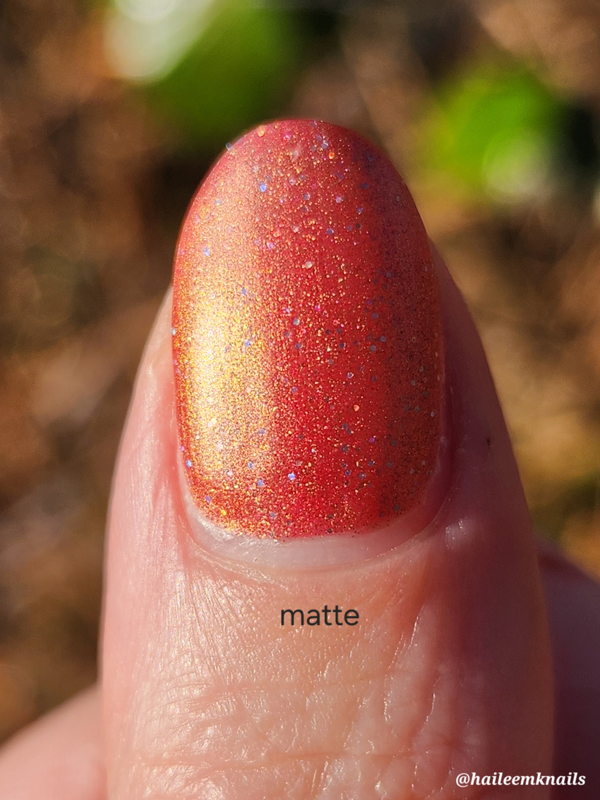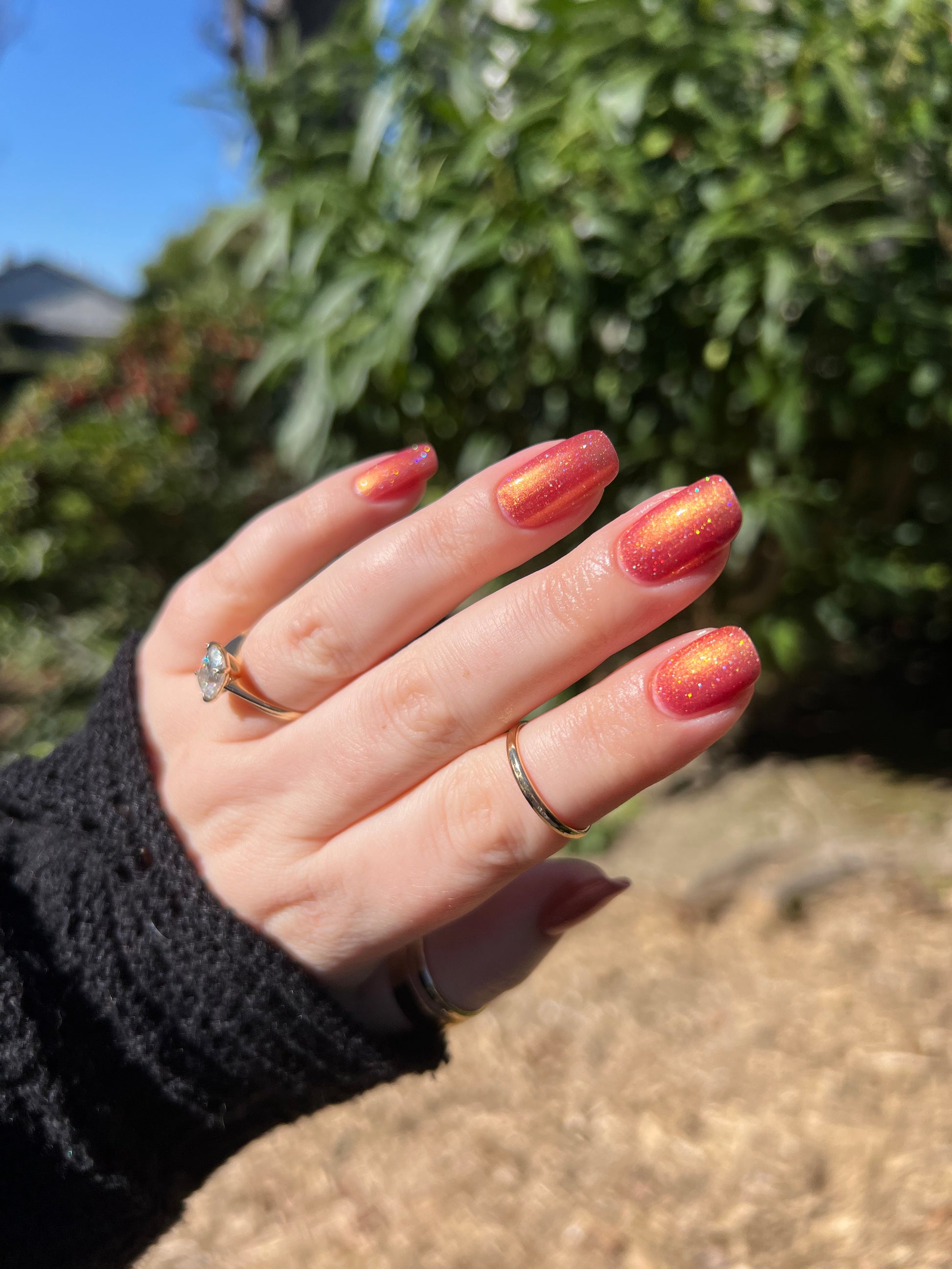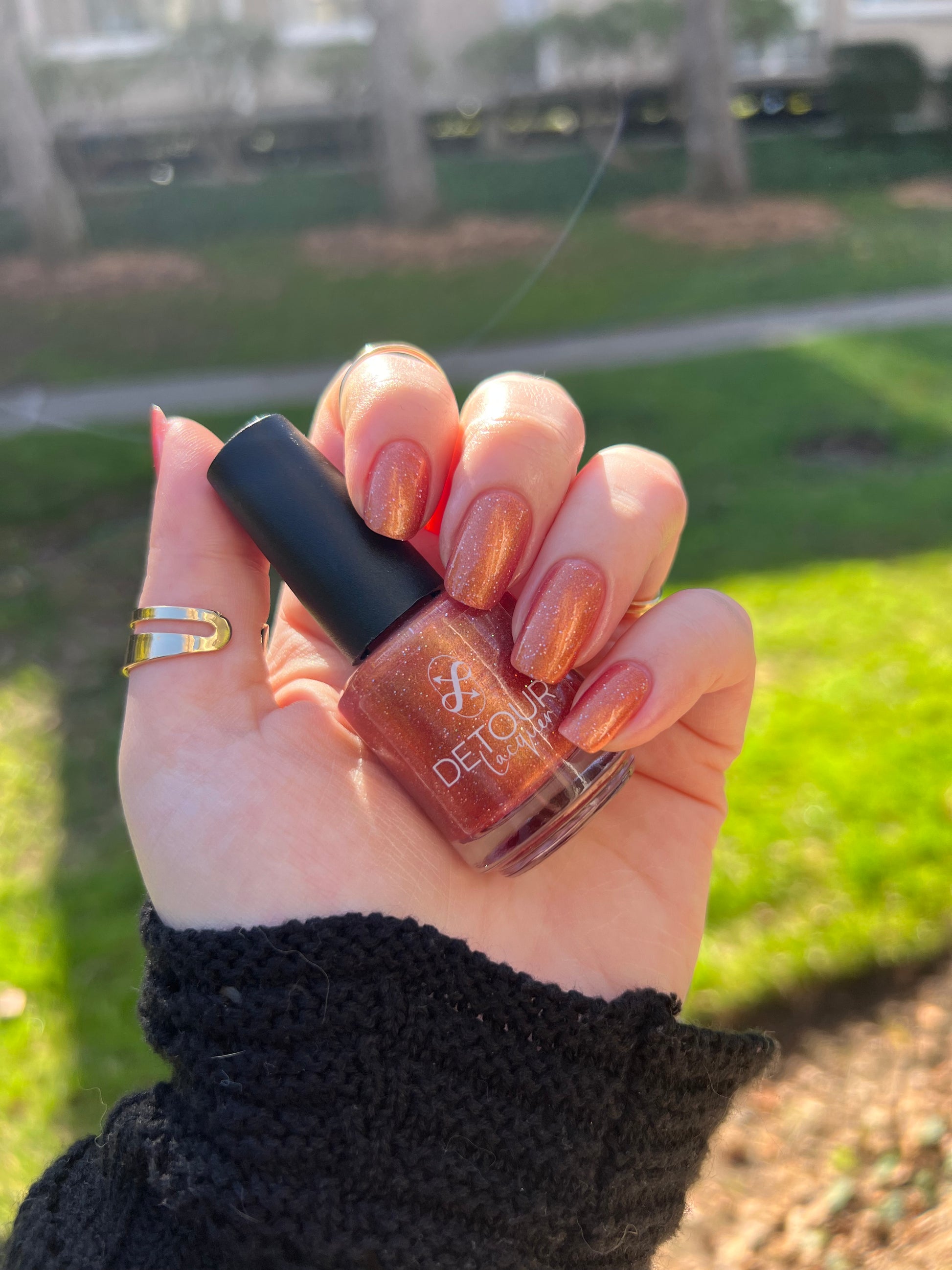 A copper-gold base with gold and rainbow holo and gold light reflective glitter