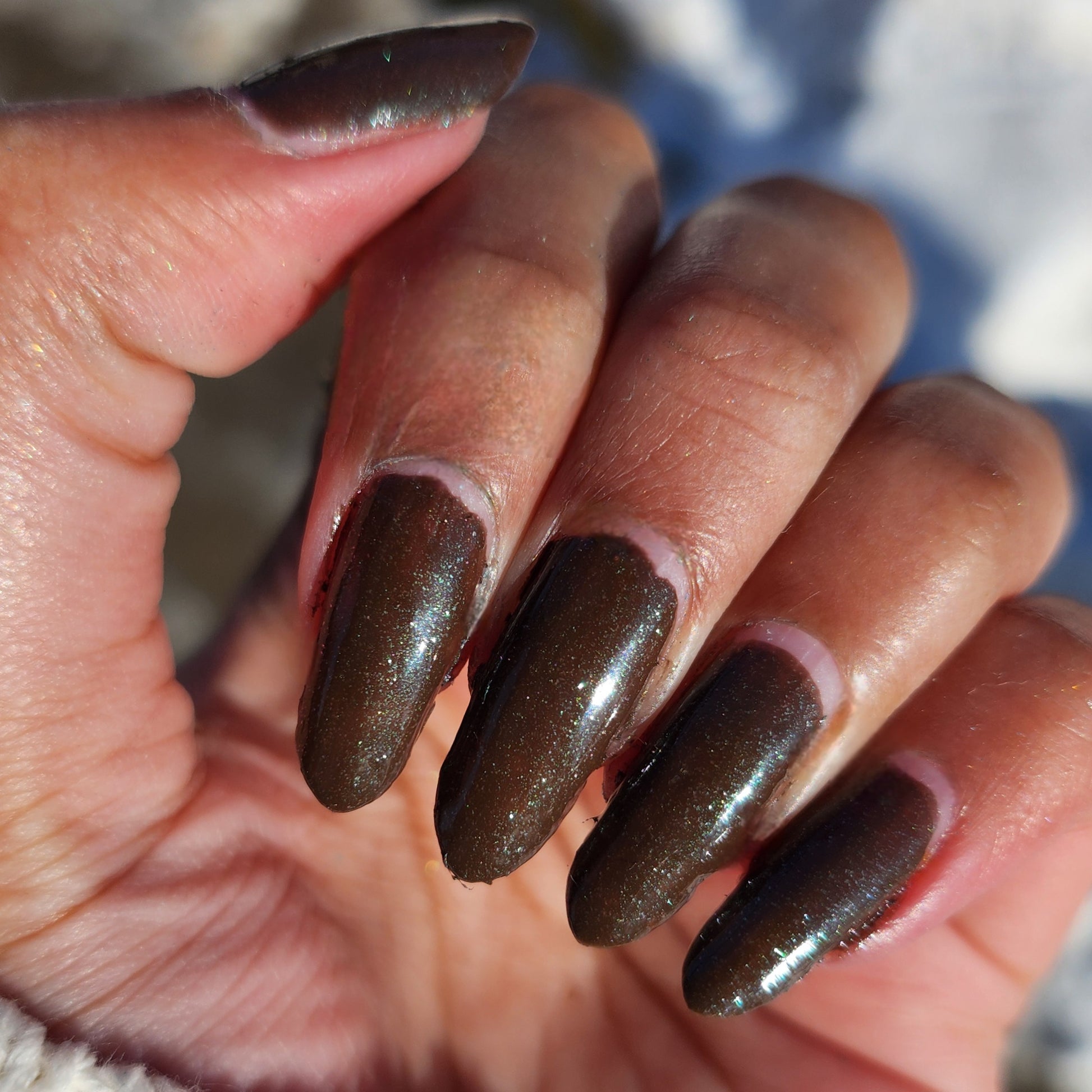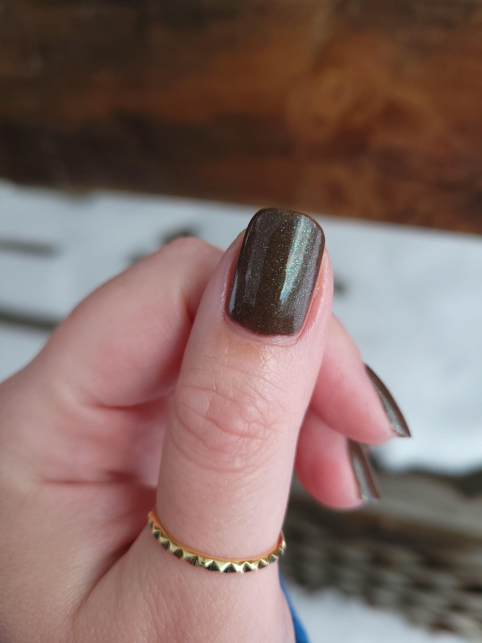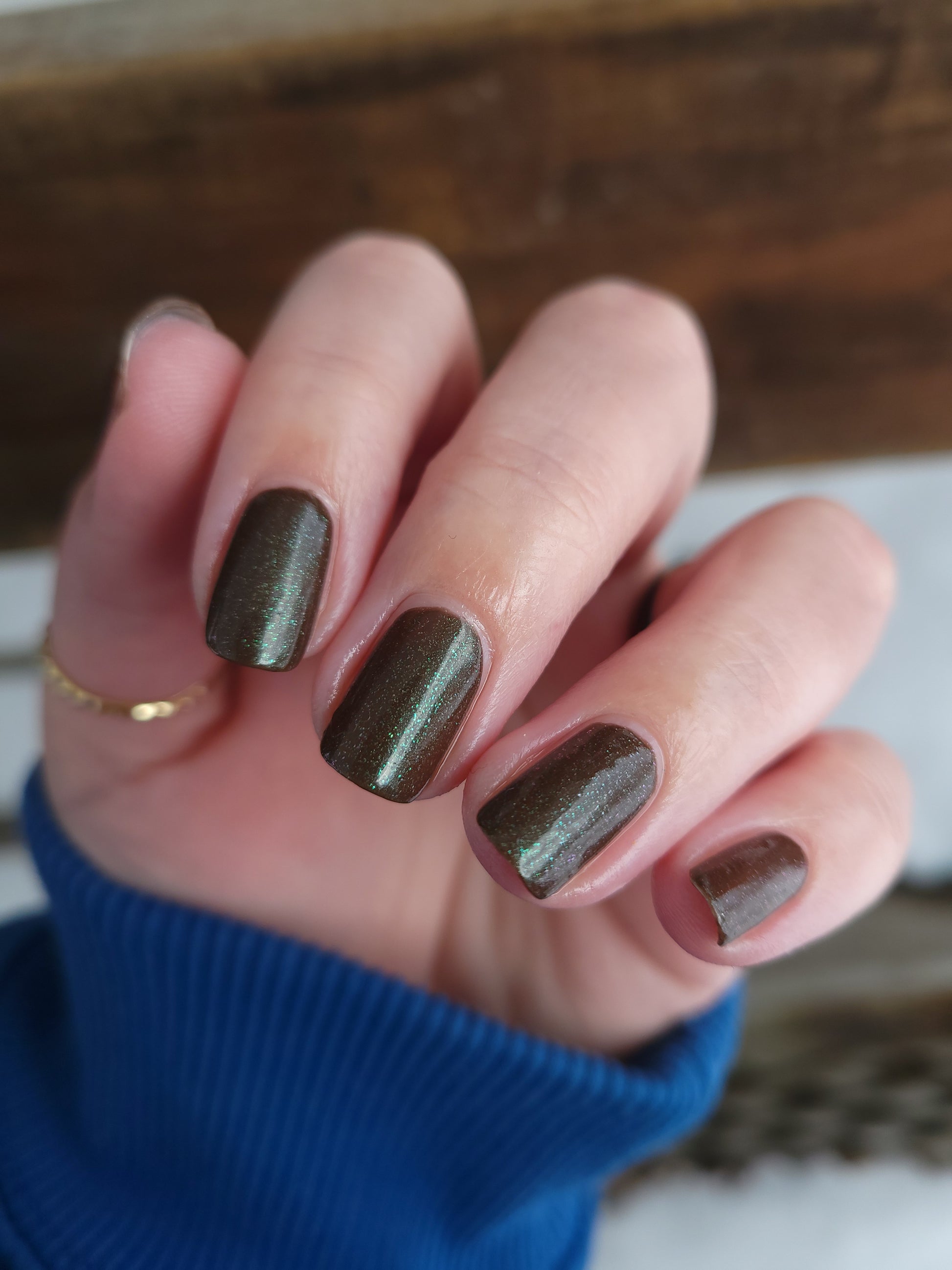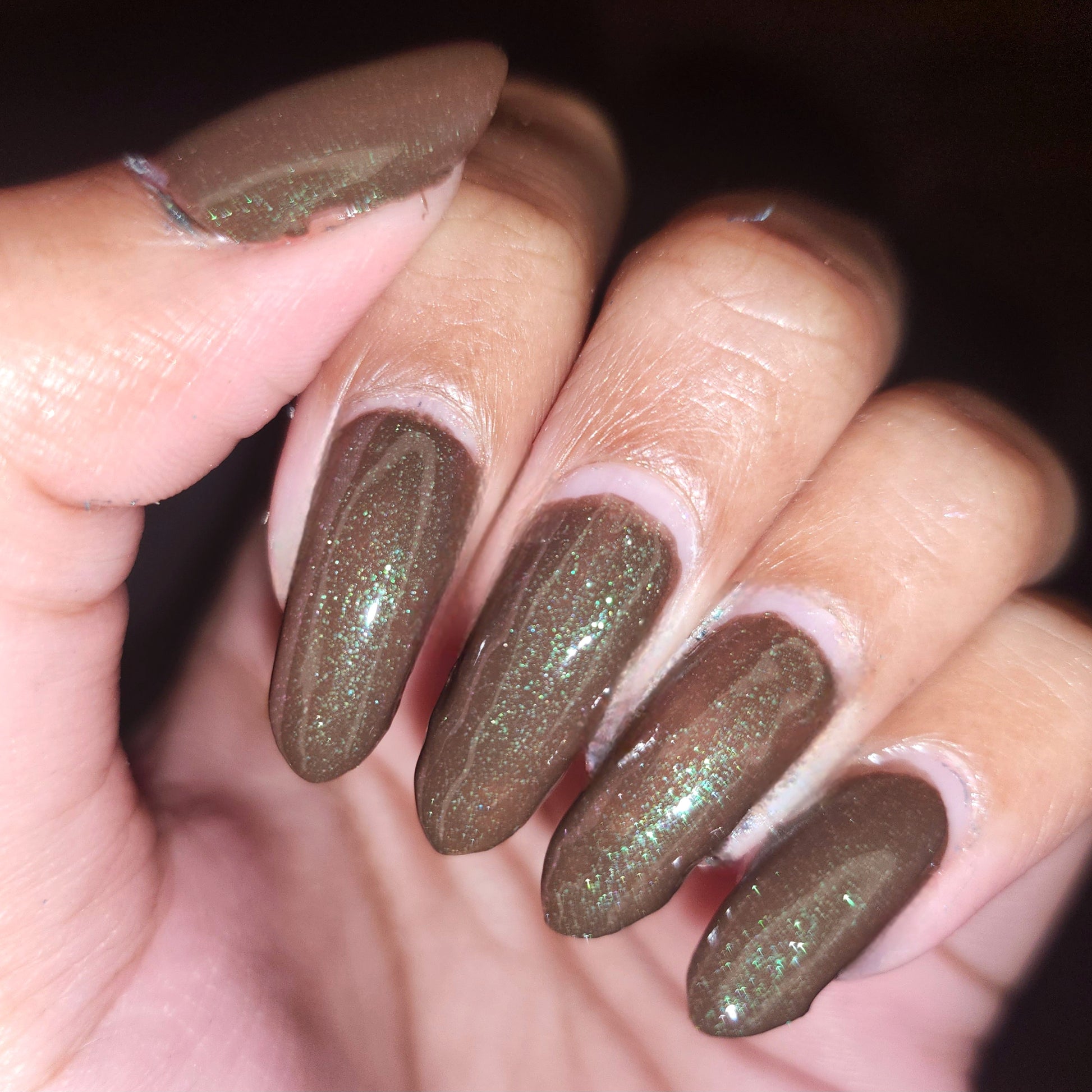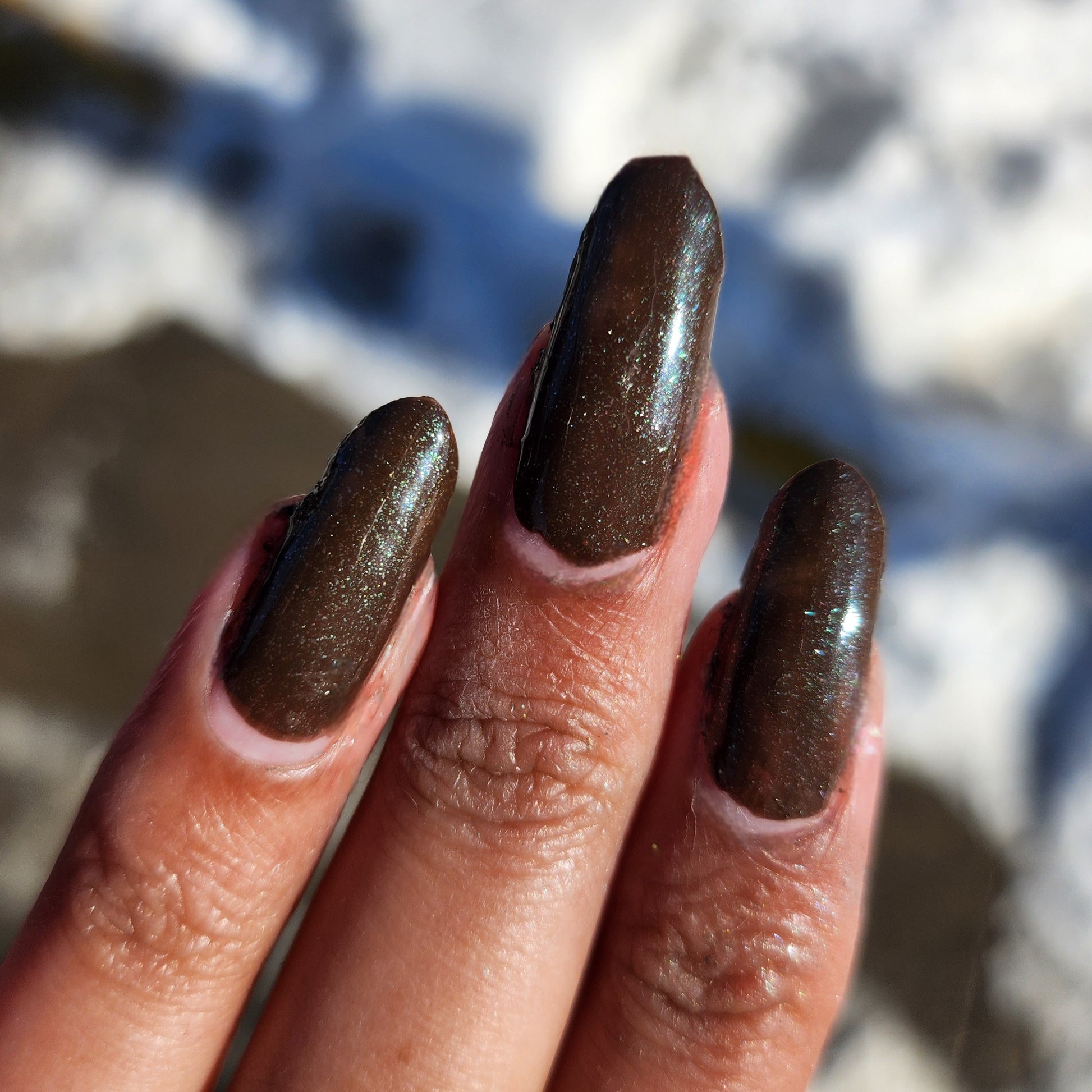 Chocolate Driftwood is a delectable chocolate brown polish with green shimmer and holo. The rich, earthy brown and soft suggestions of seaweed will take you away to a day at the beach.