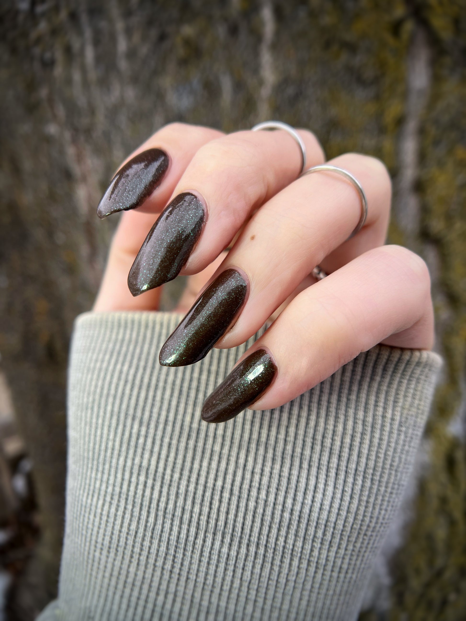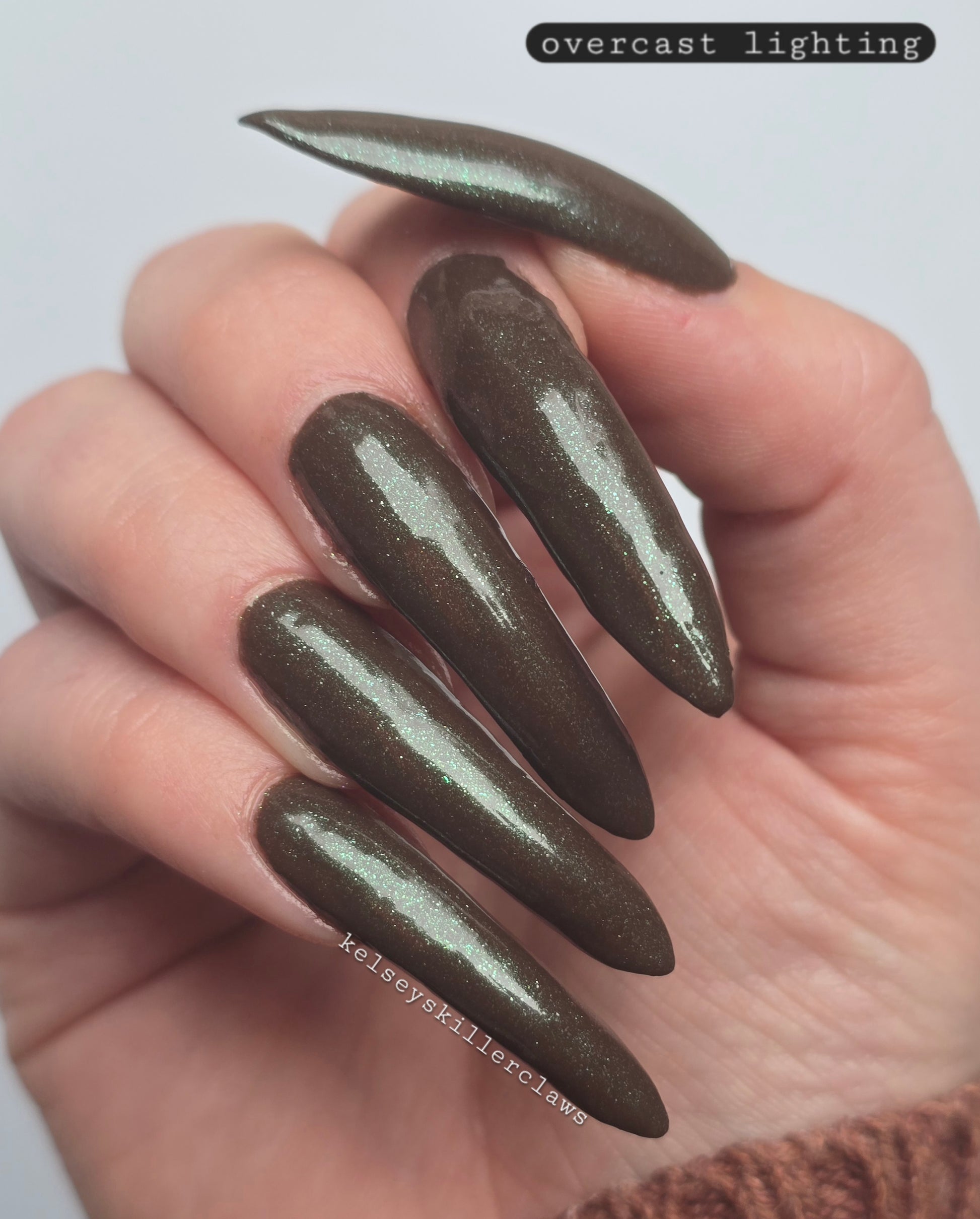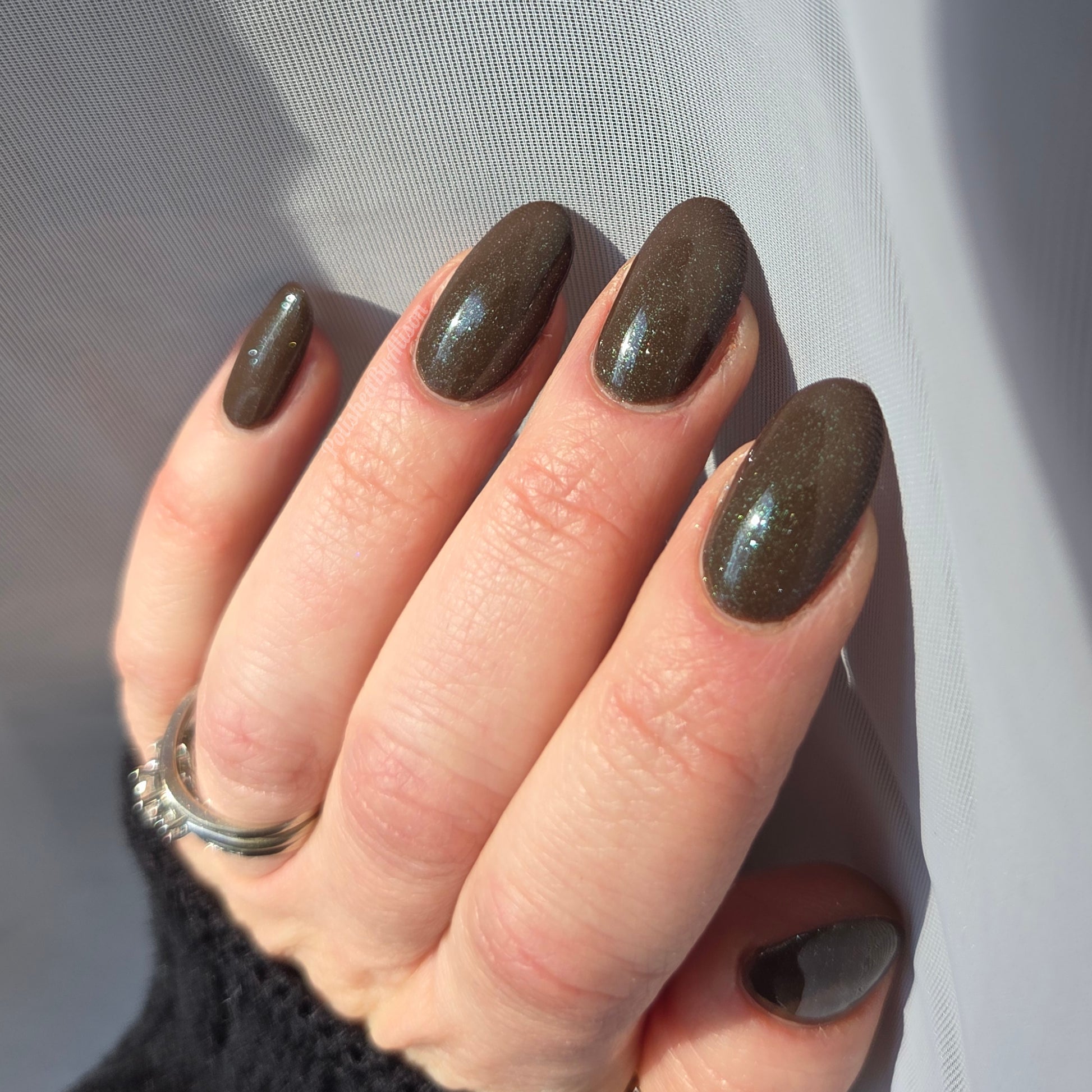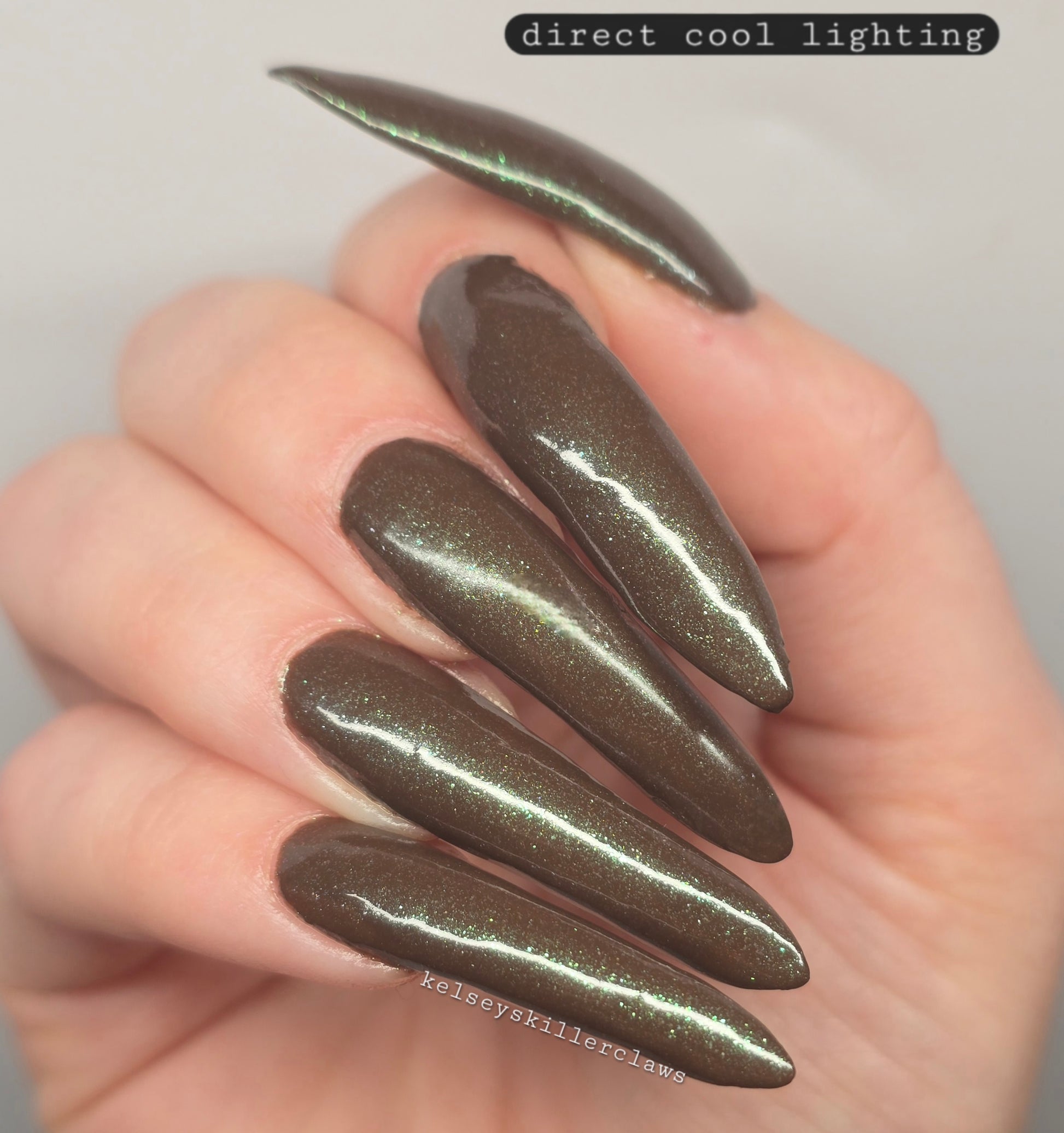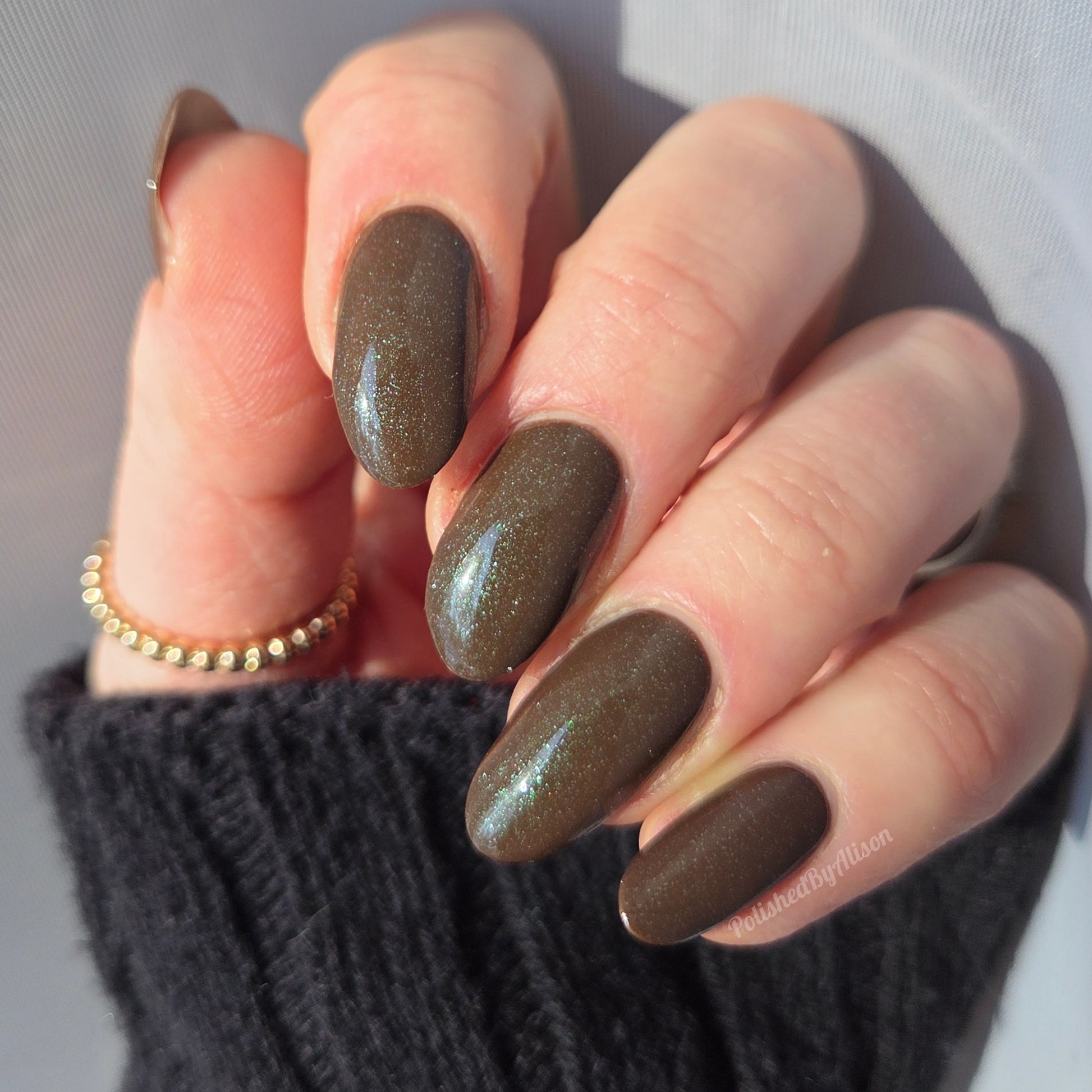 Chocolate Driftwood is a delectable chocolate brown polish with green shimmer and holo. The rich, earthy brown and soft suggestions of seaweed will take you away to a day at the beach.