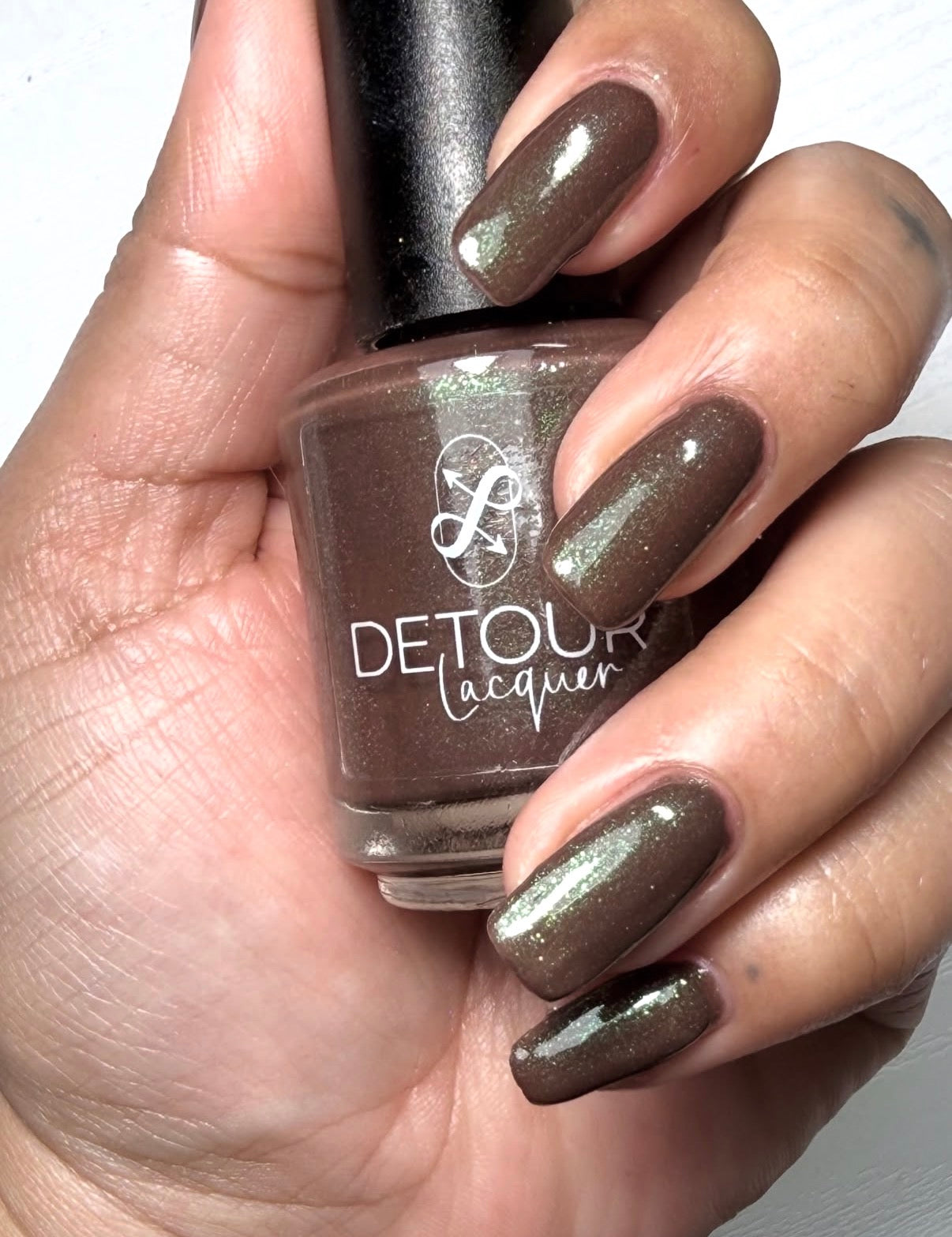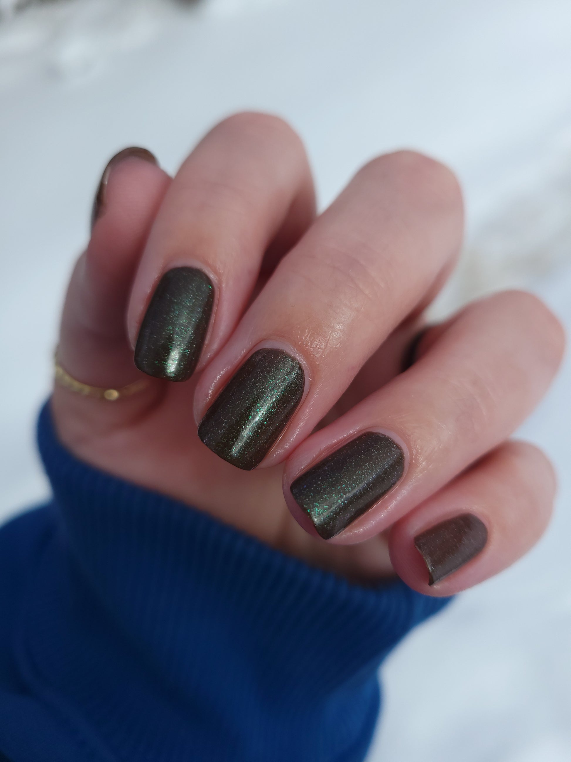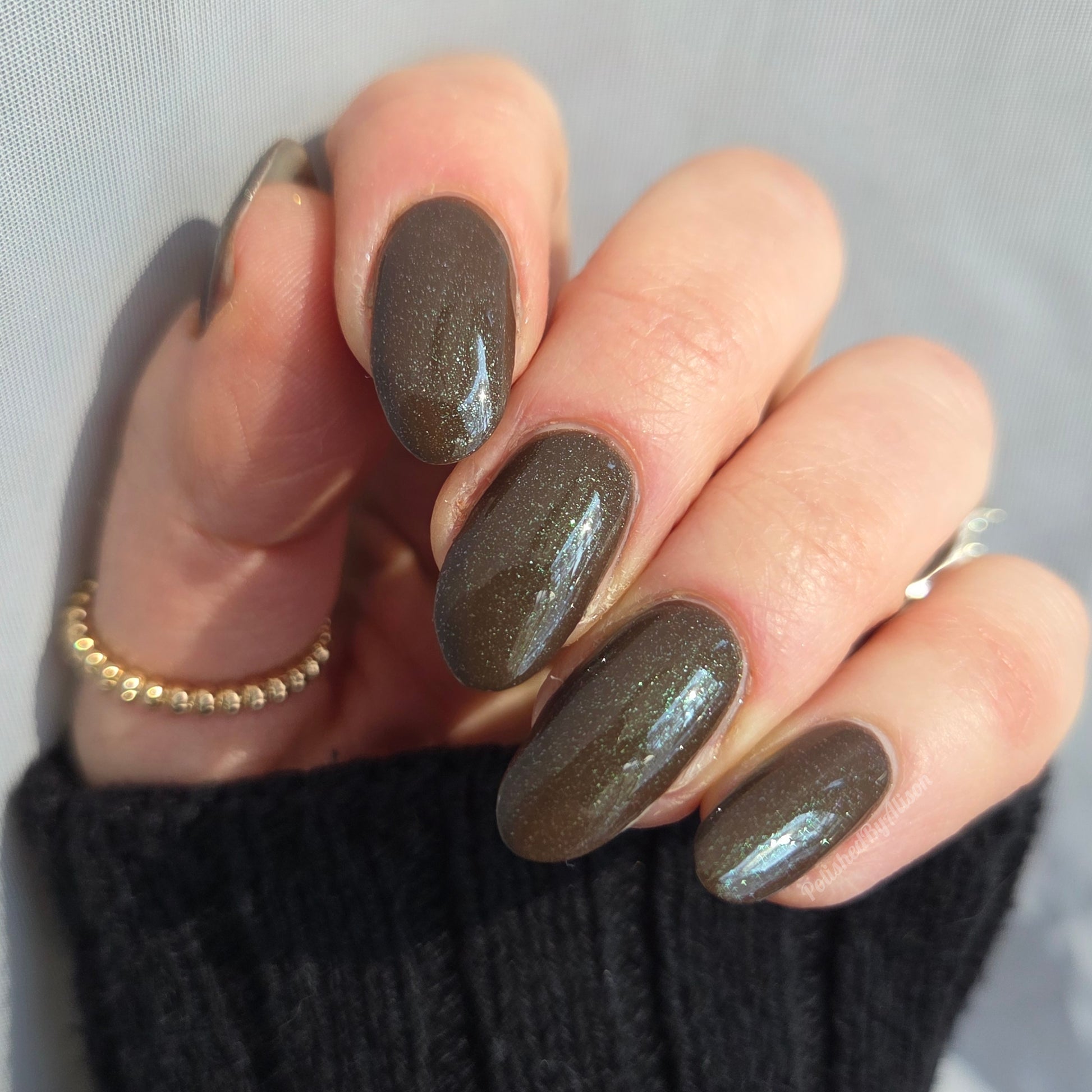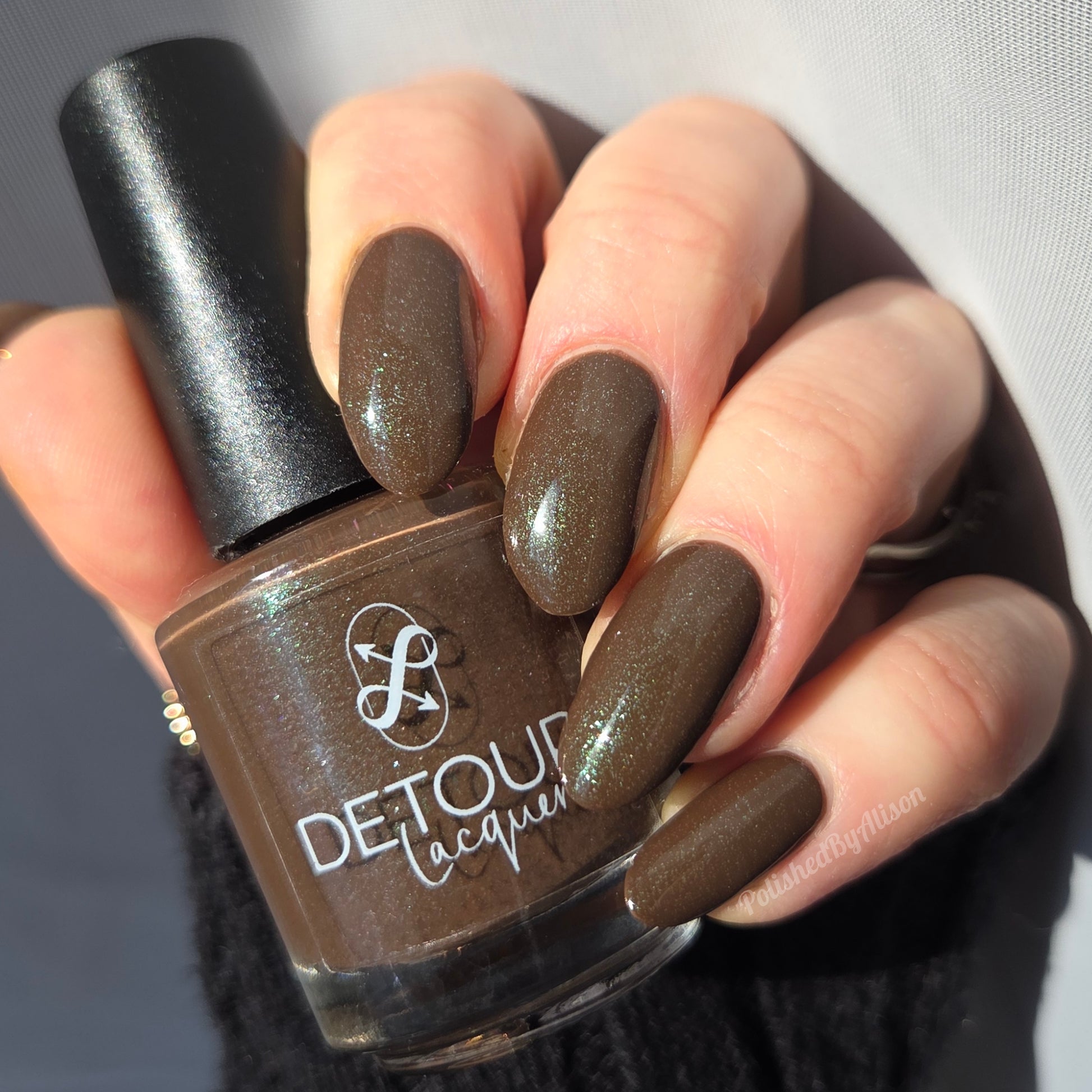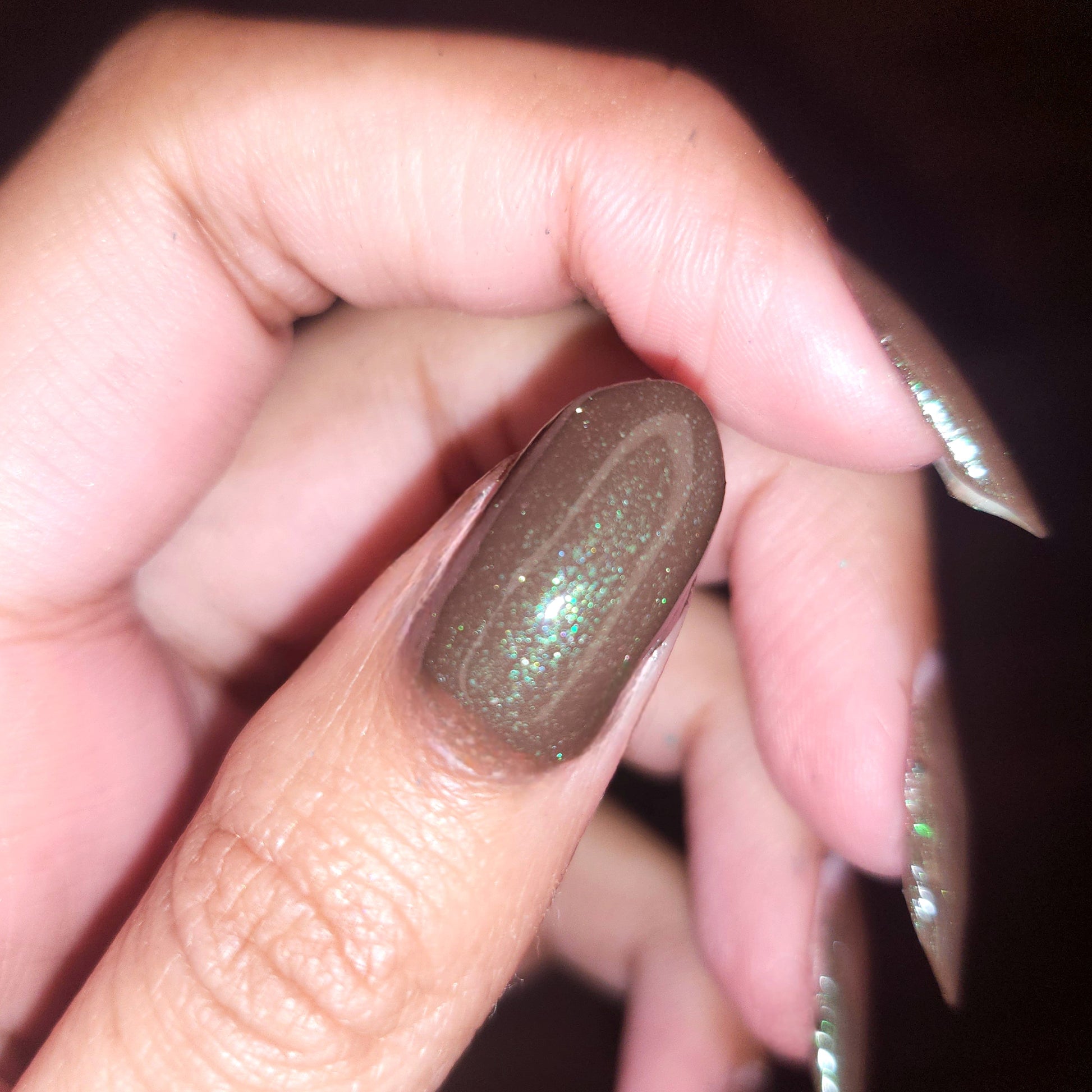 Chocolate Driftwood is a delectable chocolate brown polish with green shimmer and holo. The rich, earthy brown and soft suggestions of seaweed will take you away to a day at the beach.
