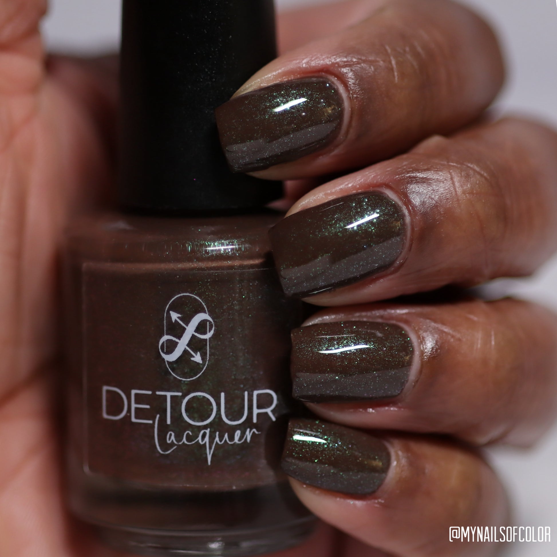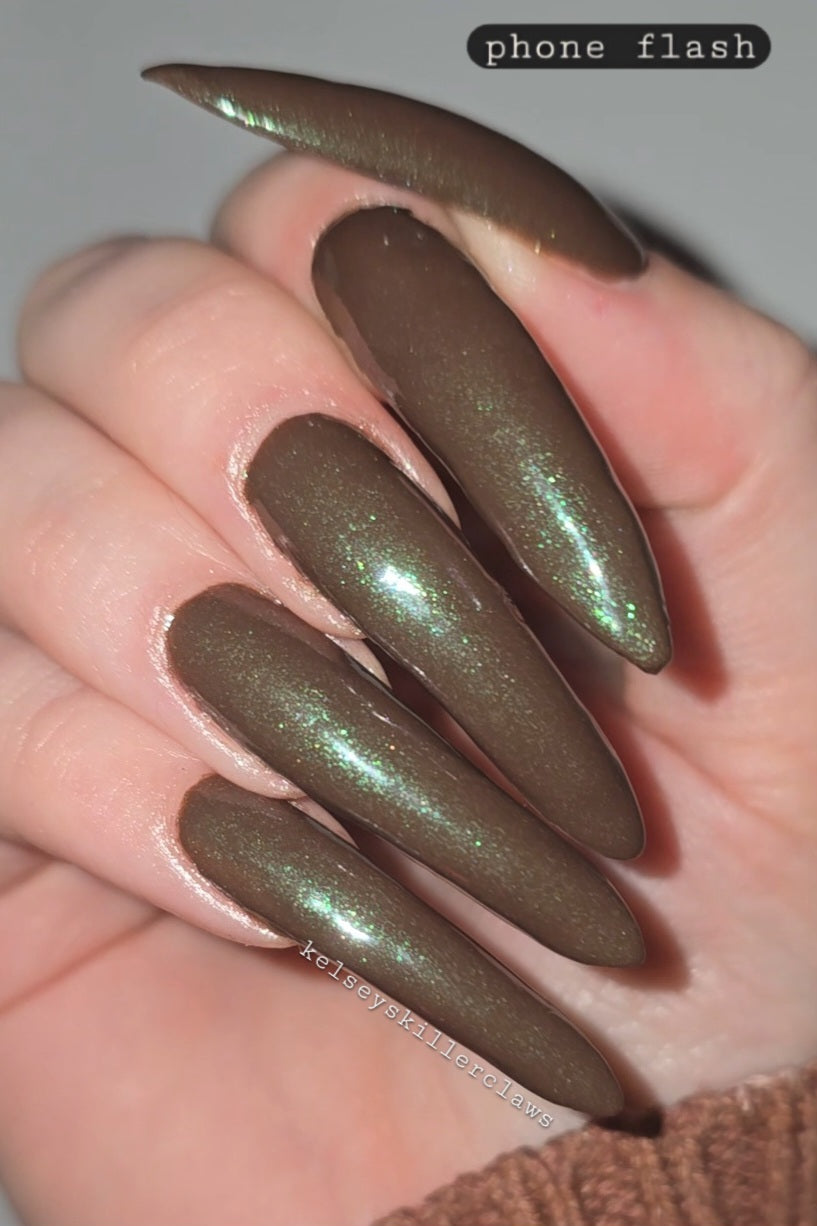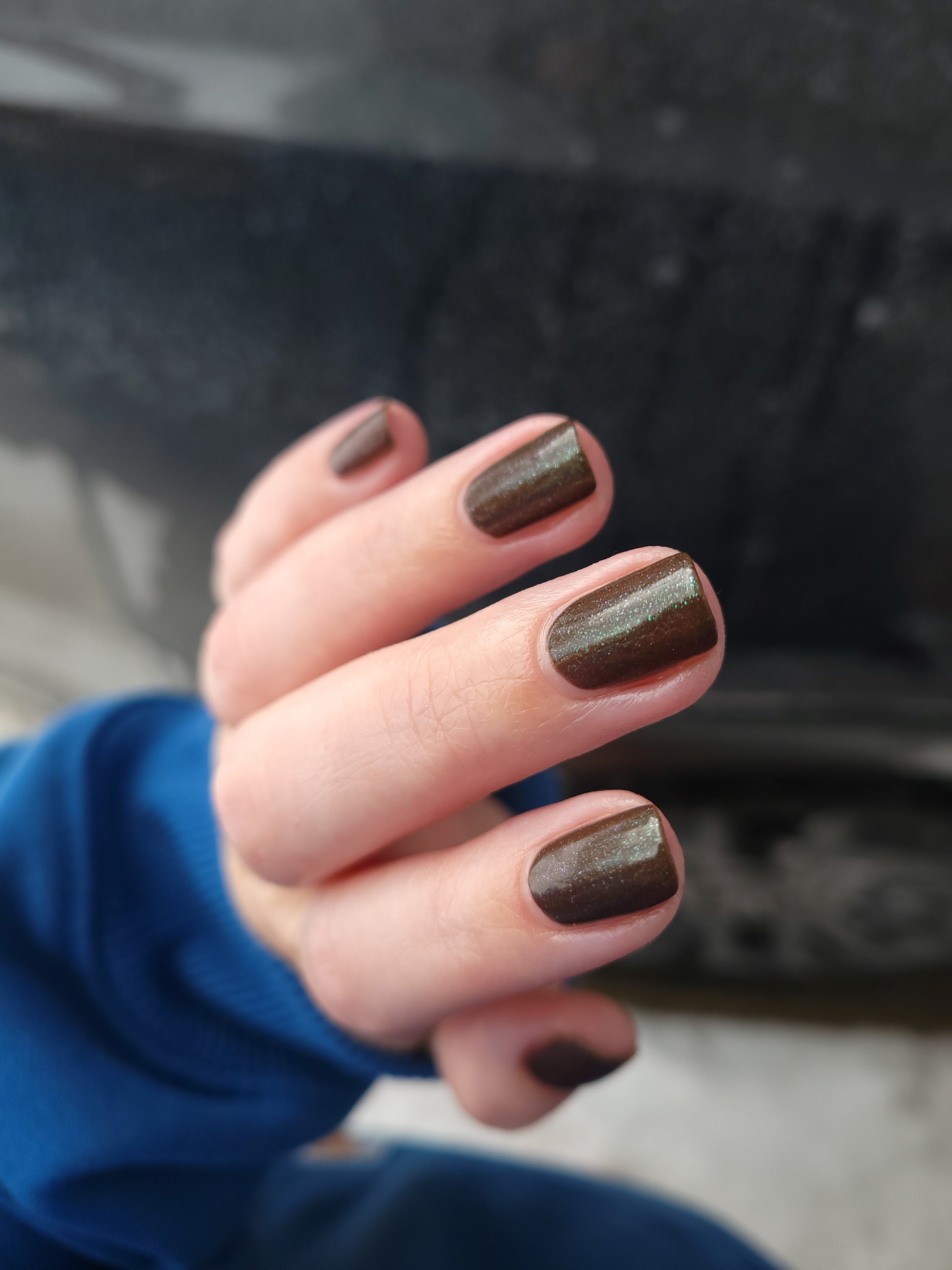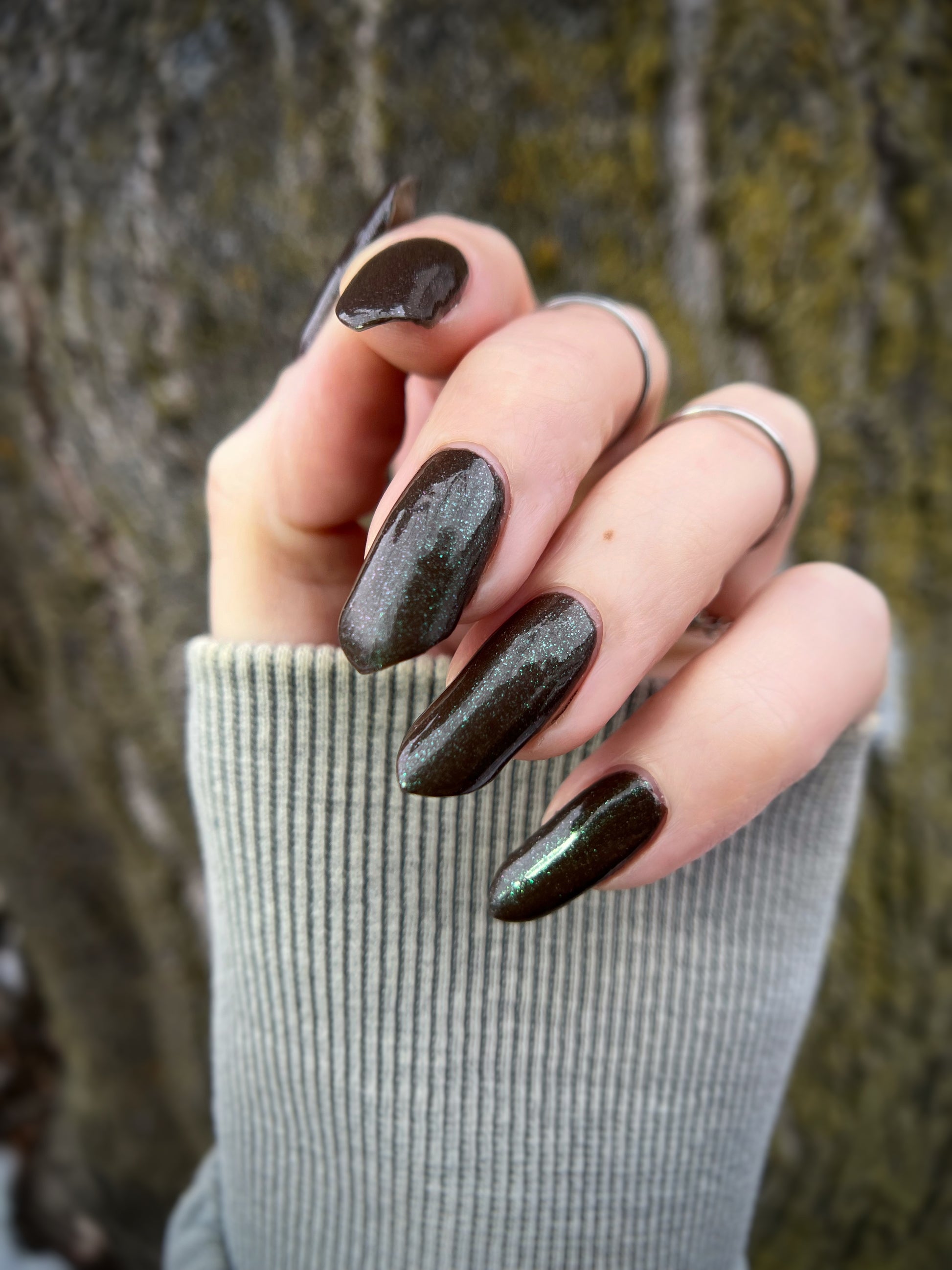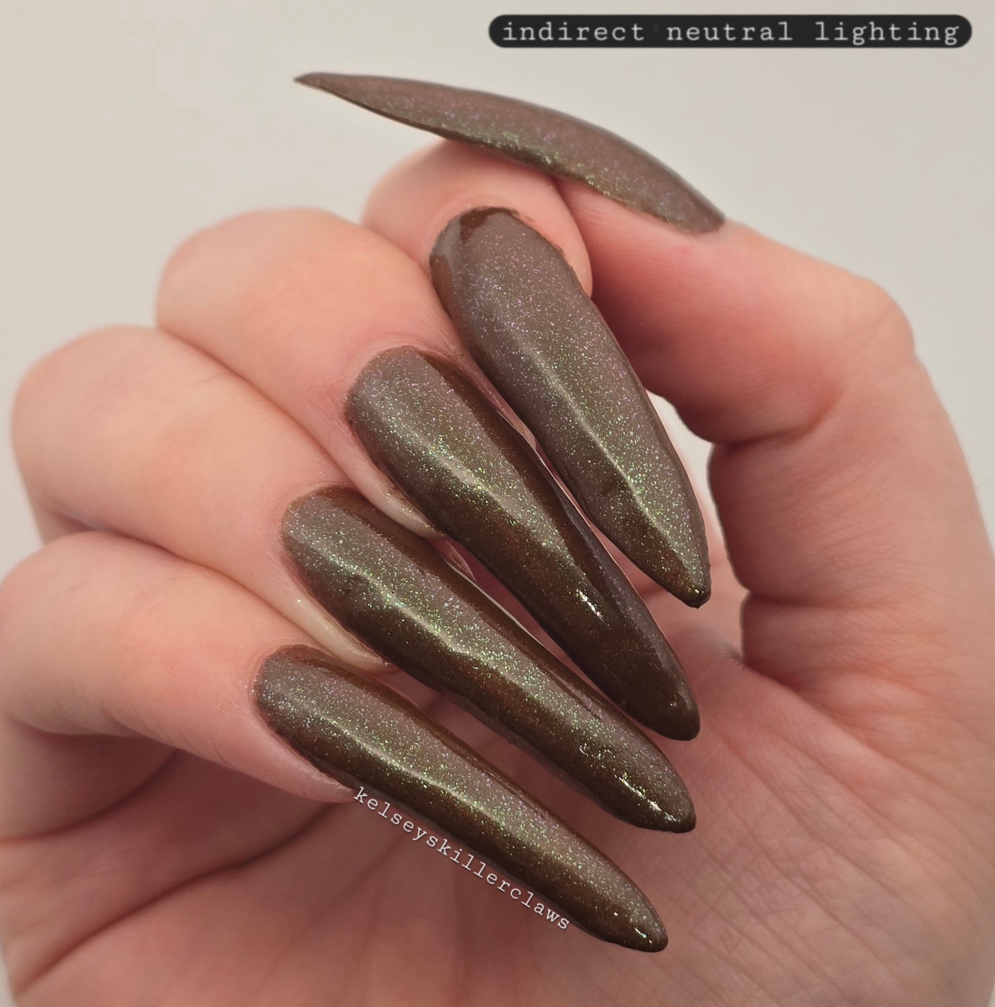 Chocolate Driftwood is a delectable chocolate brown polish with green shimmer and holo. The rich, earthy brown and soft suggestions of seaweed will take you away to a day at the beach.