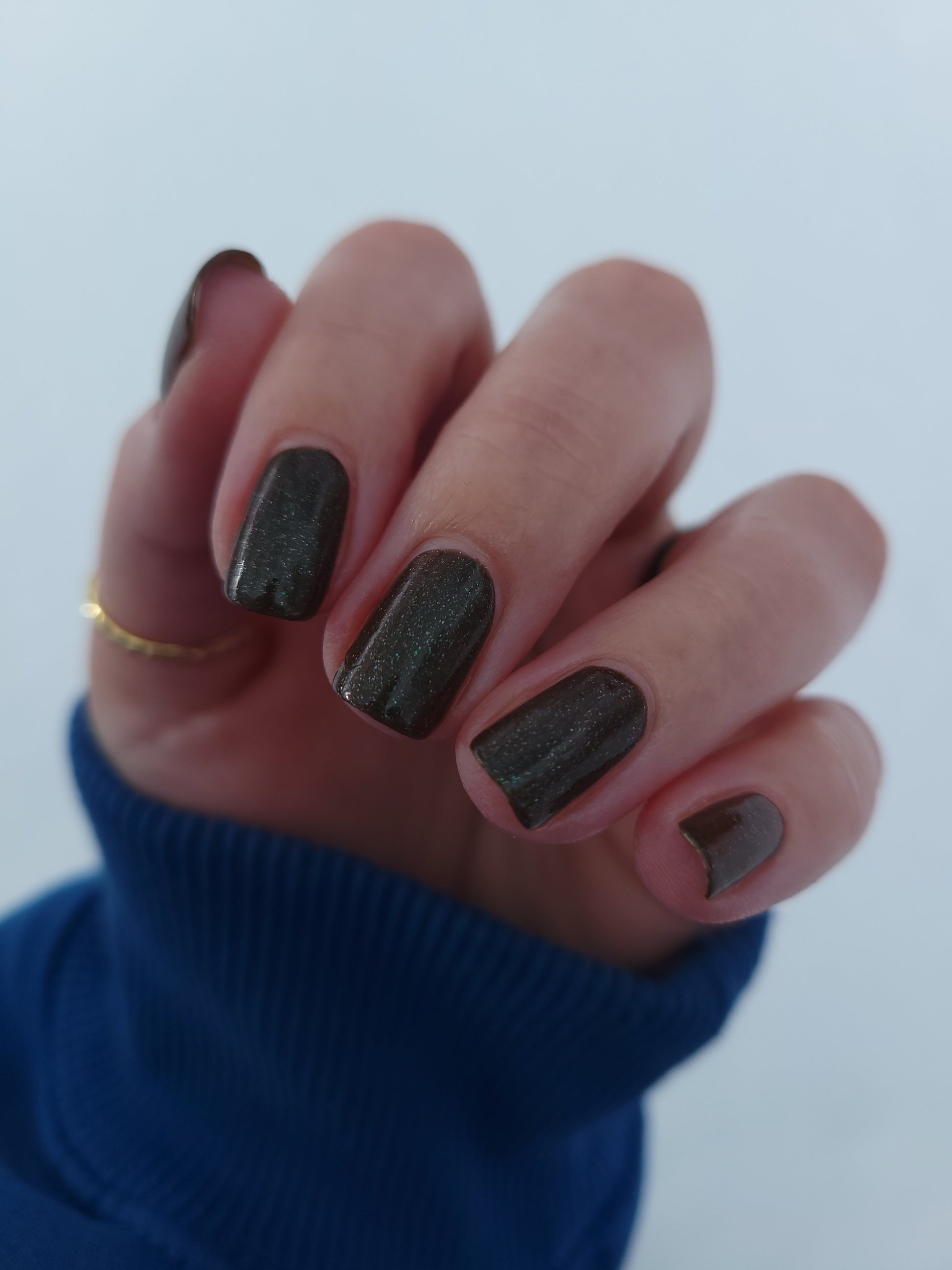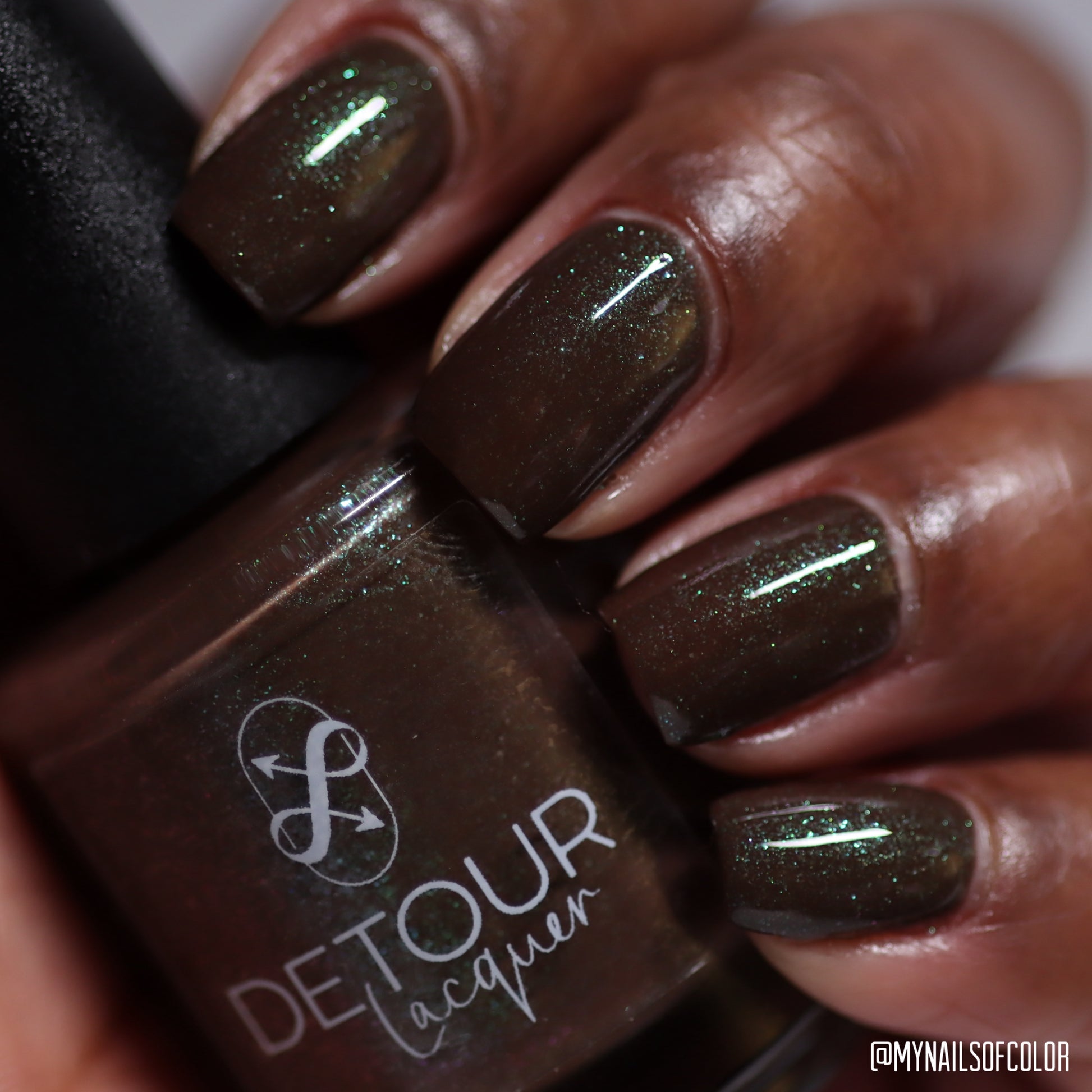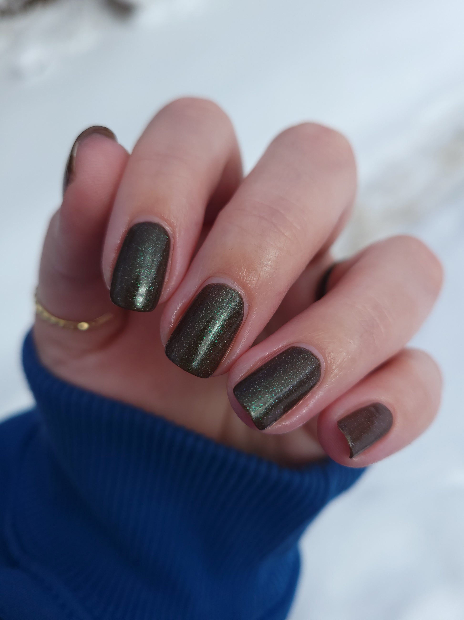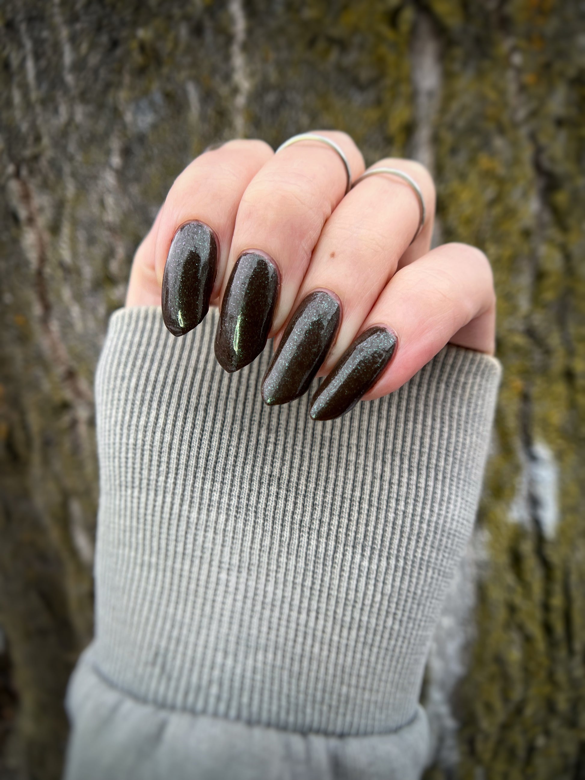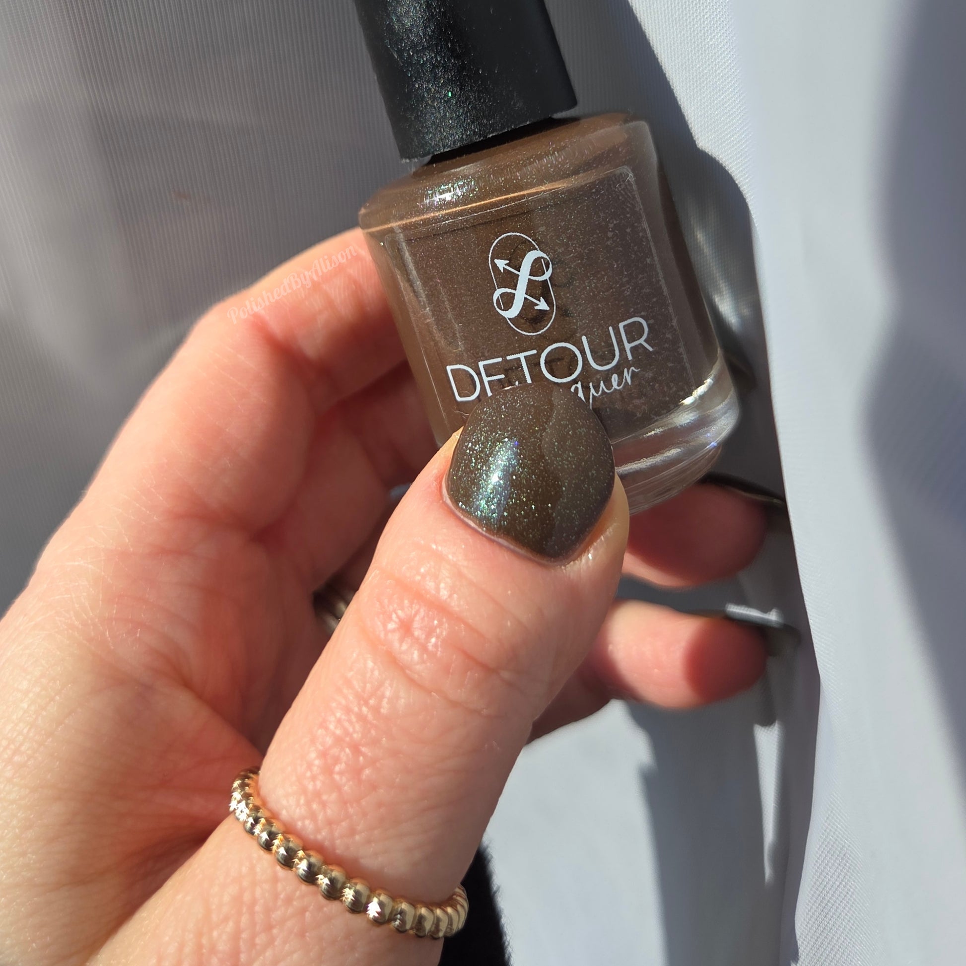 Chocolate Driftwood is a delectable chocolate brown polish with green shimmer and holo. The rich, earthy brown and soft suggestions of seaweed will take you away to a day at the beach.