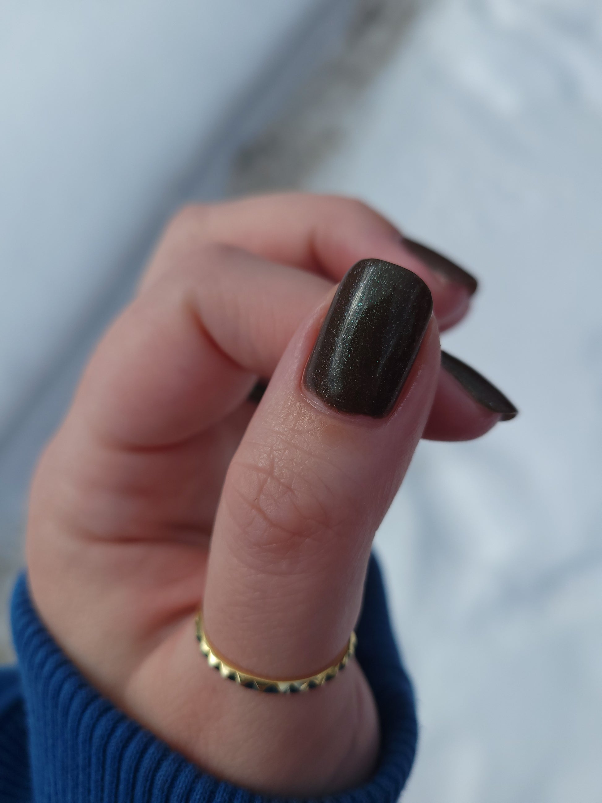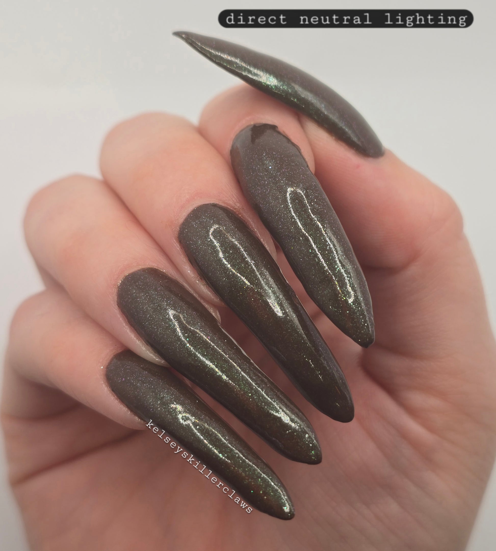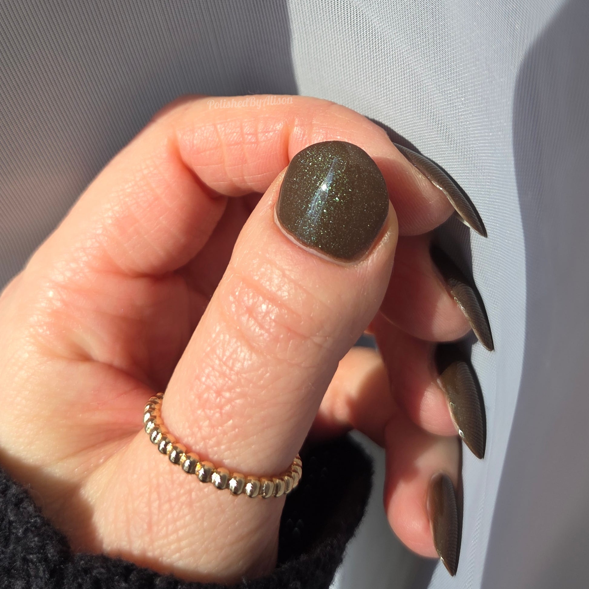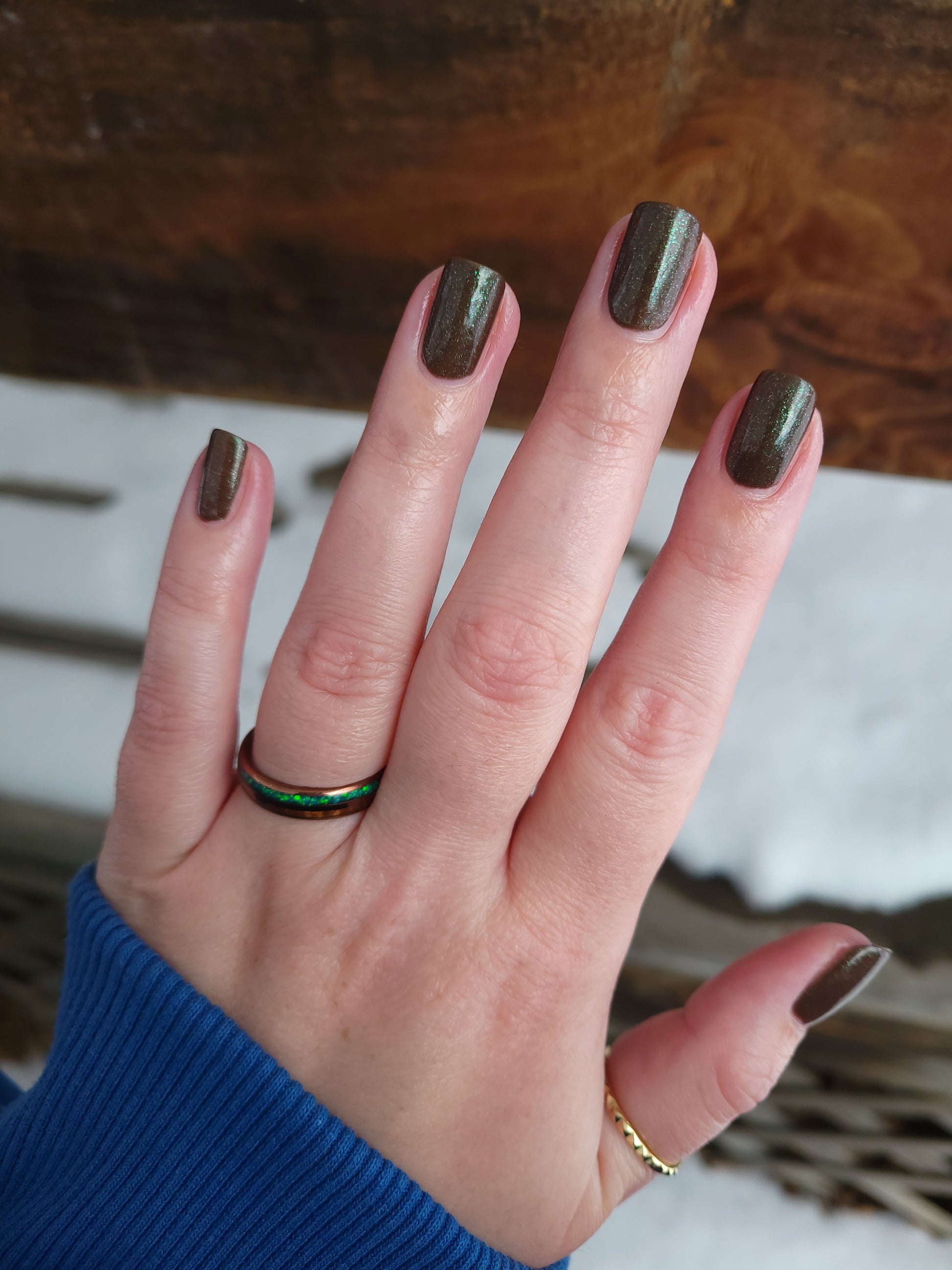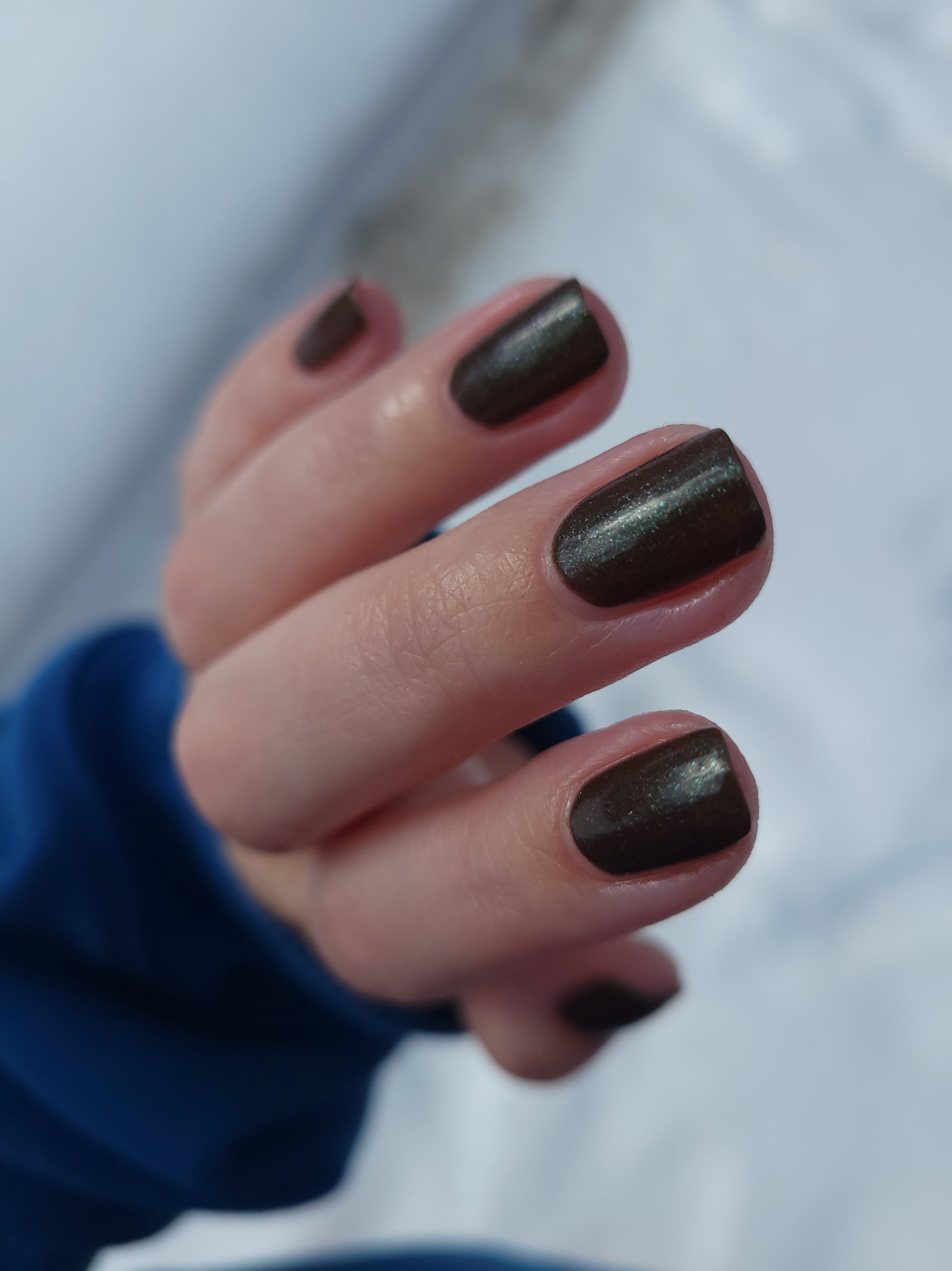 Chocolate Driftwood is a delectable chocolate brown polish with green shimmer and holo. The rich, earthy brown and soft suggestions of seaweed will take you away to a day at the beach.