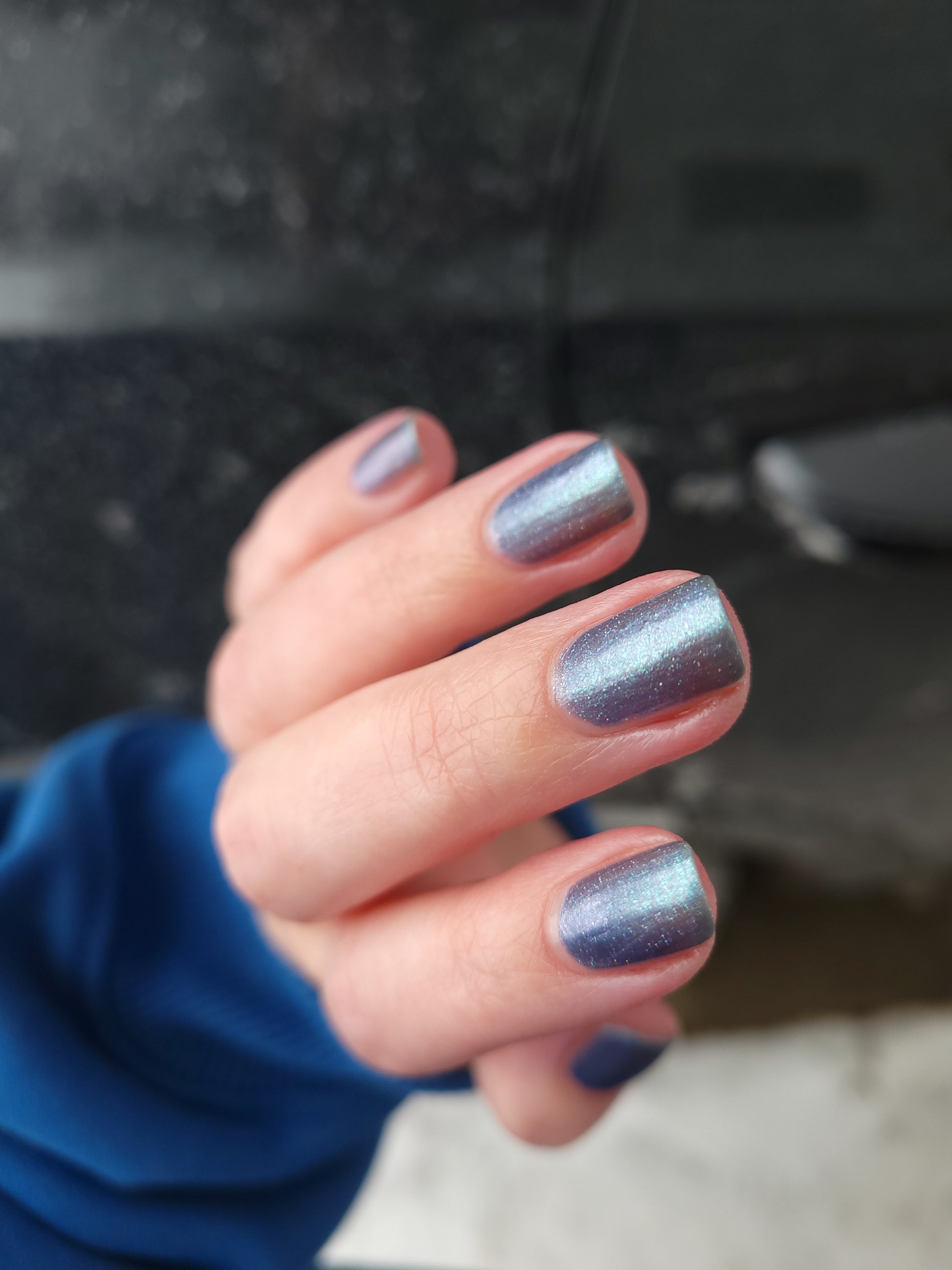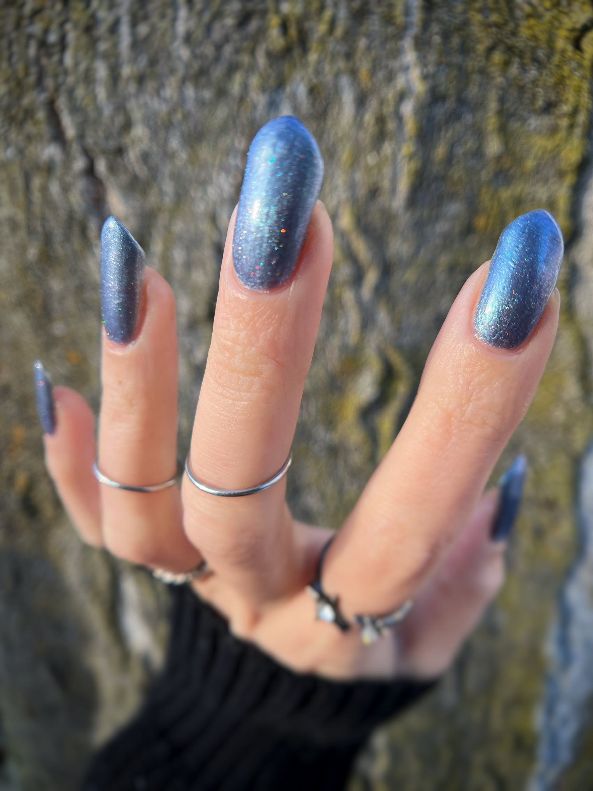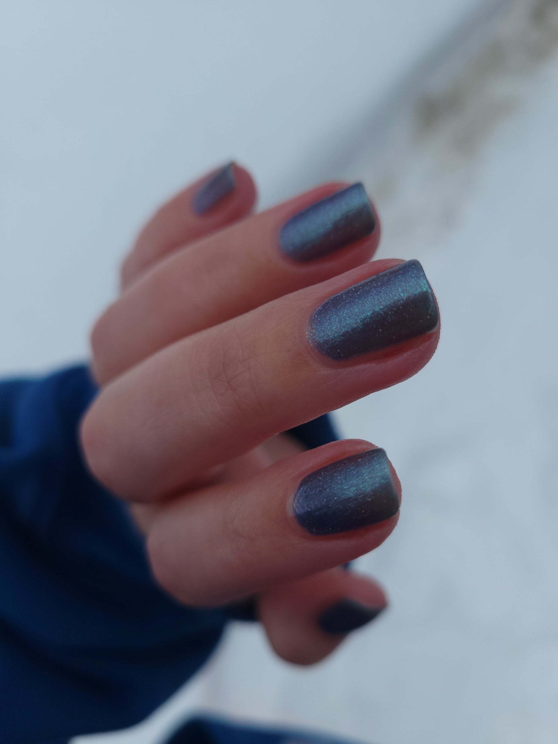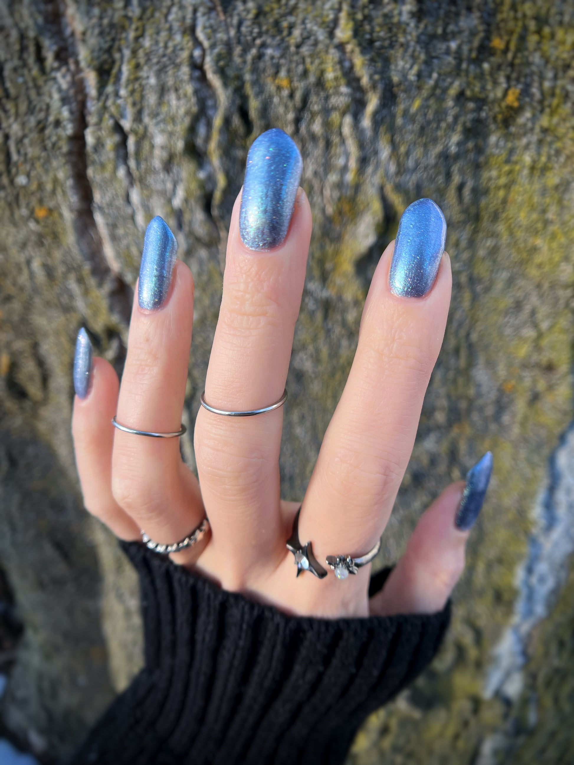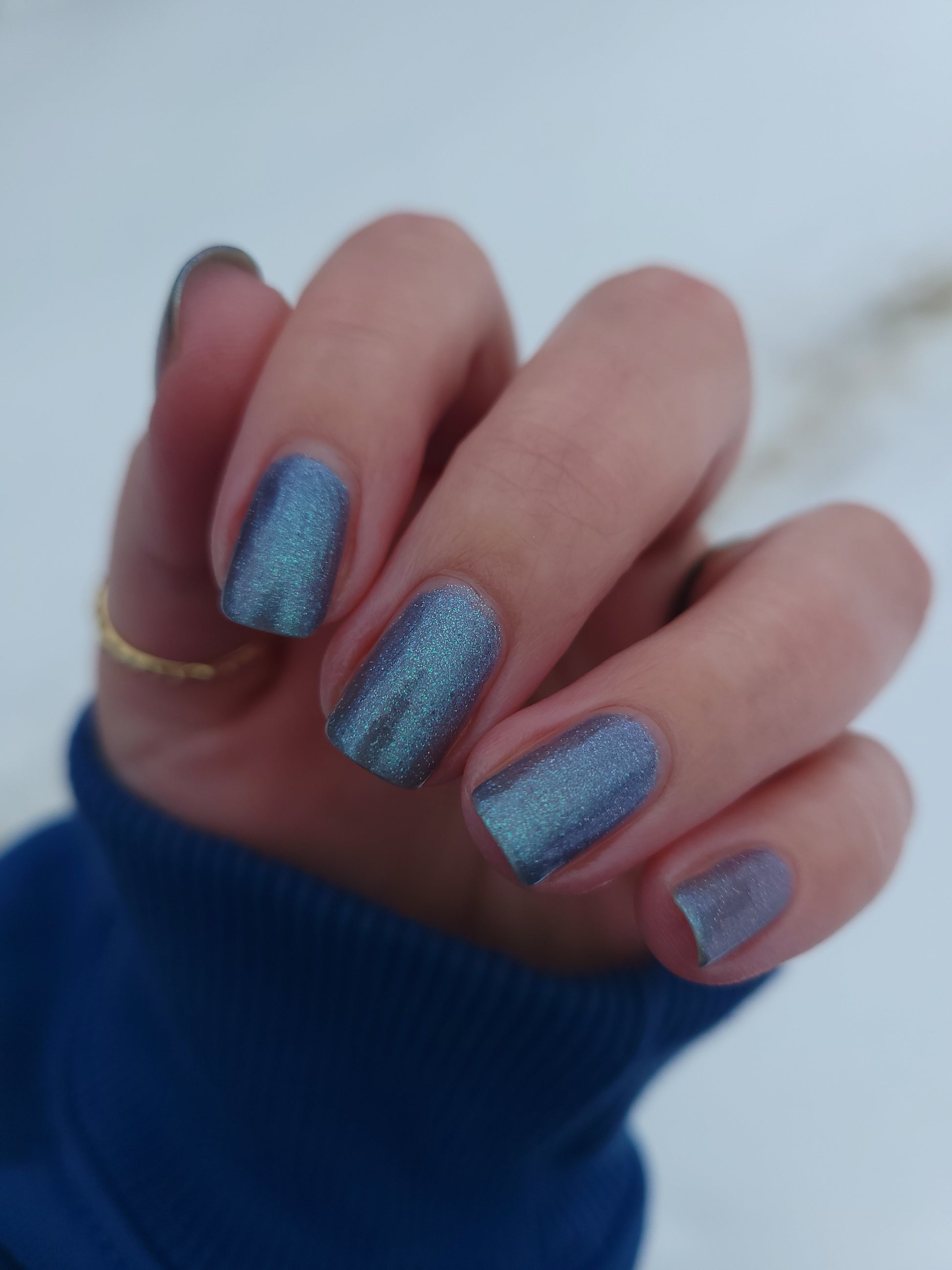 Evening Tide is a light steel blue base with a green shimmer and holo glitters. Like the moon glistening upon shallow tide pools, this polish feels soft and serene.