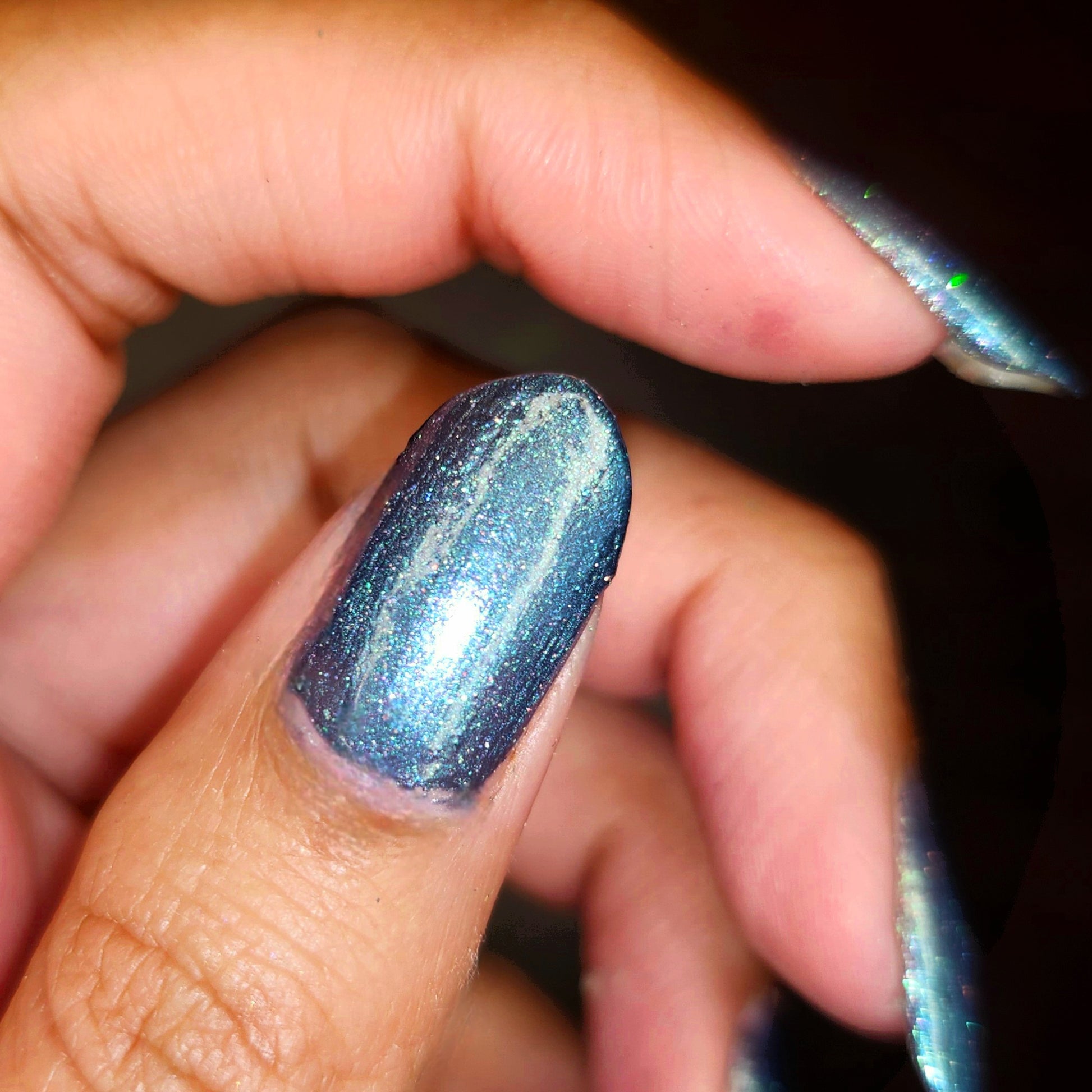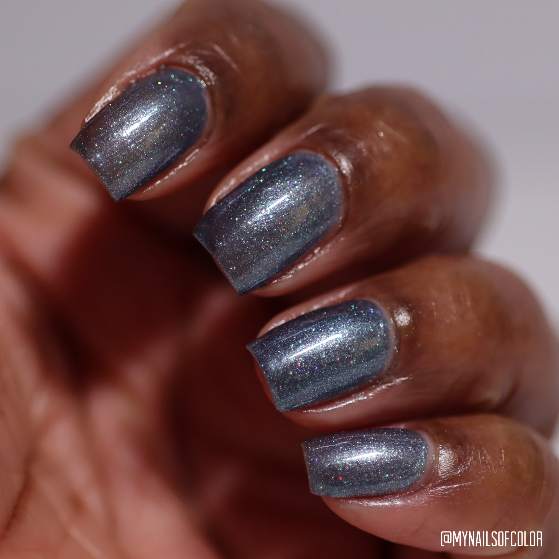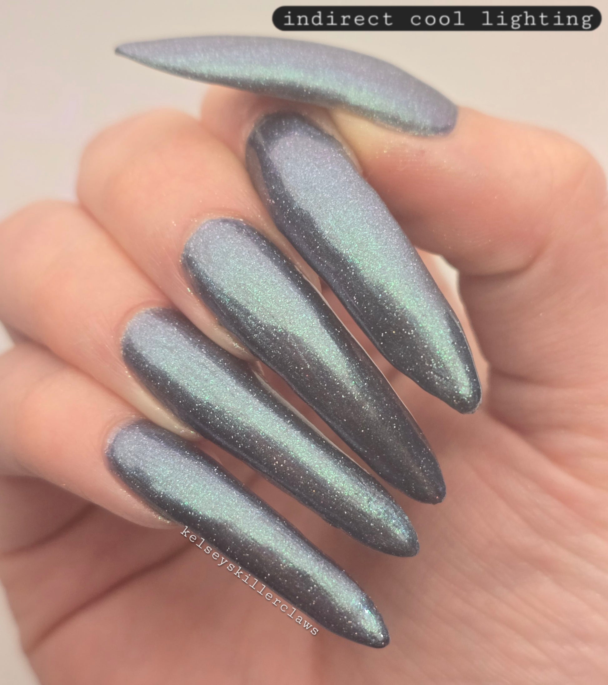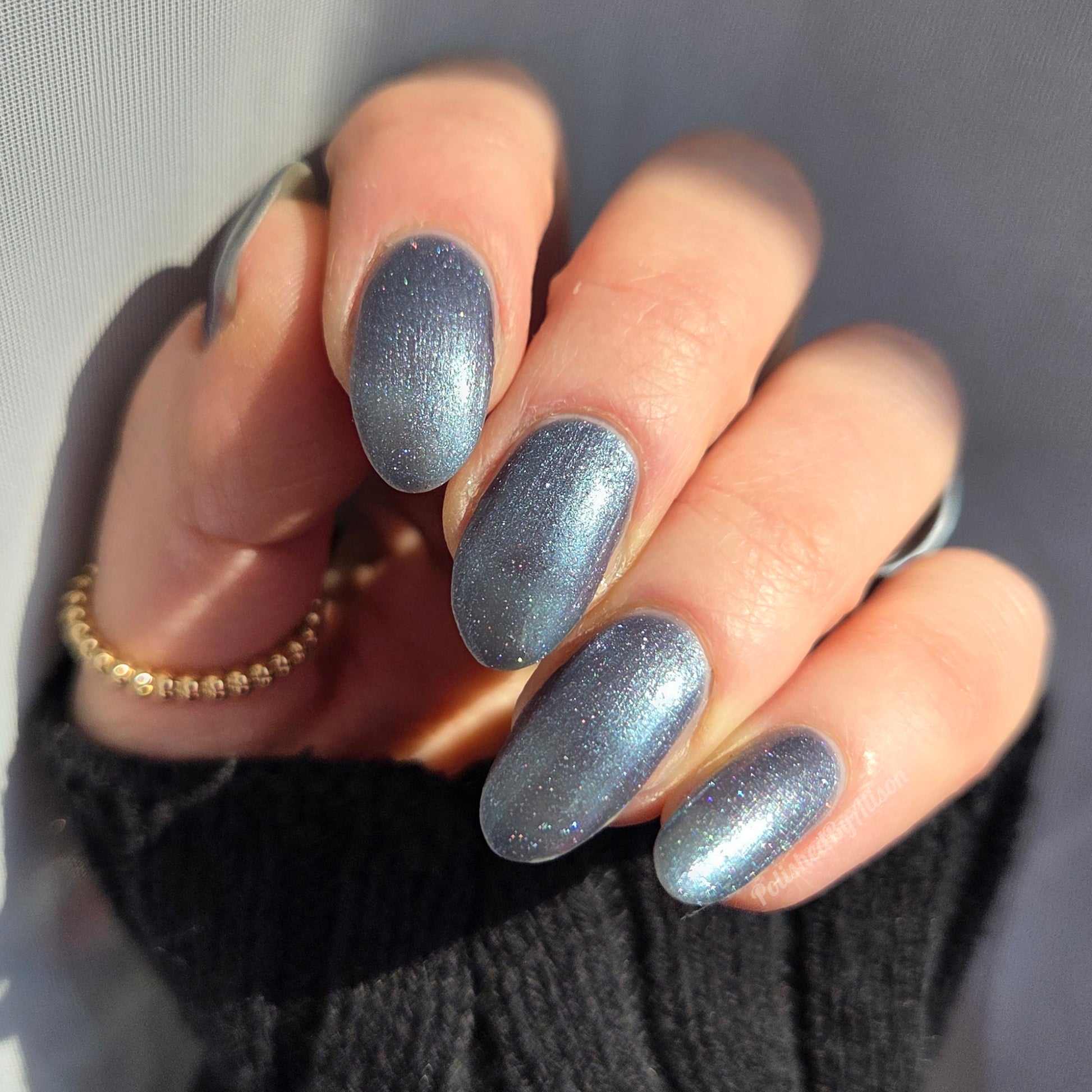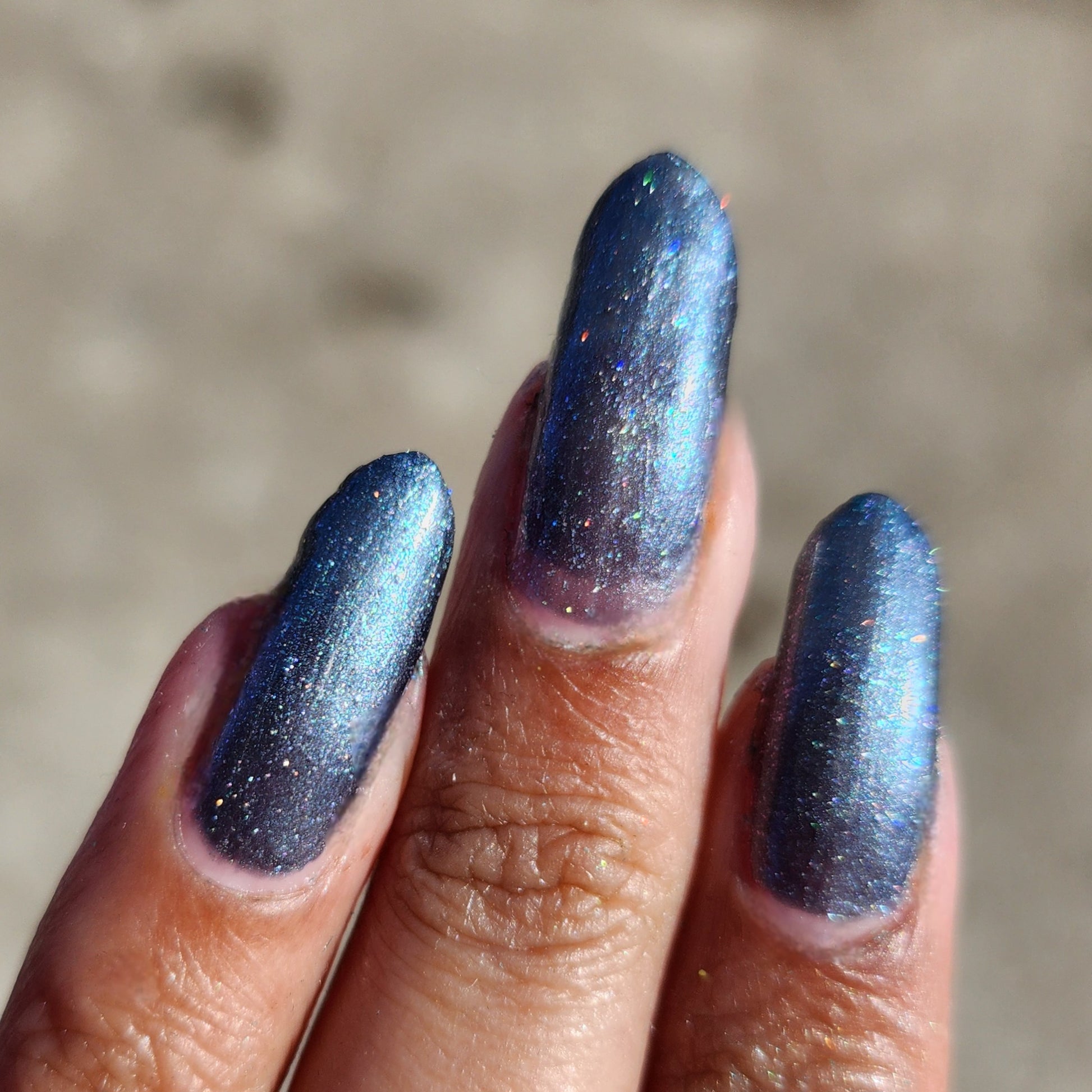 Evening Tide is a light steel blue base with a green shimmer and holo glitters. Like the moon glistening upon shallow tide pools, this polish feels soft and serene.
