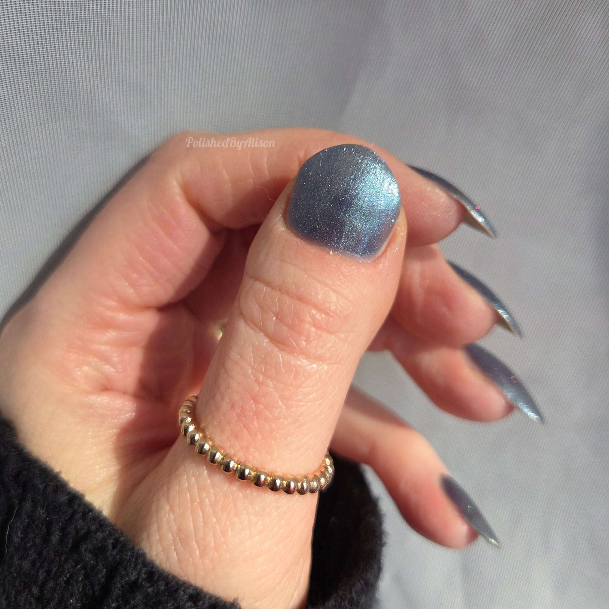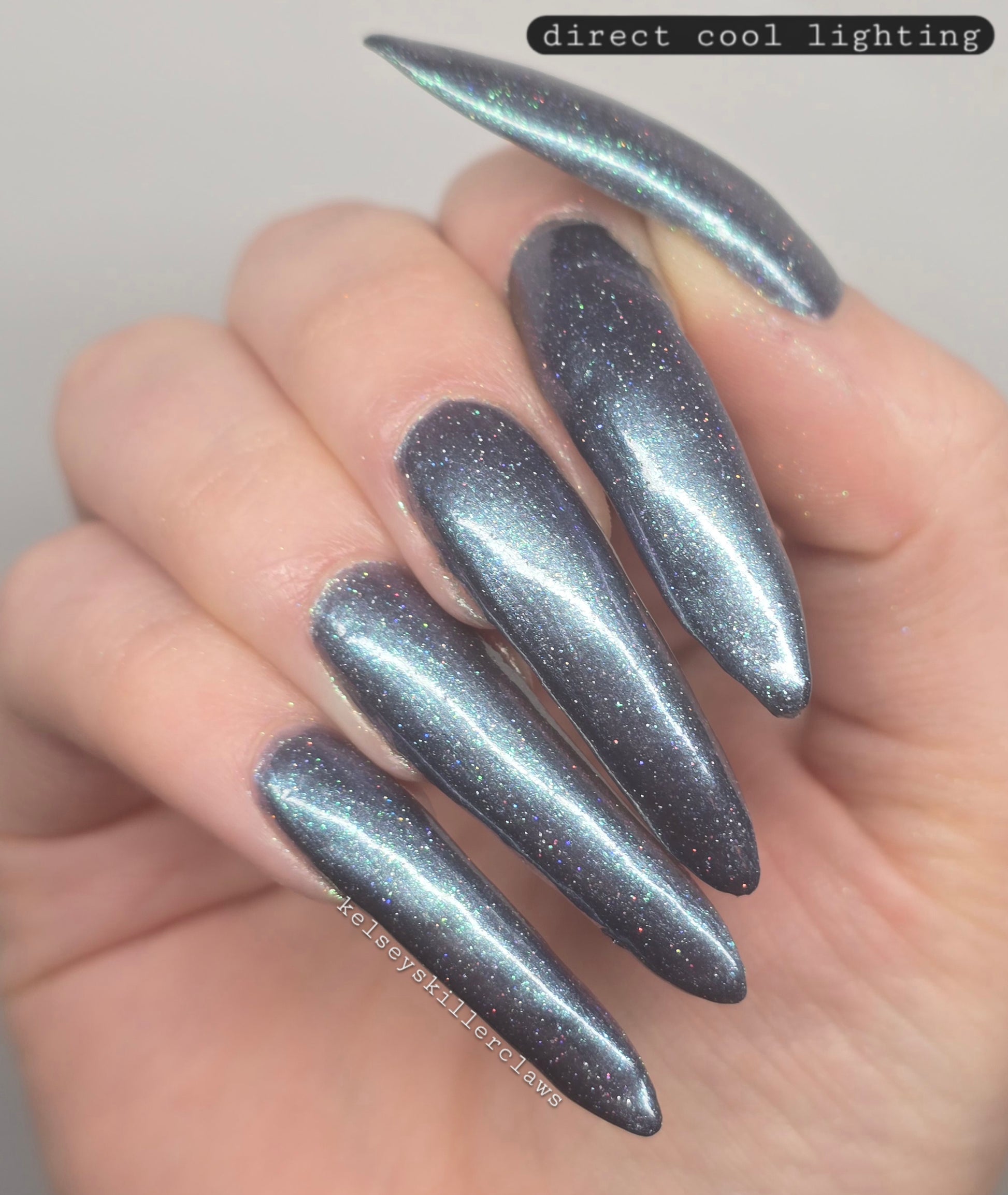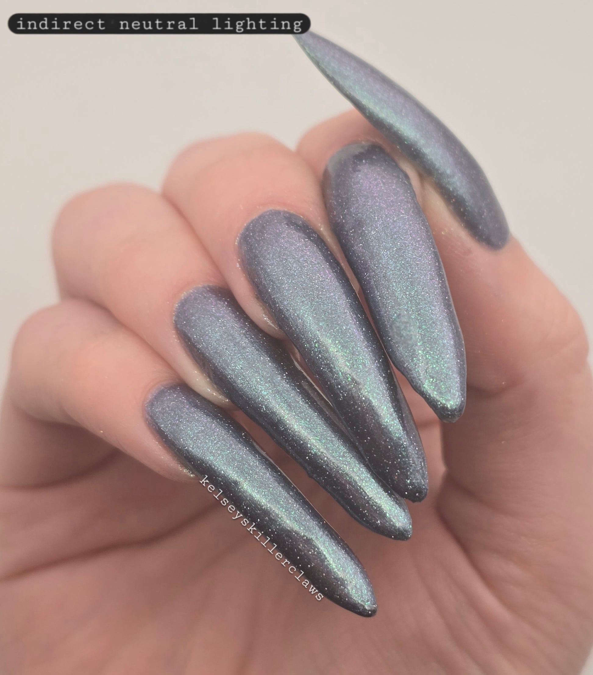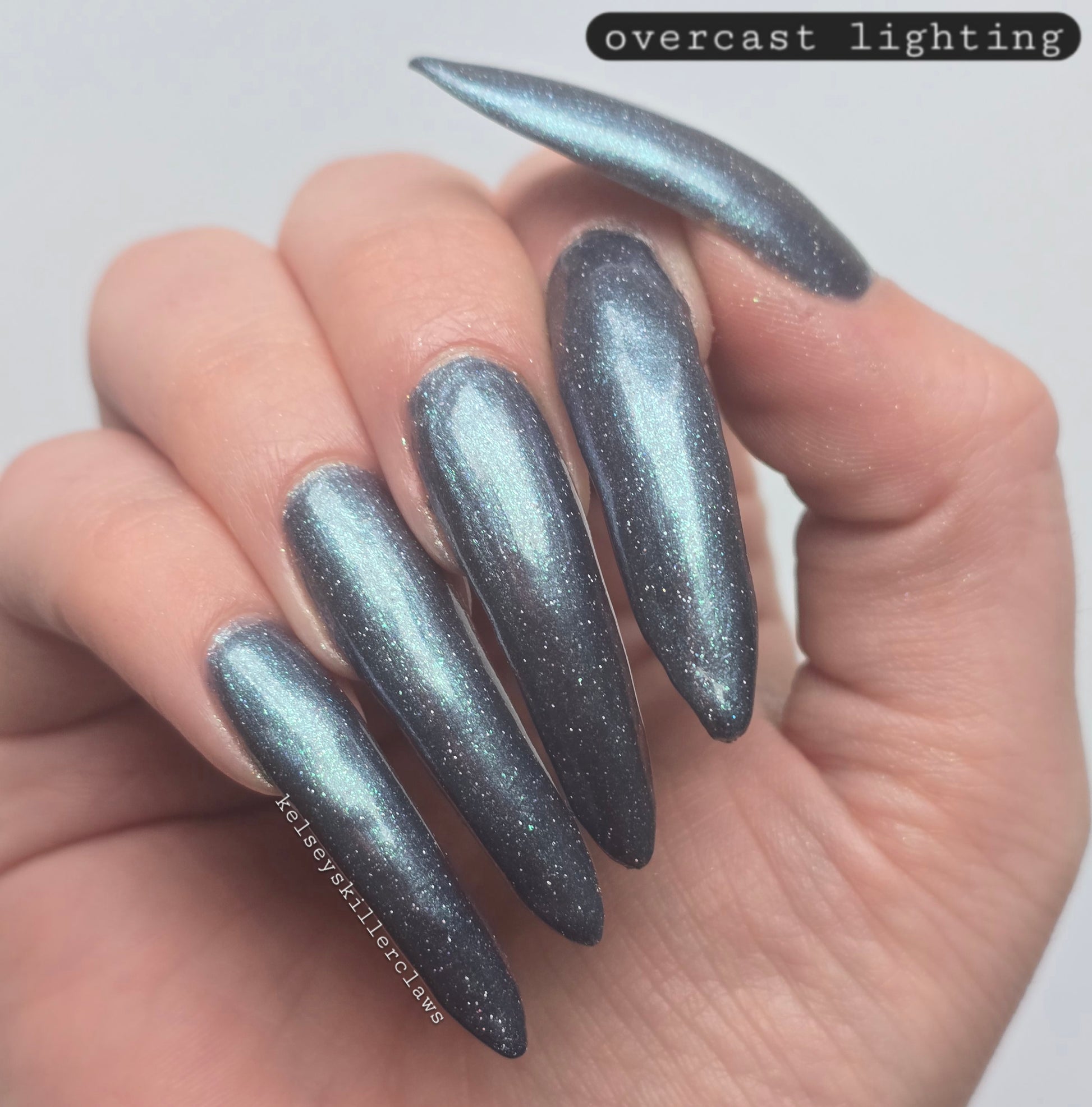Evening Tide is a light steel blue base with a green shimmer and holo glitters. Like the moon glistening upon shallow tide pools, this polish feels soft and serene.