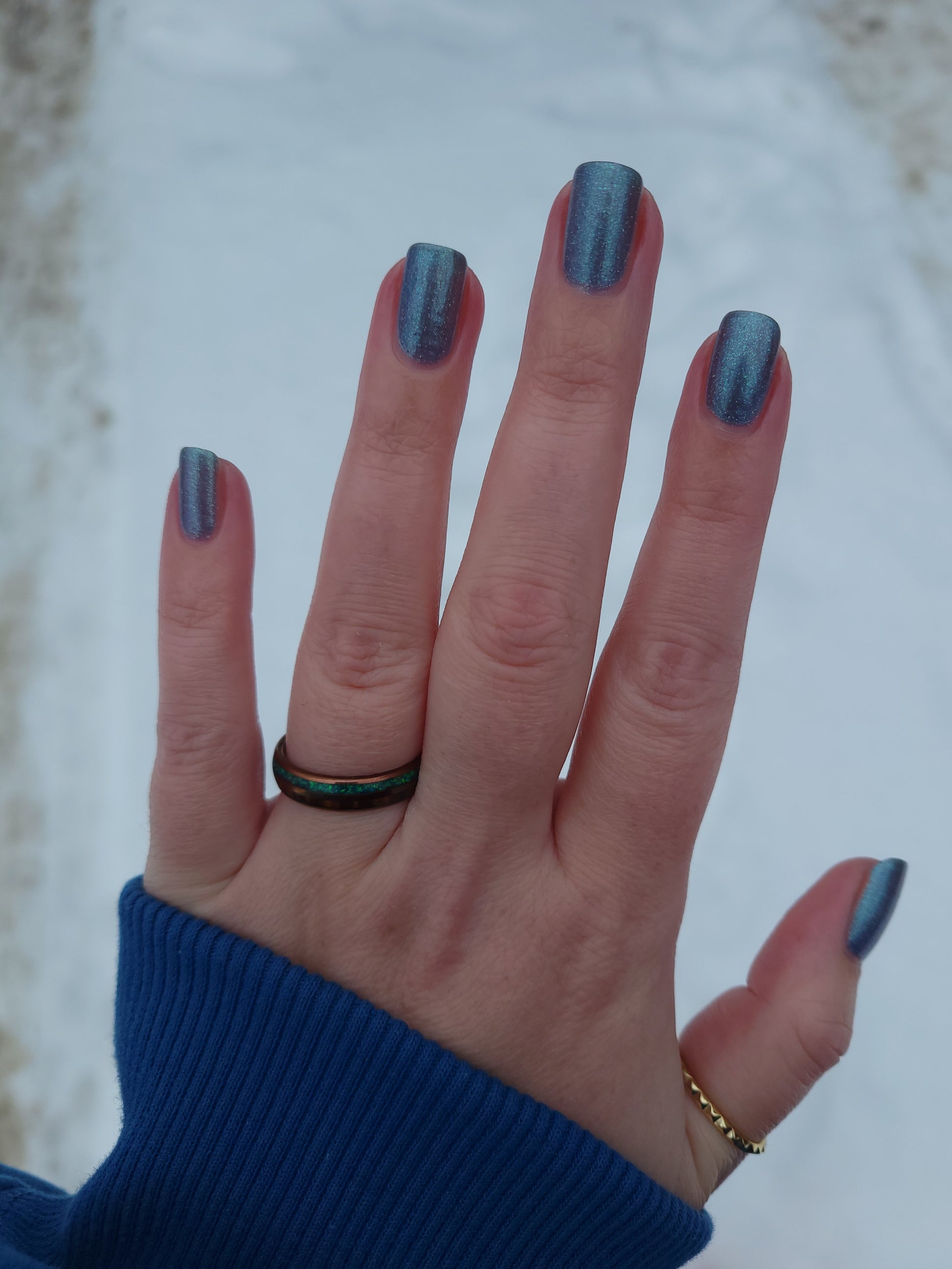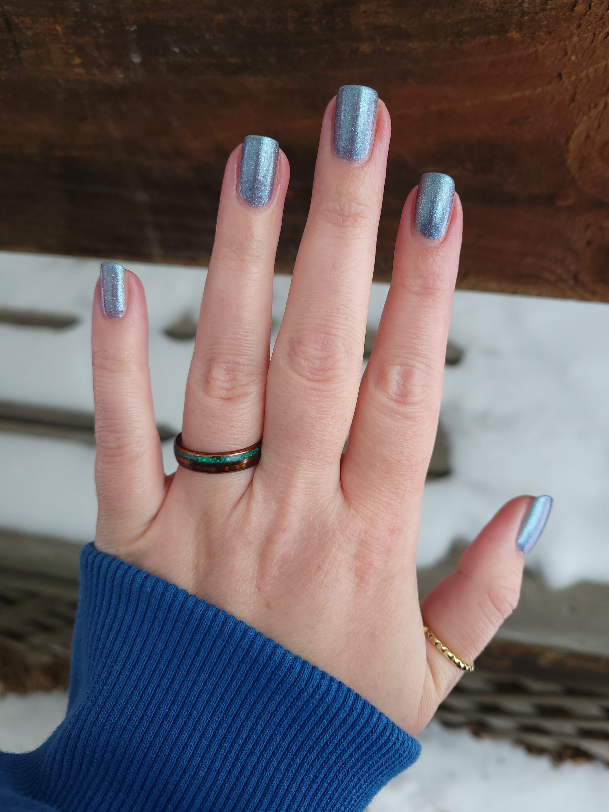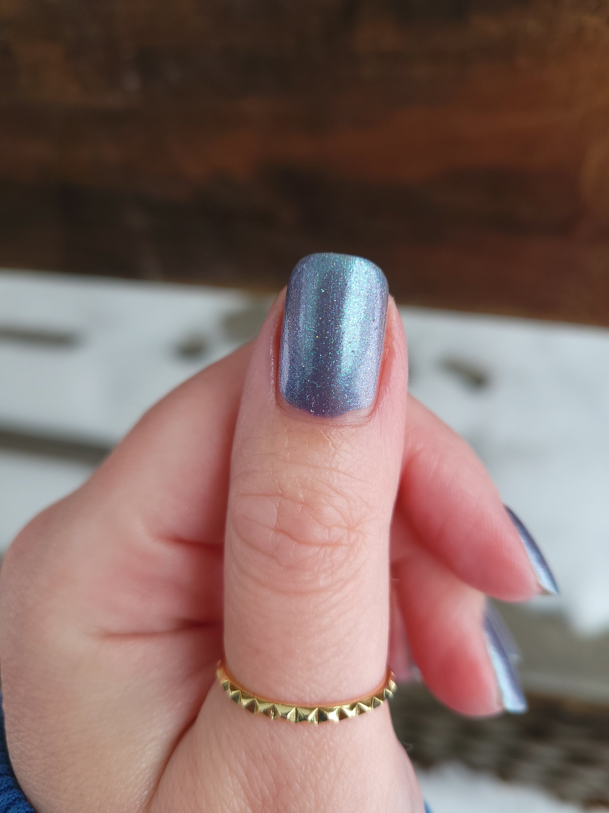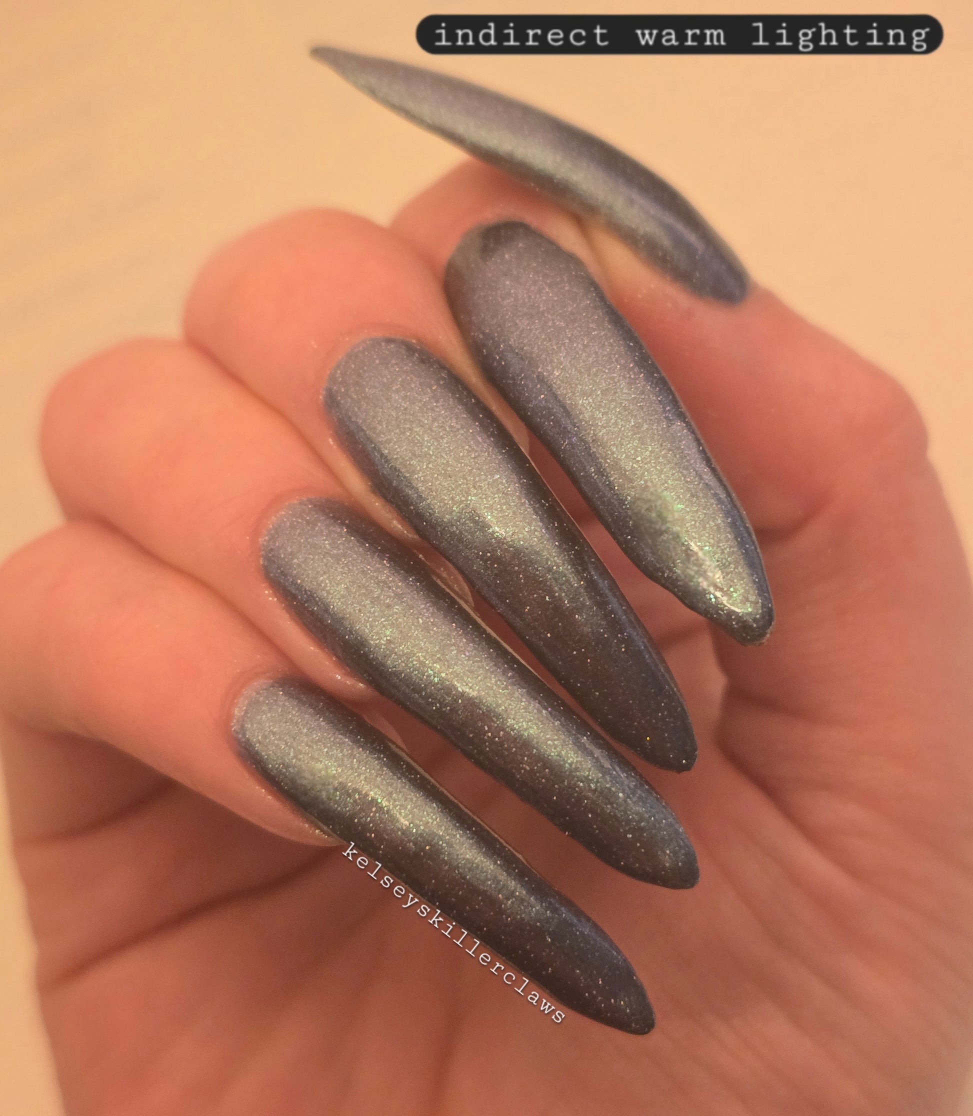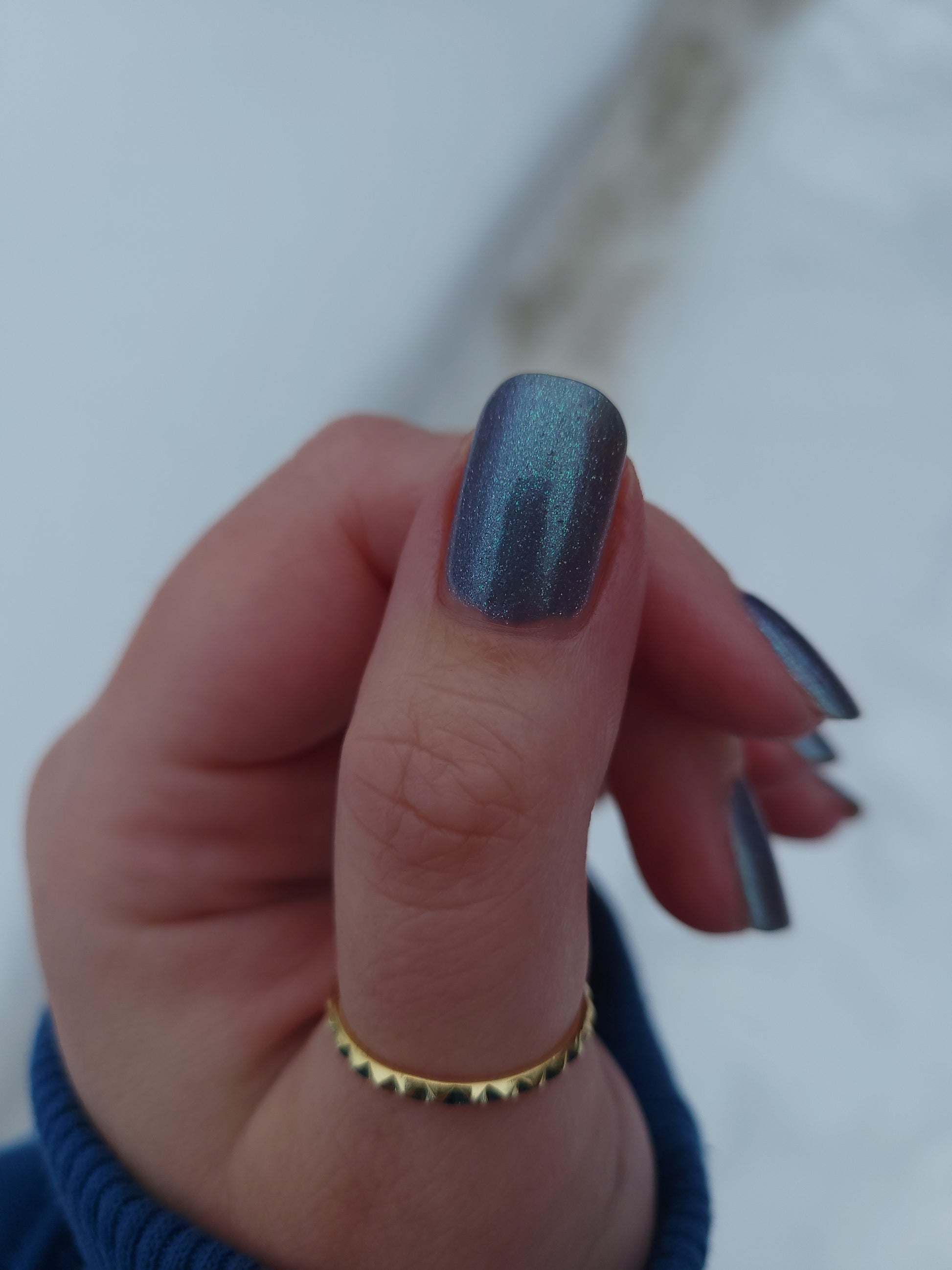 Evening Tide is a light steel blue base with a green shimmer and holo glitters. Like the moon glistening upon shallow tide pools, this polish feels soft and serene.