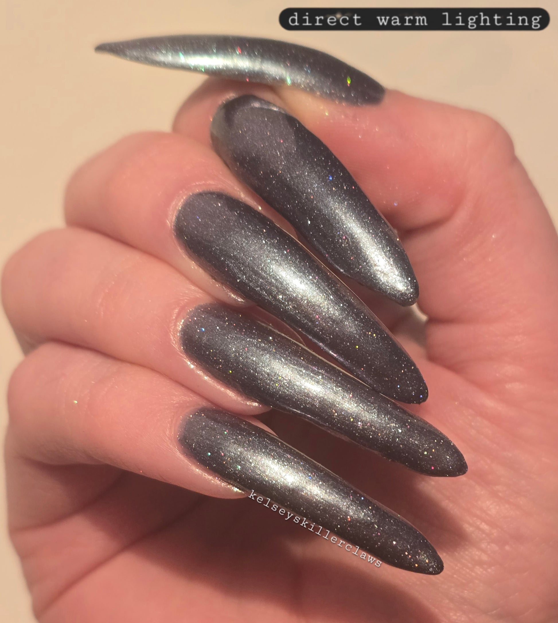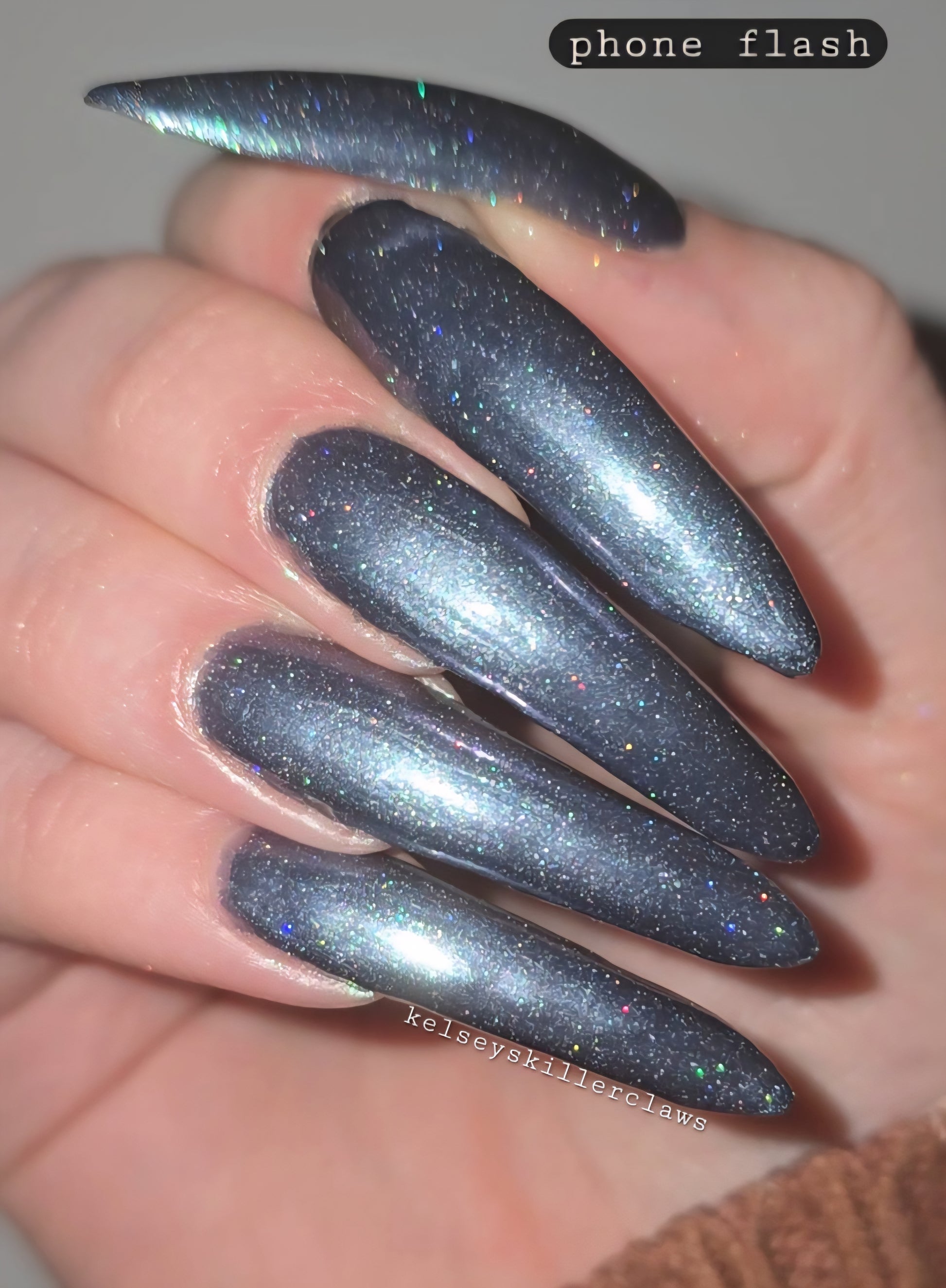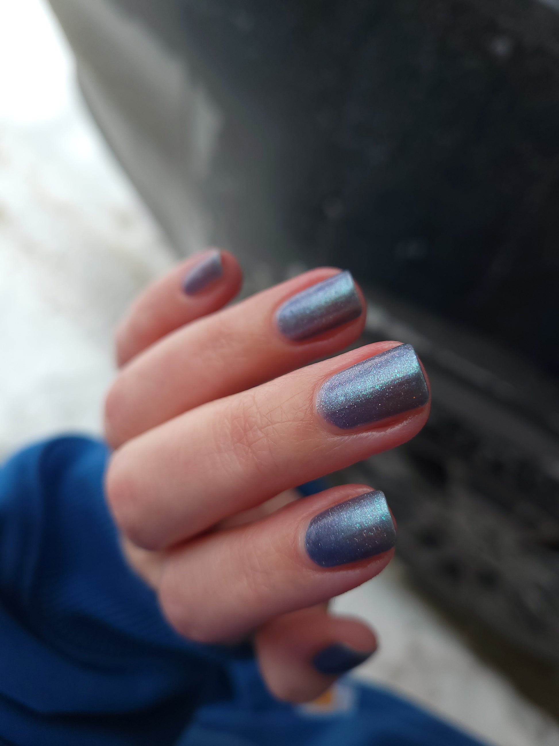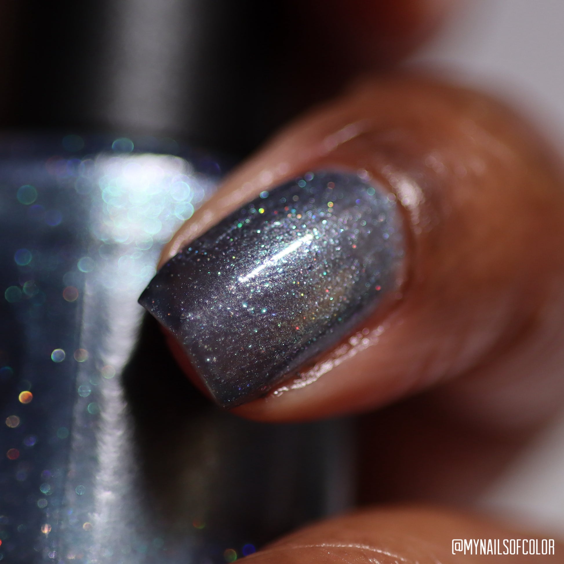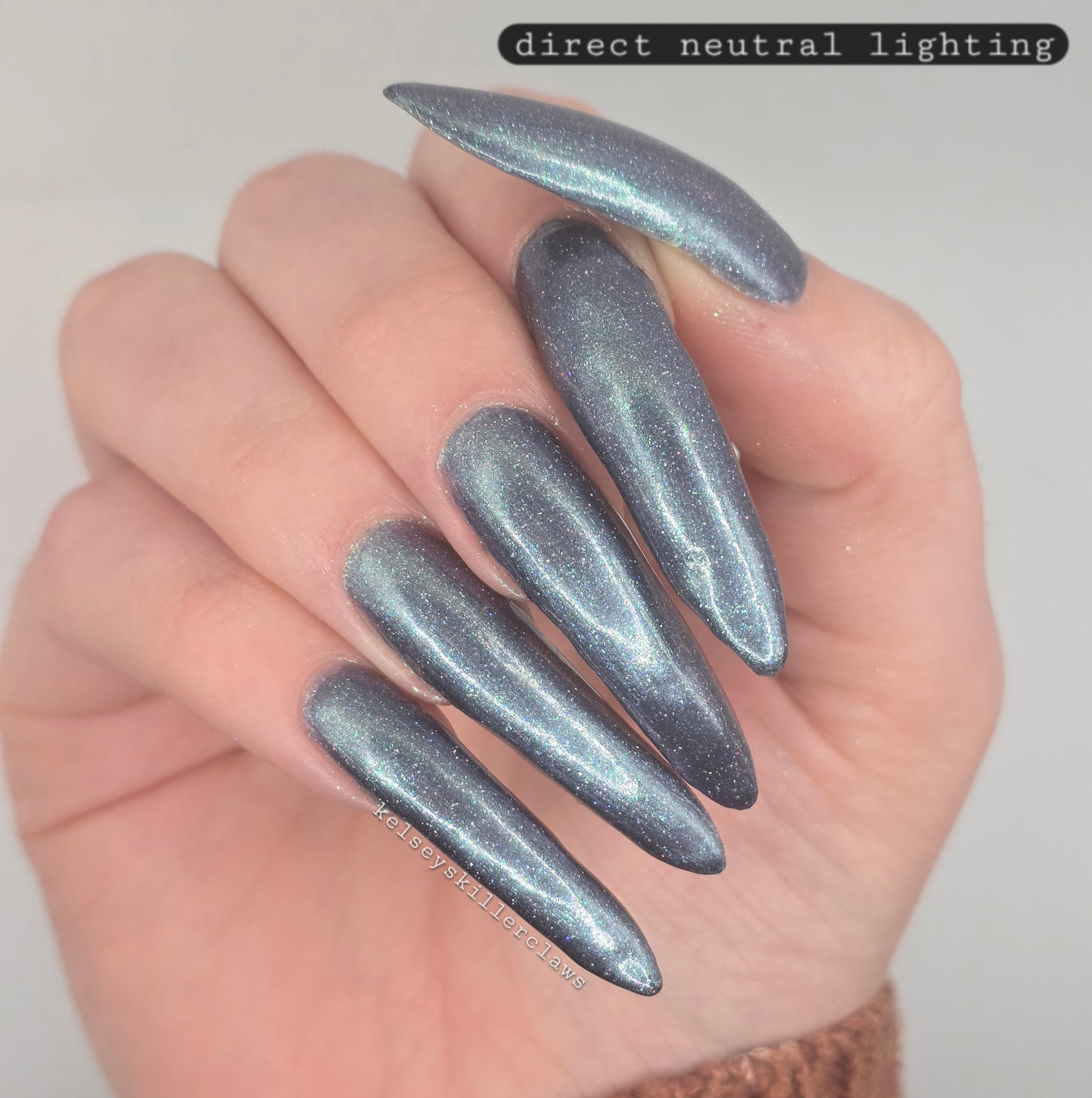 Evening Tide is a light steel blue base with a green shimmer and holo glitters. Like the moon glistening upon shallow tide pools, this polish feels soft and serene.