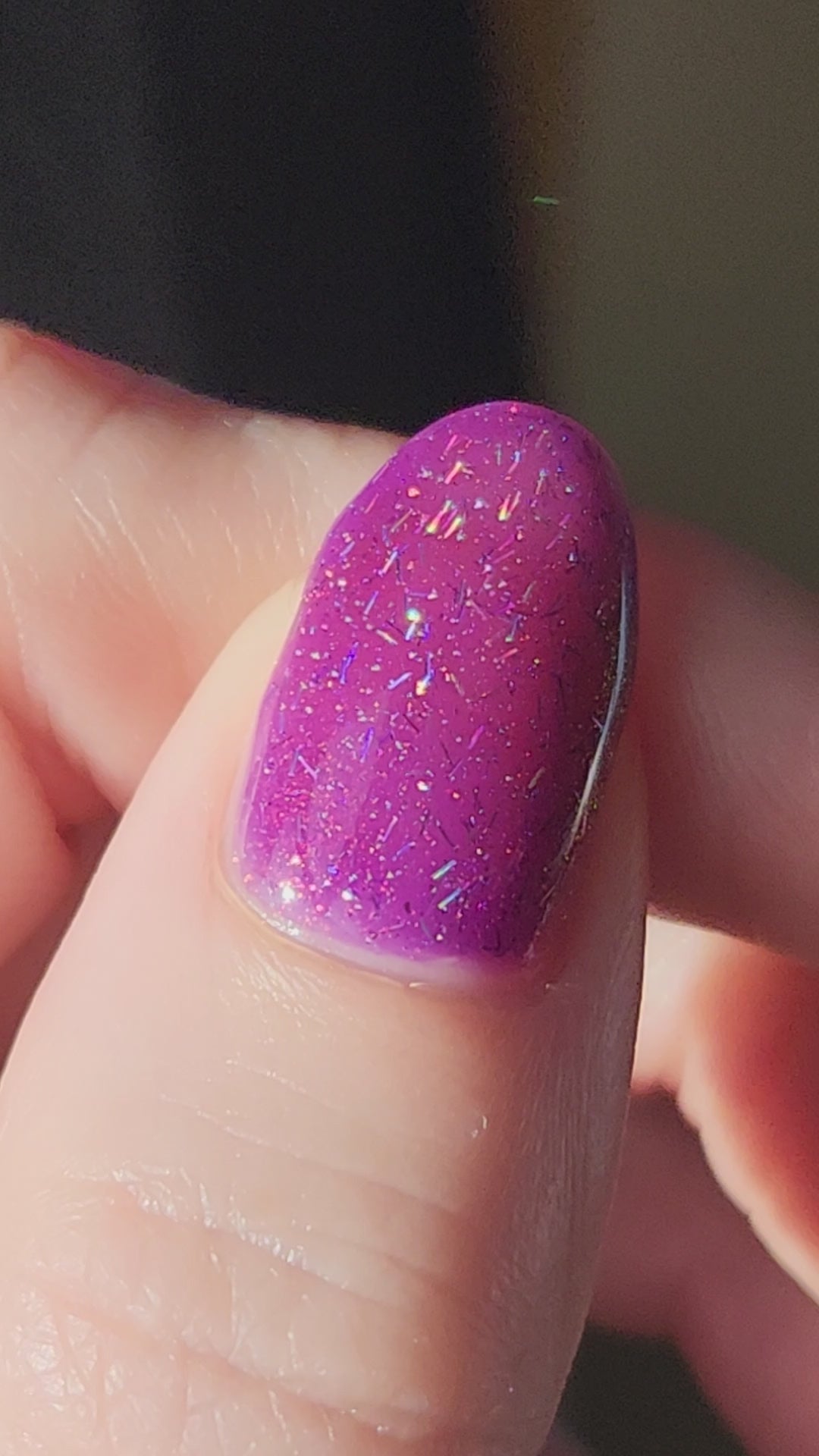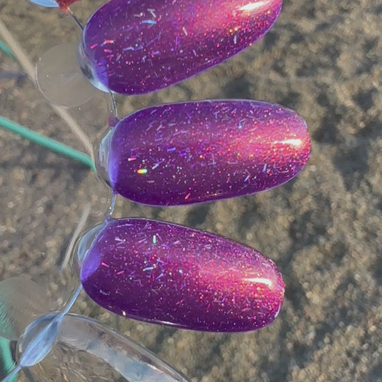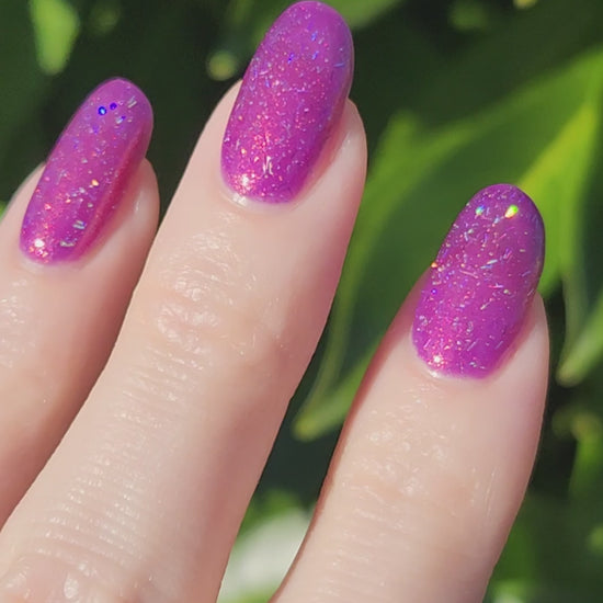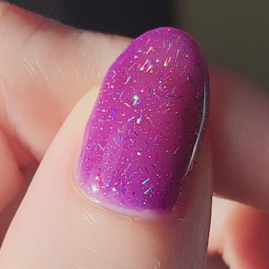 Inspired by @nataliesneatnails, Natalie's Neat Birthday Polish celebrates the joys of all things glittery and purple. A true party in a bottle, this polish has a purple base with pink-to-magenta shimmer and holographic bar glitter.