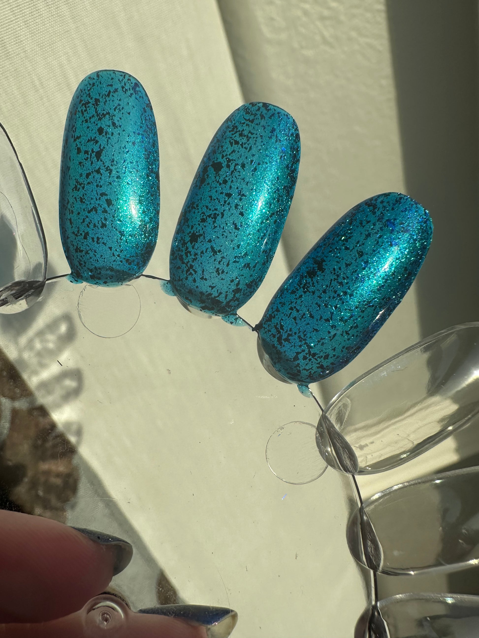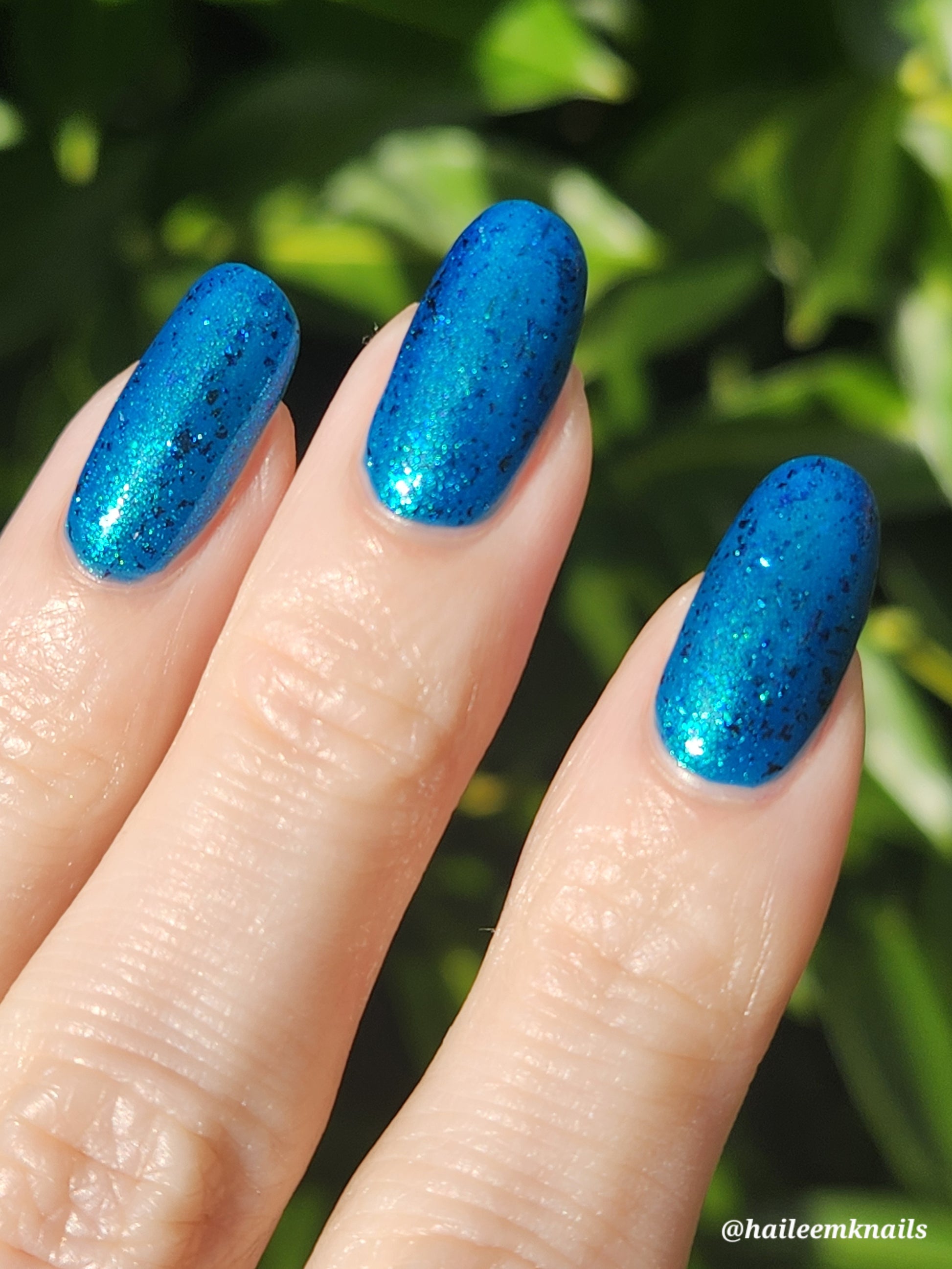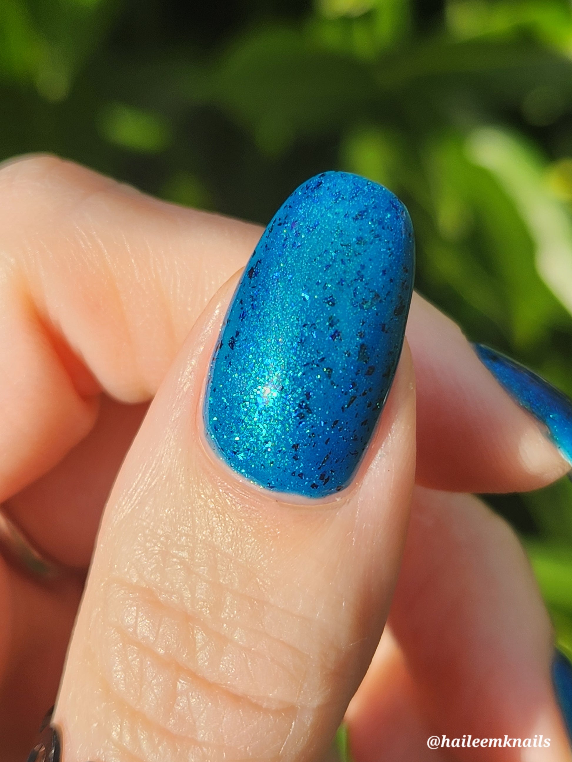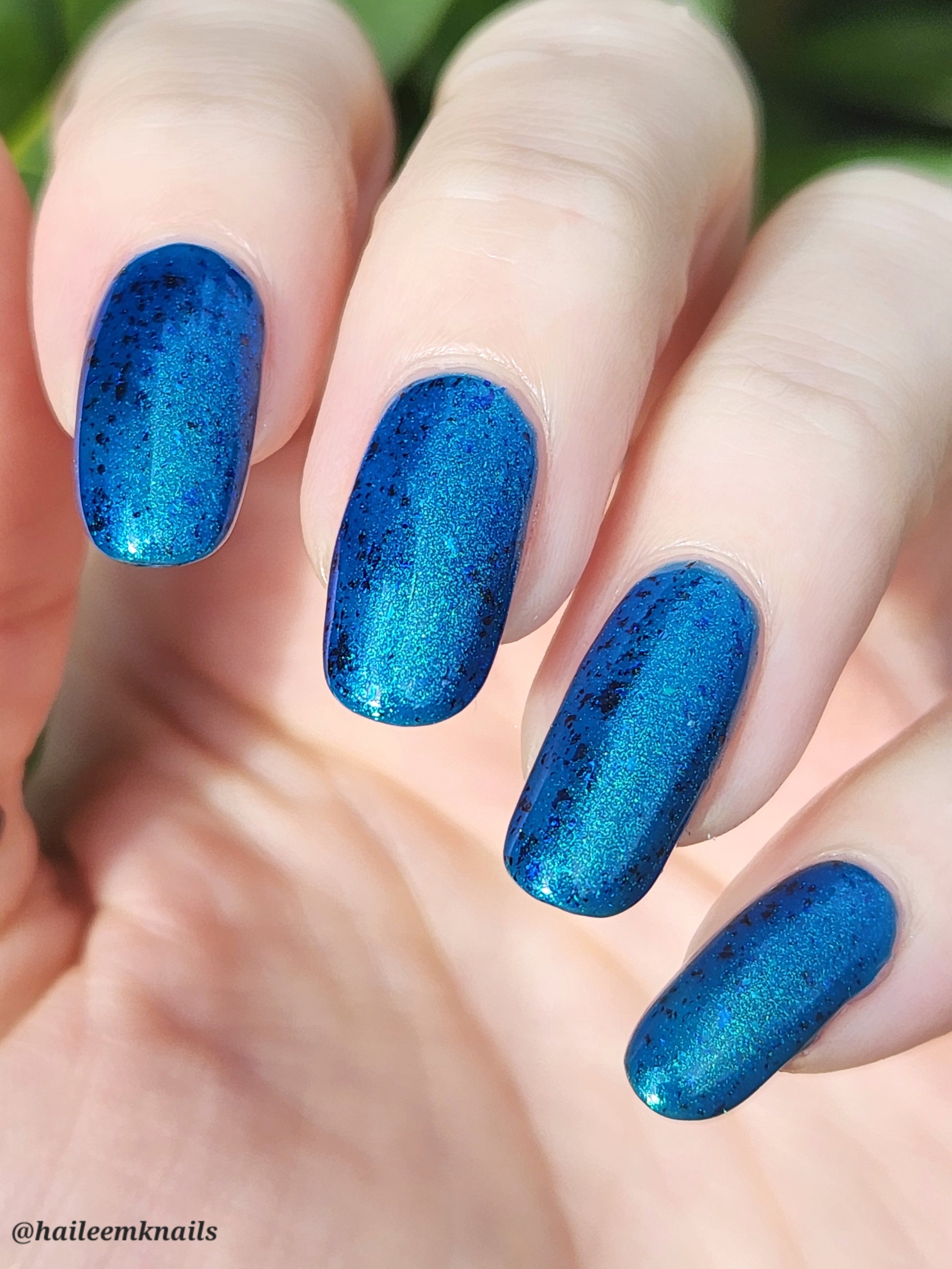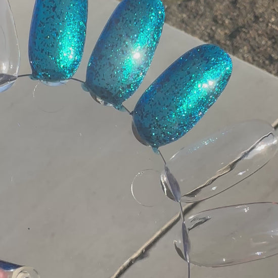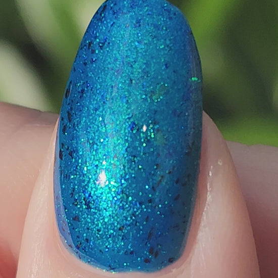 A blue base with green and blue shimmer, and teal/blue/purple flakes.