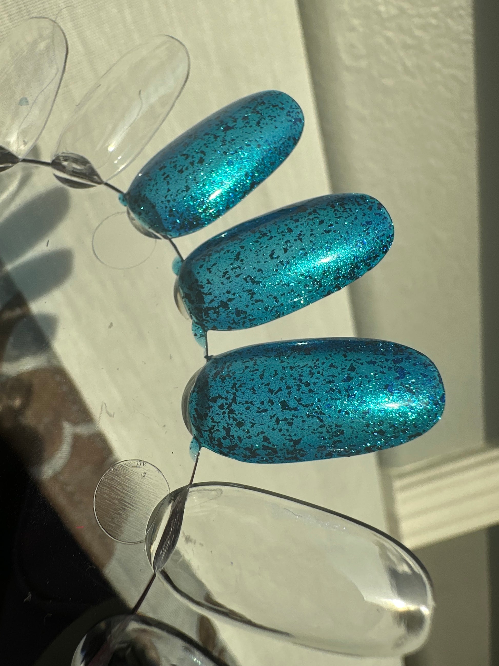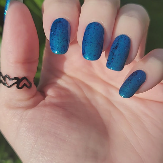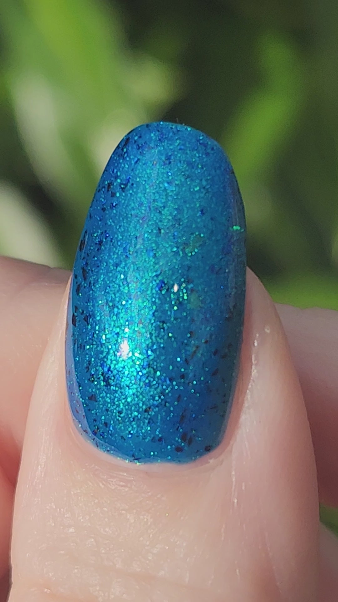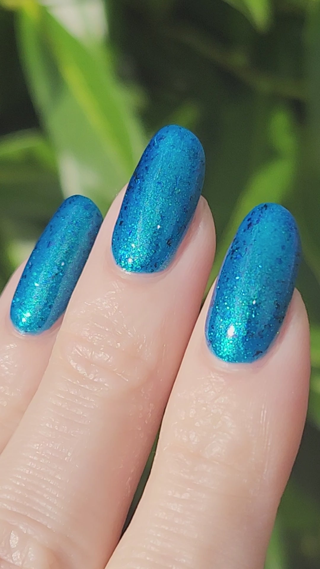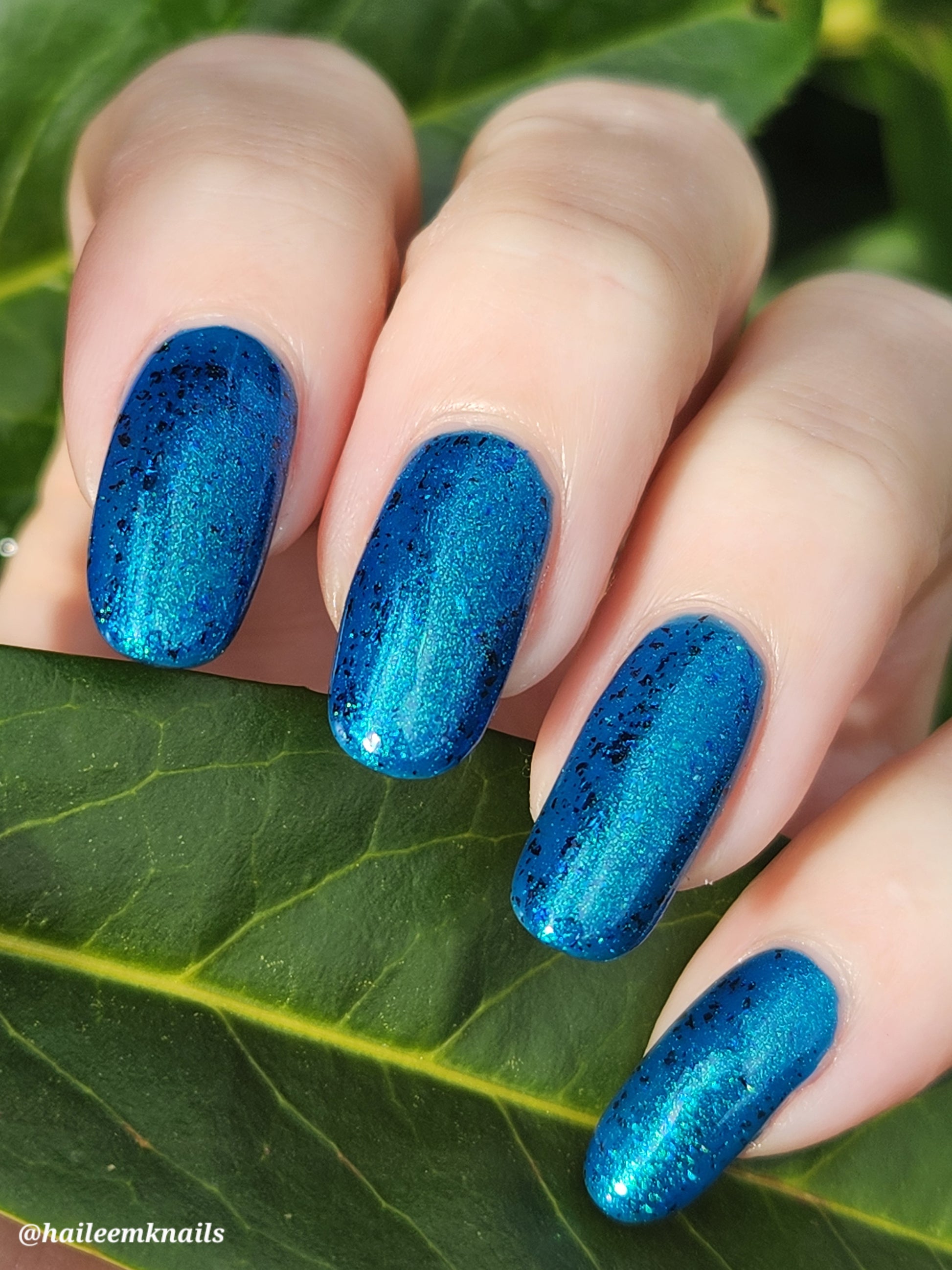 A blue base with green and blue shimmer, and teal/blue/purple flakes.