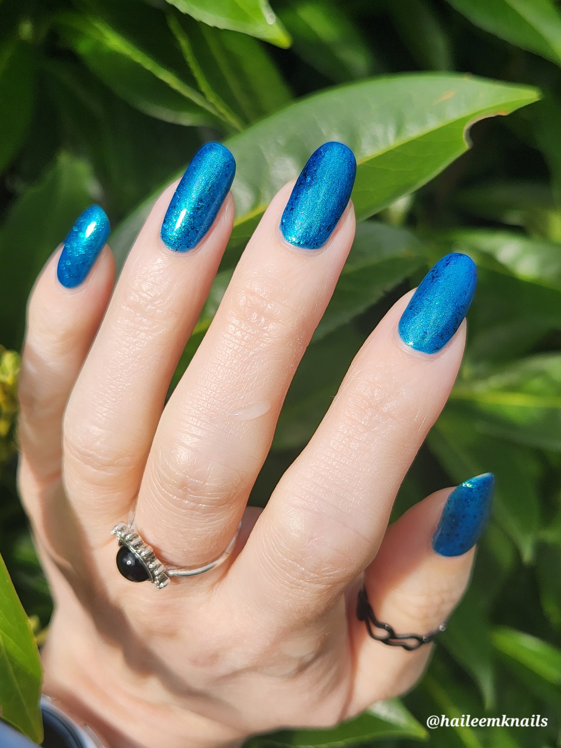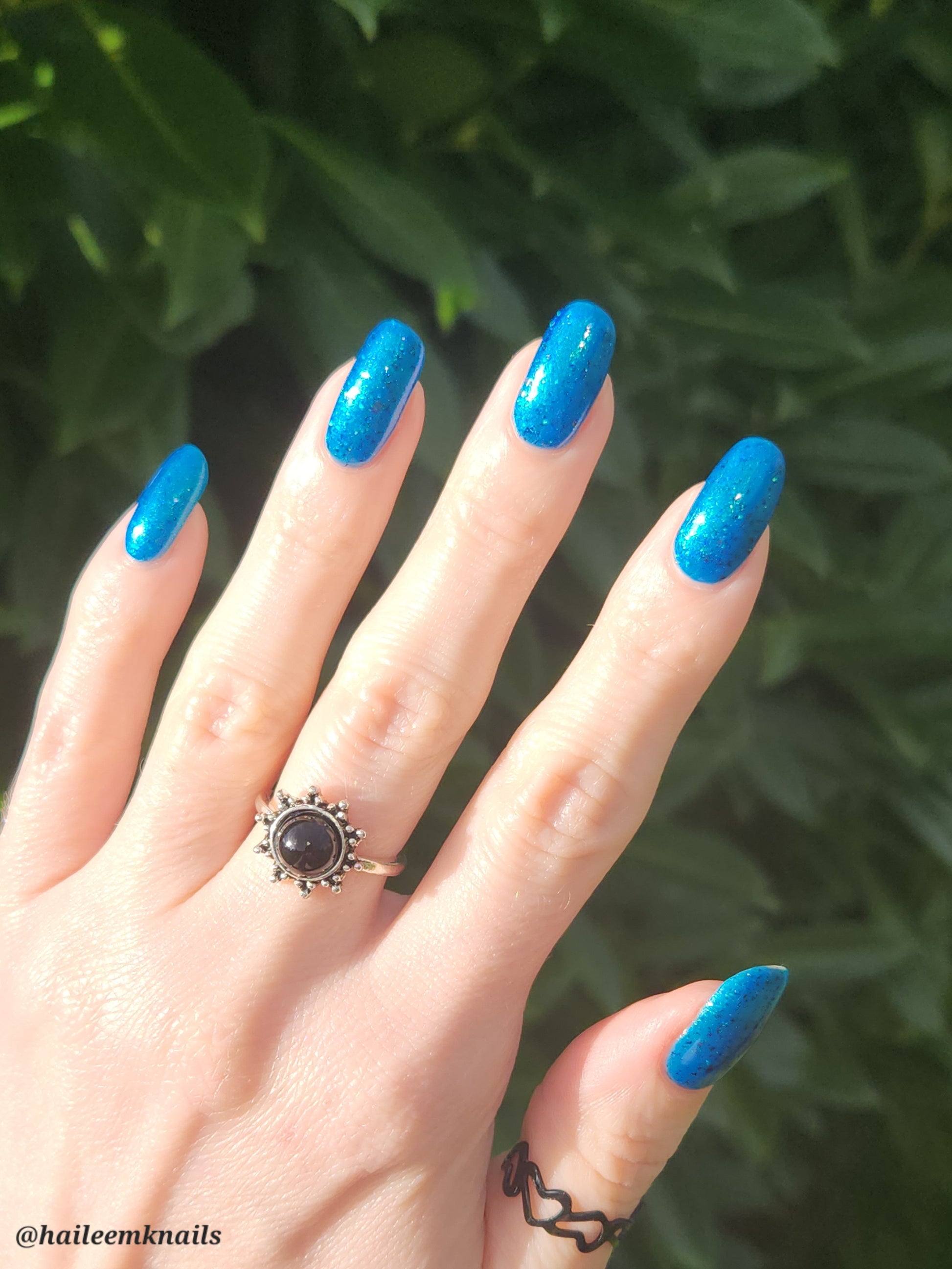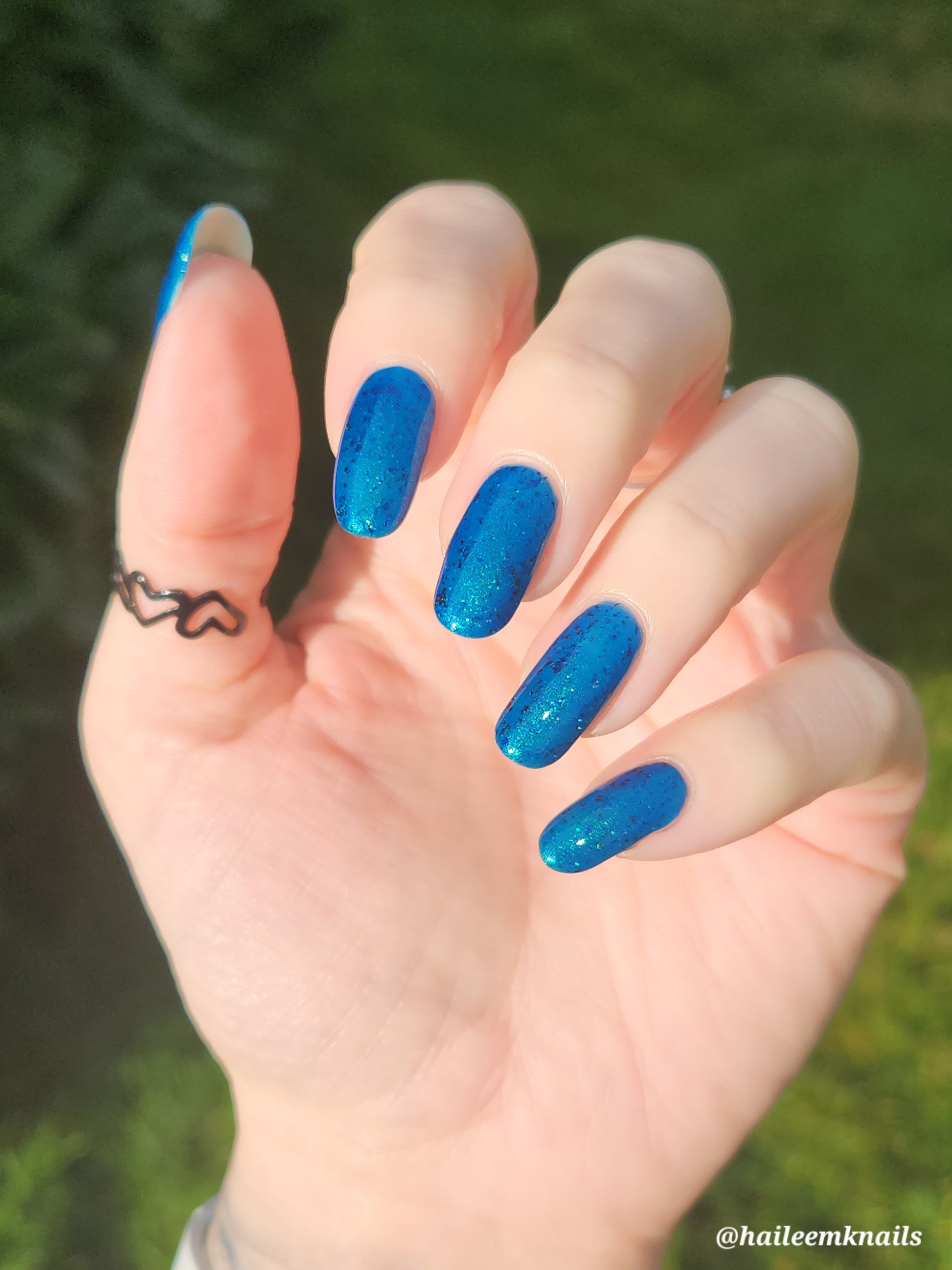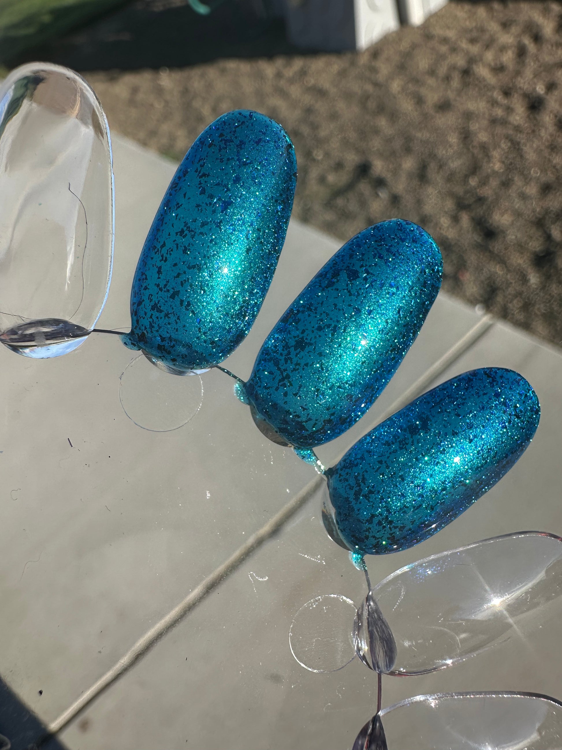 A blue base with green and blue shimmer, and teal/blue/purple flakes.