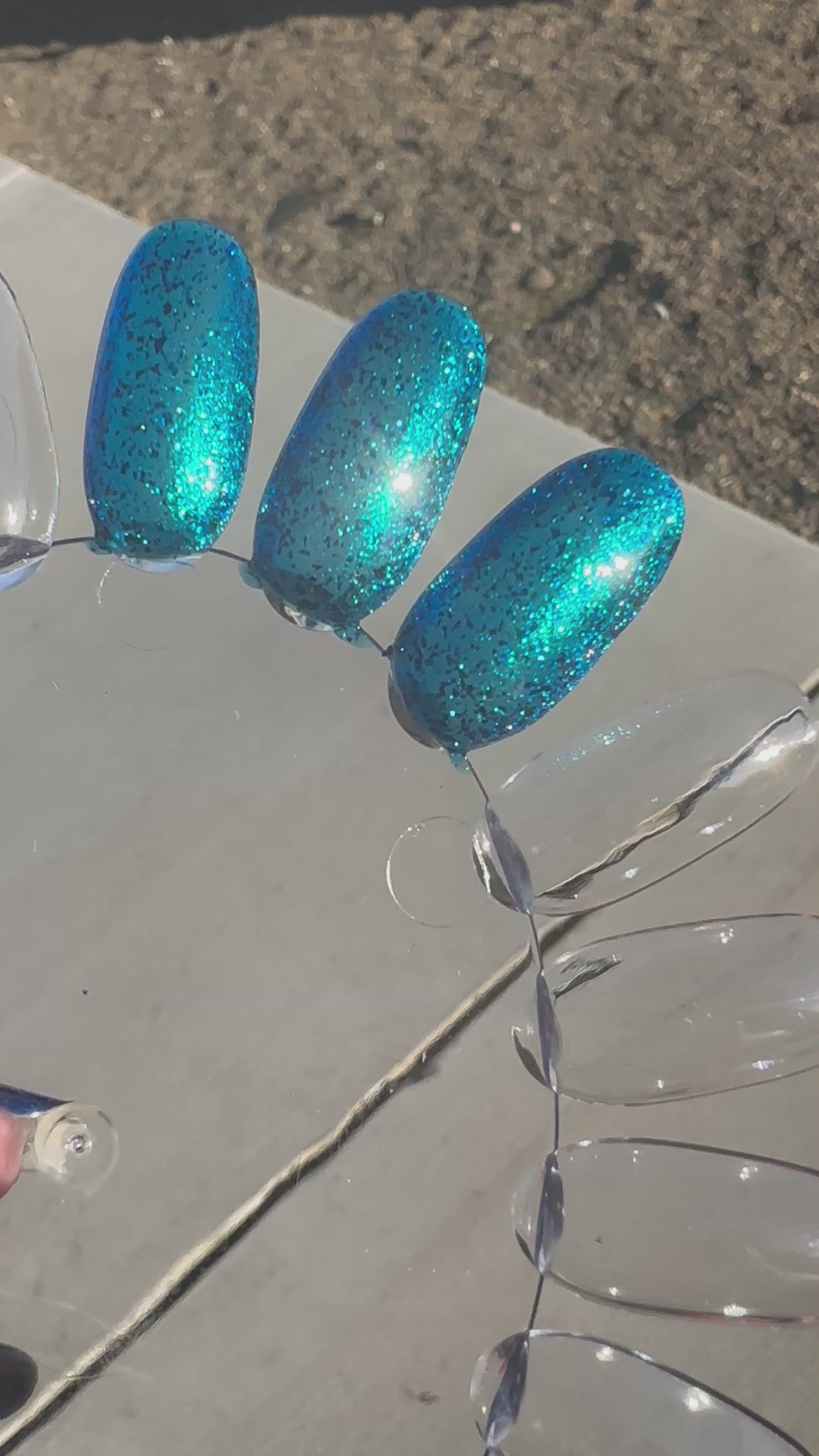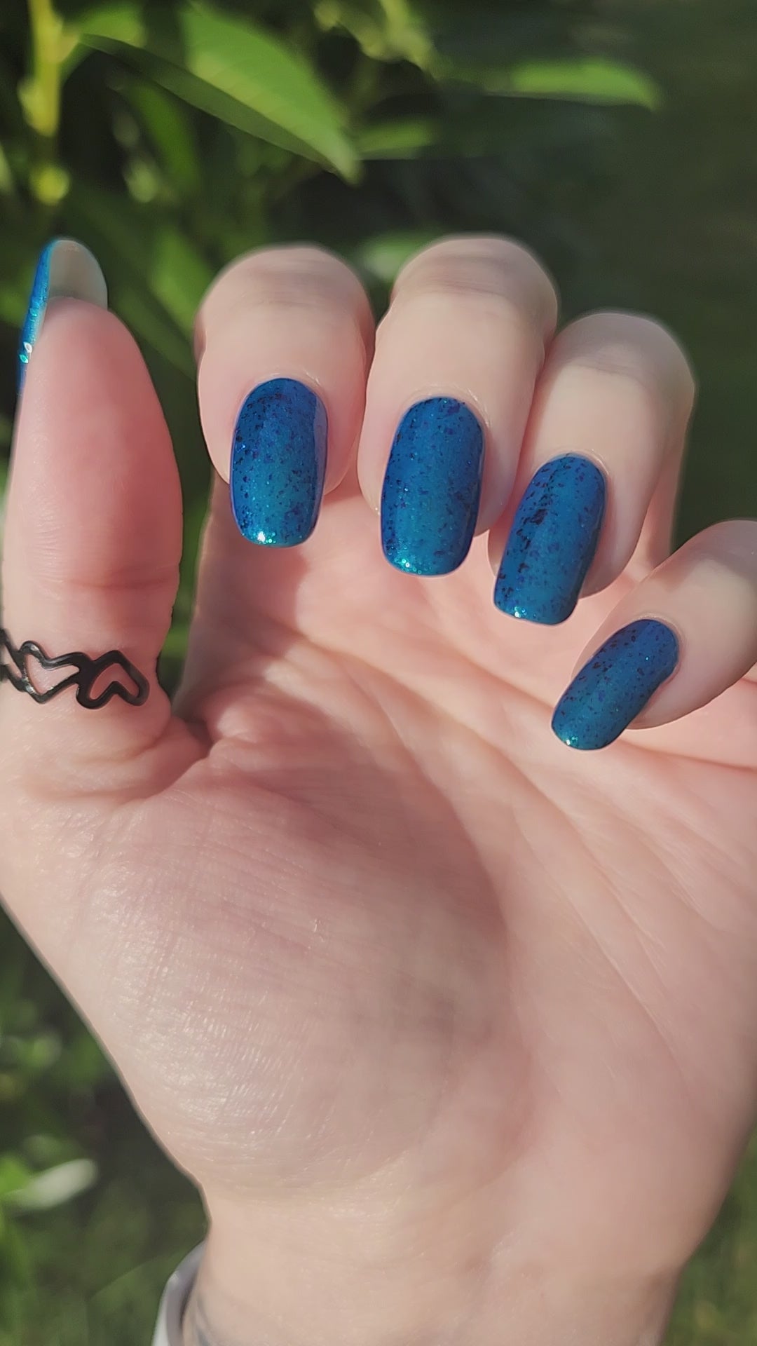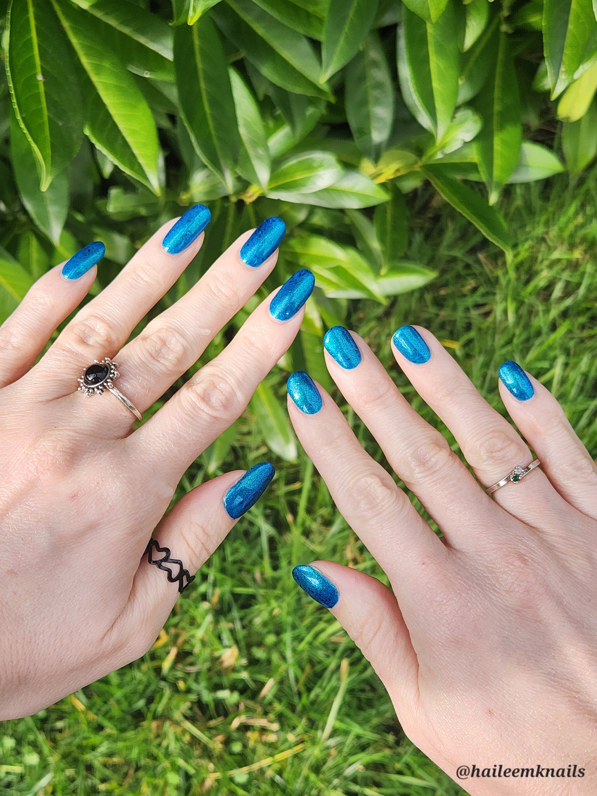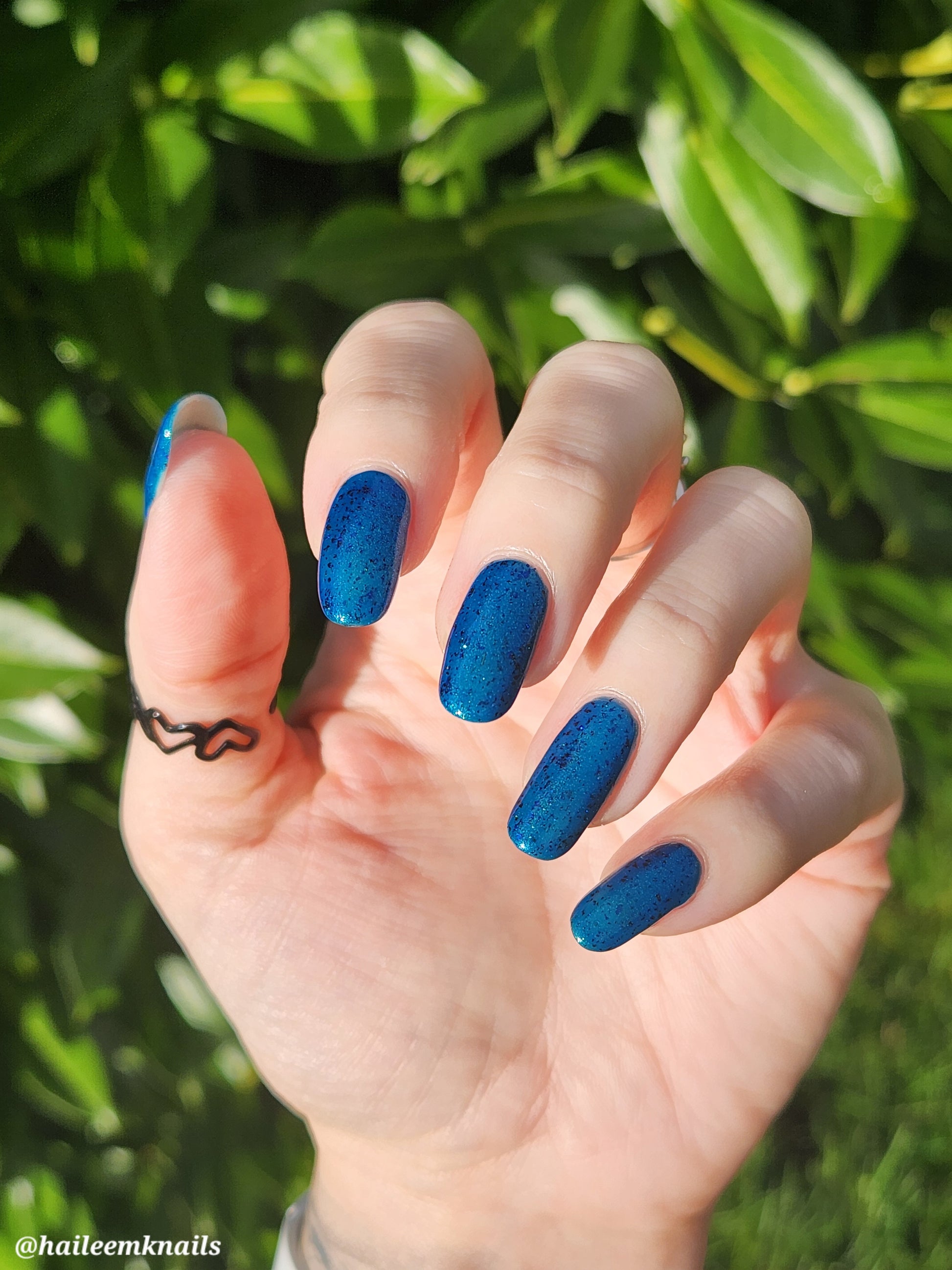 A blue base with green and blue shimmer, and teal/blue/purple flakes.