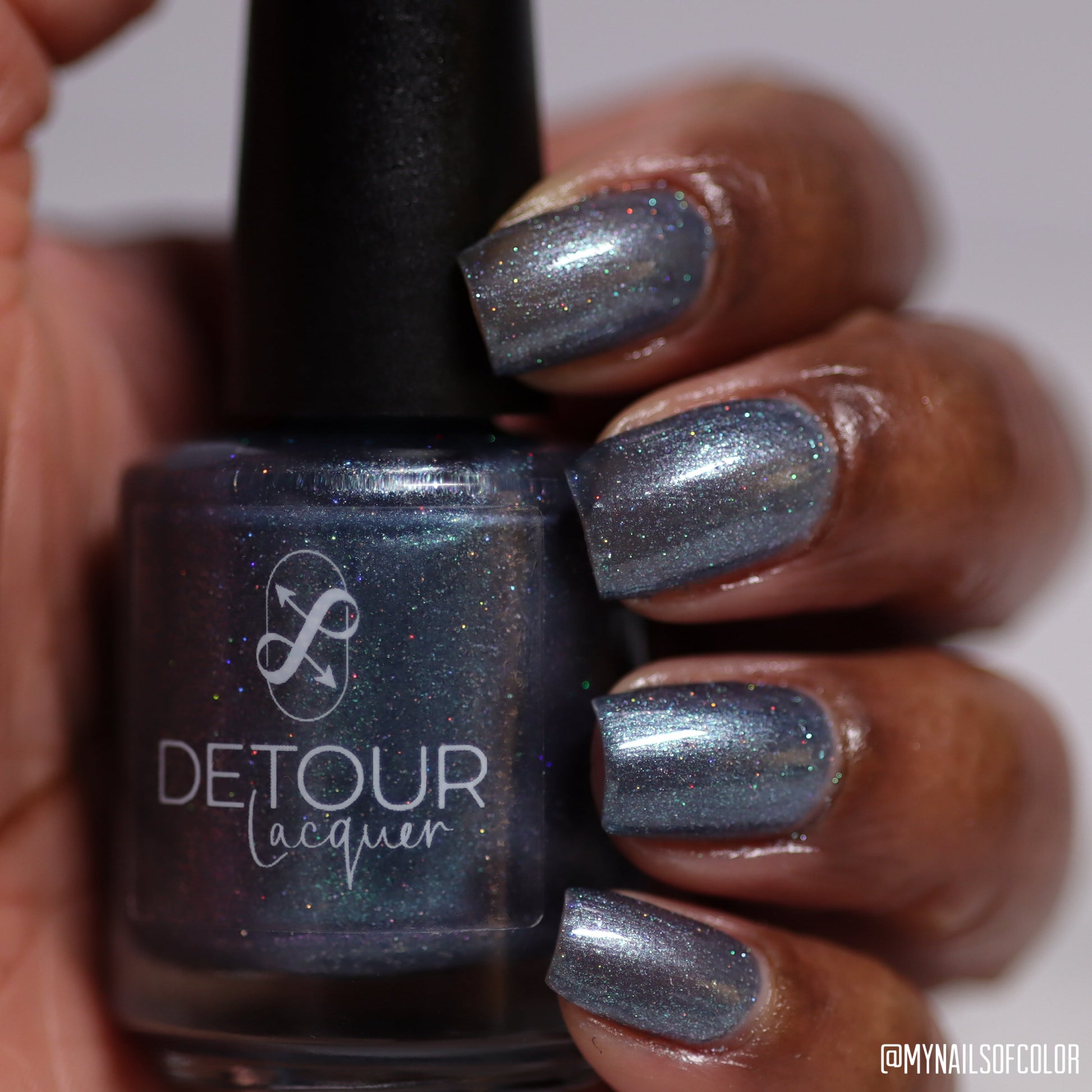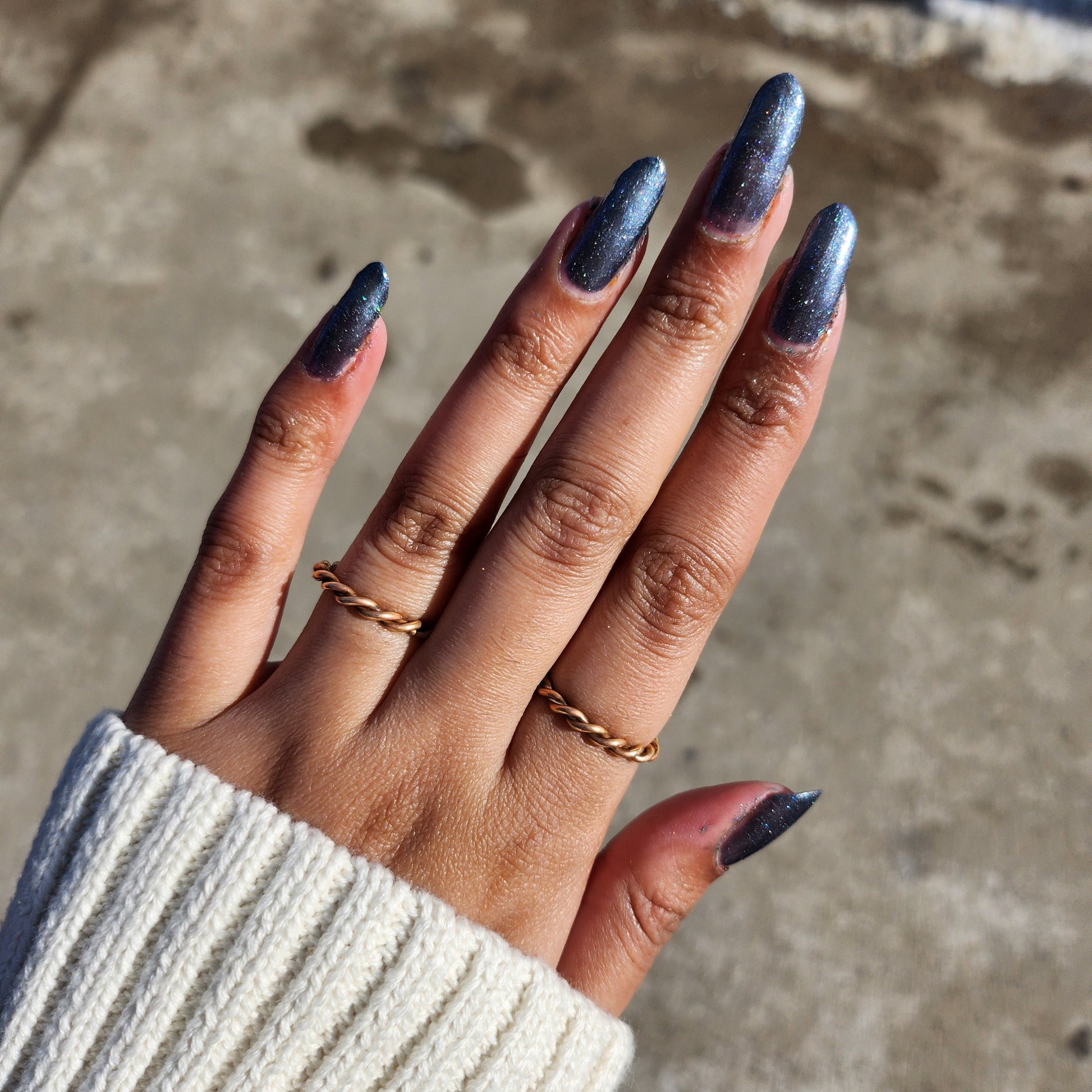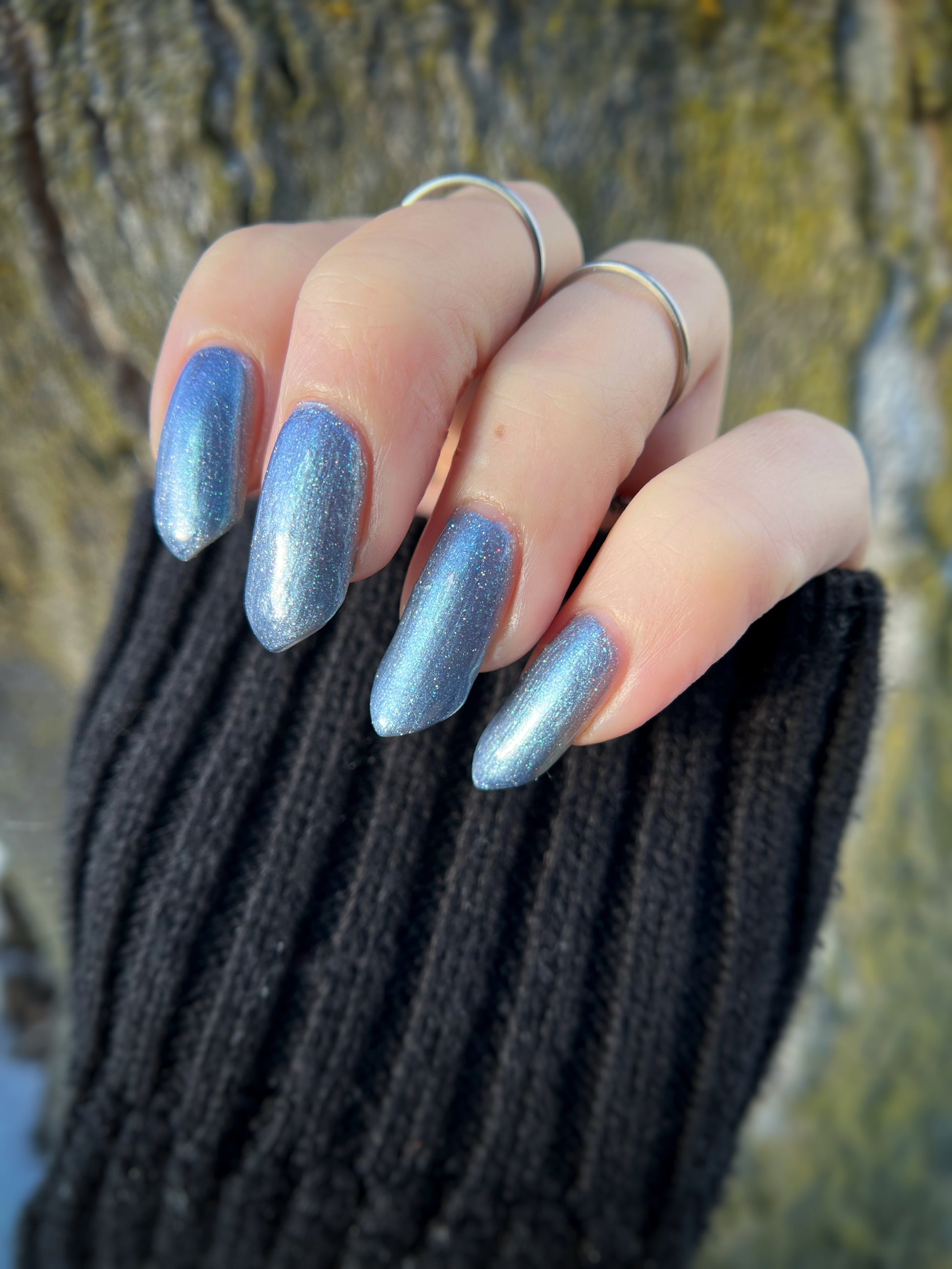 Evening Tide is a light steel blue base with a green shimmer and holo glitters. Like the moon glistening upon shallow tide pools, this polish feels soft and serene.