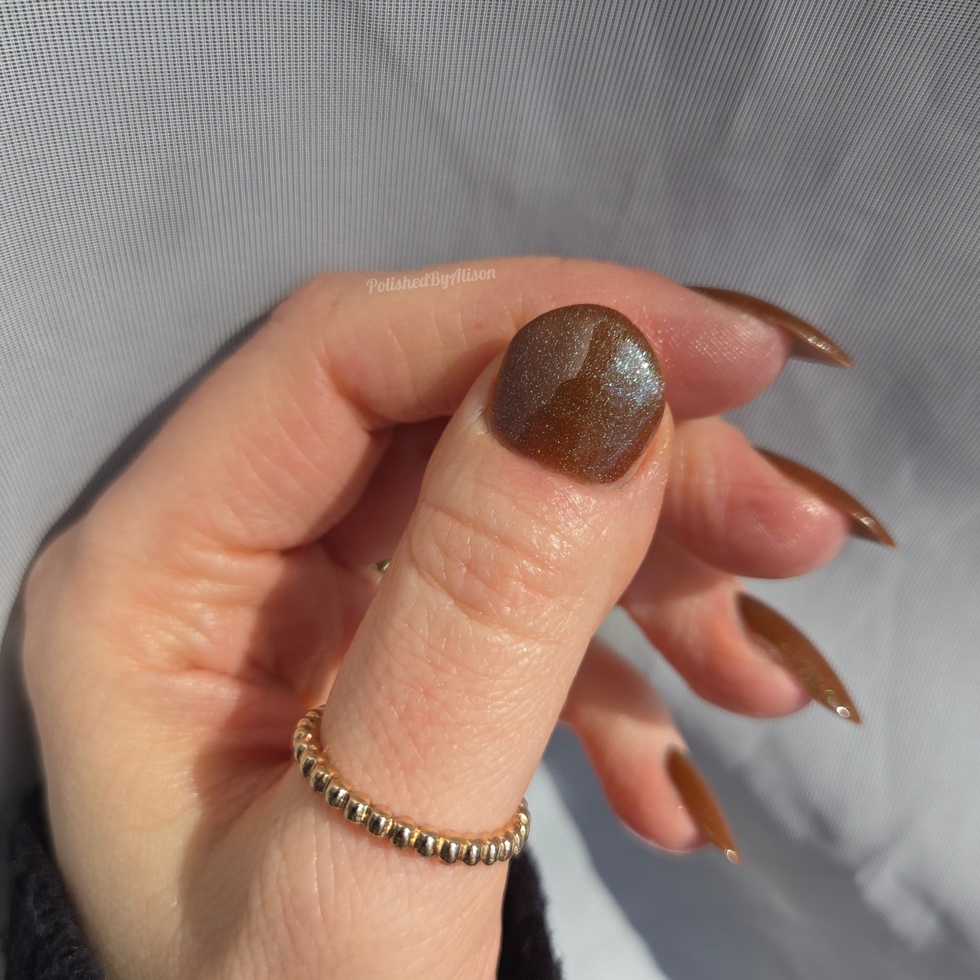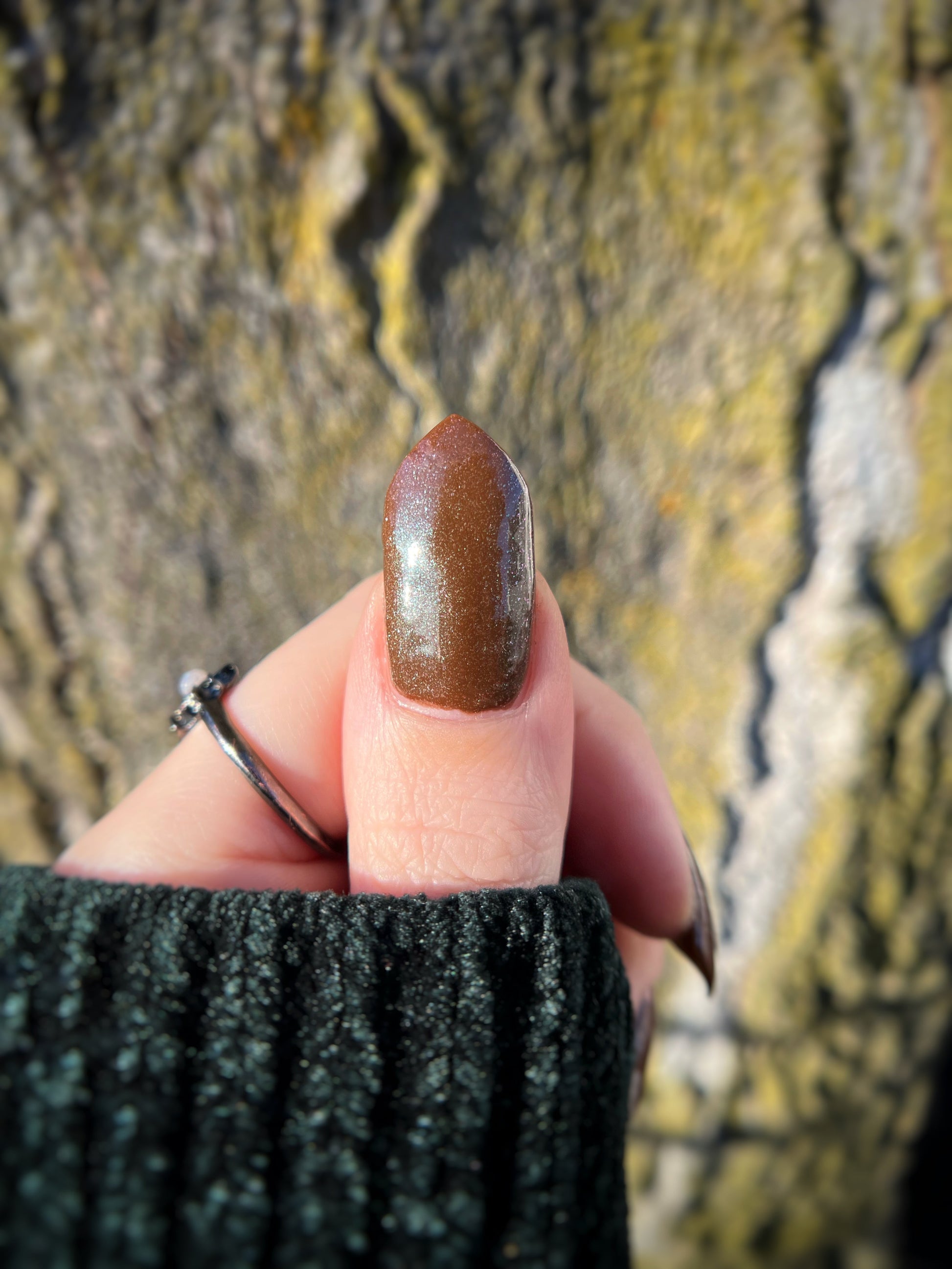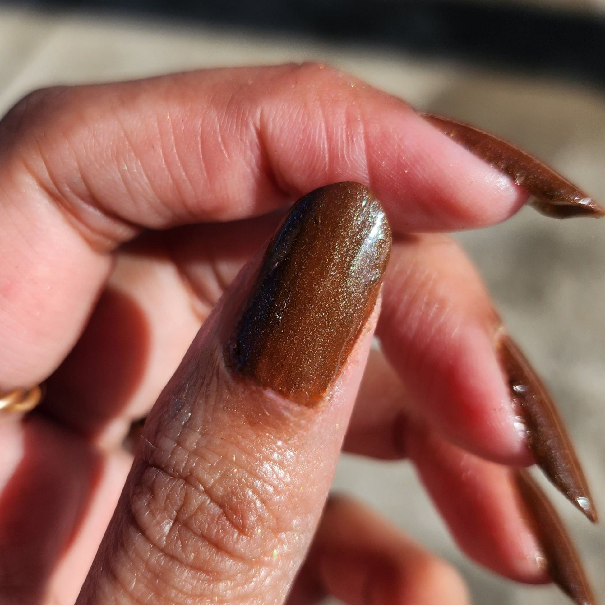 Dip your fingers and toes into the soft Cocoa Sands and indulge in this rich caramel brown polish, lightly dusted with green shimmer and holo. This polish is beautiful and unique, much like the Sirens who choose to adorn it.