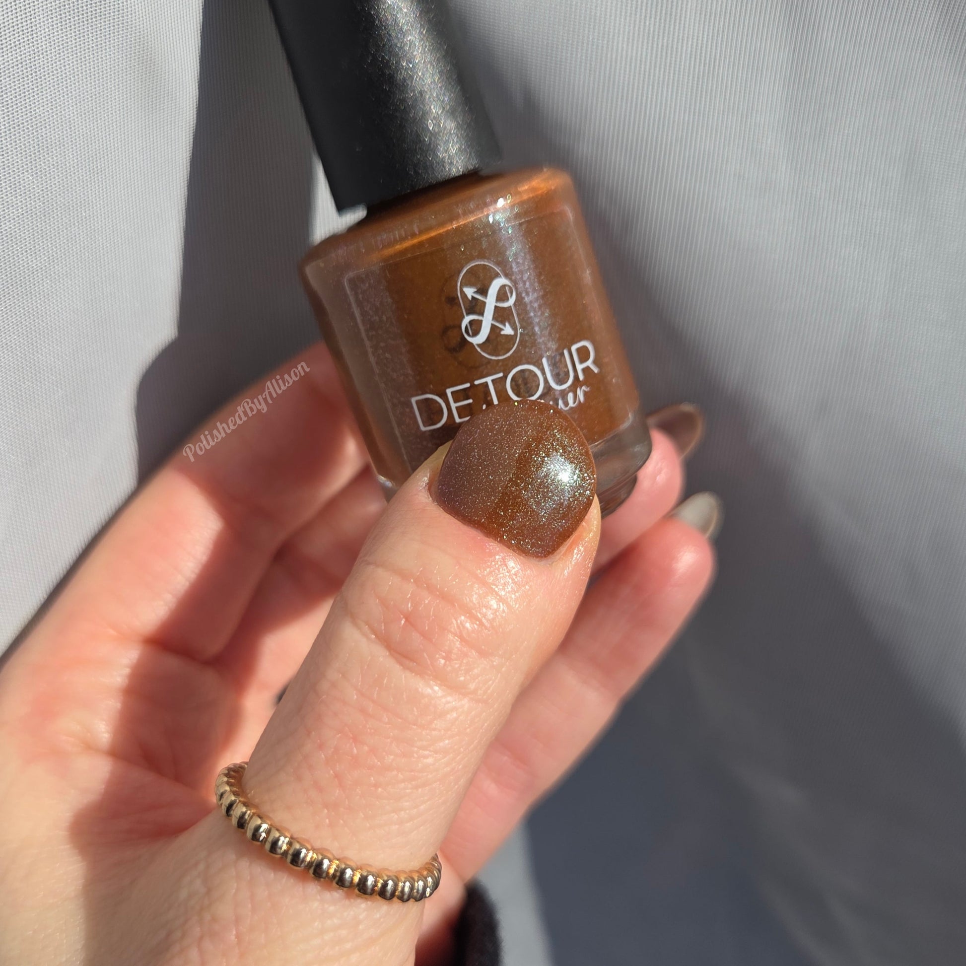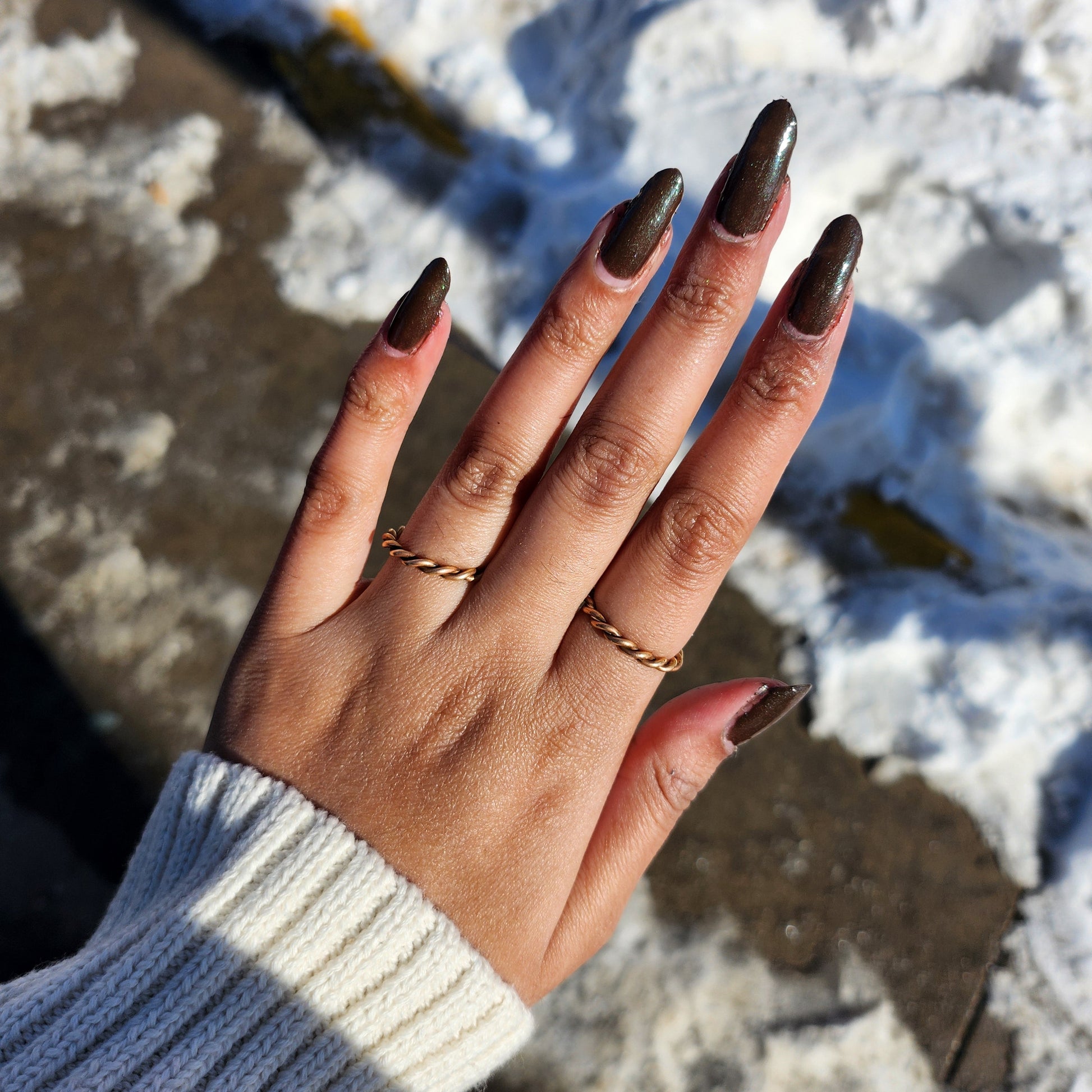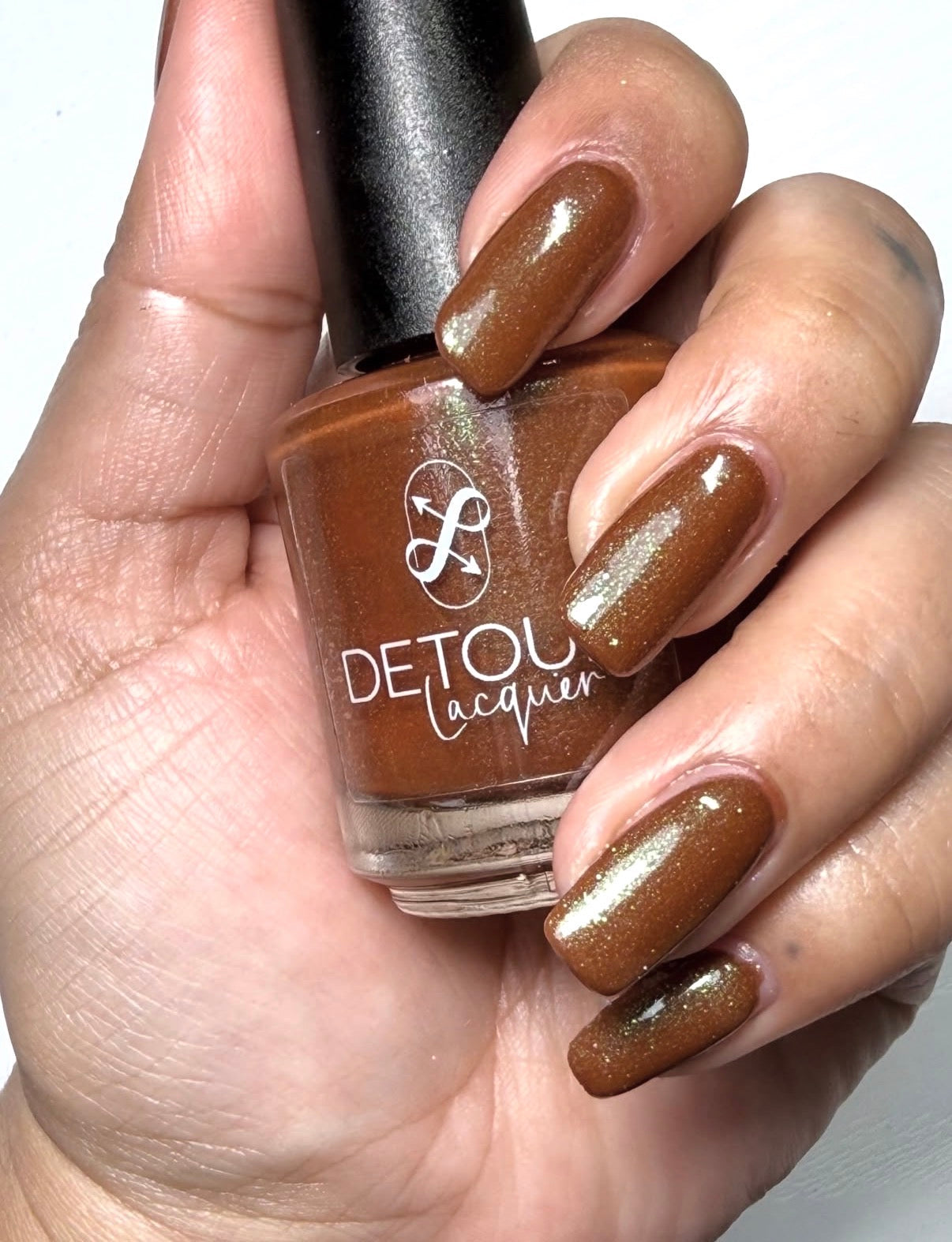Dip your fingers and toes into the soft Cocoa Sands and indulge in this rich caramel brown polish, lightly dusted with green shimmer and holo. This polish is beautiful and unique, much like the Sirens who choose to adorn it.