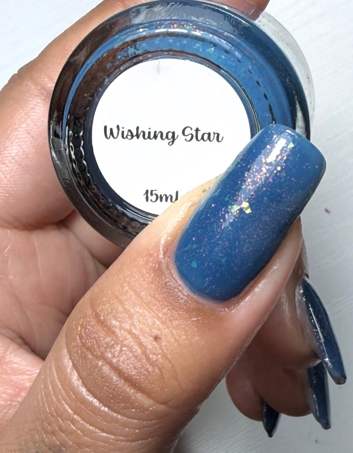 Wishing Star is magic in a bottle. This azure blue polish has iridescent flakes and an orange aurora shimmer. It's like wearing glistening sea glass on your fingertips (or toes!).