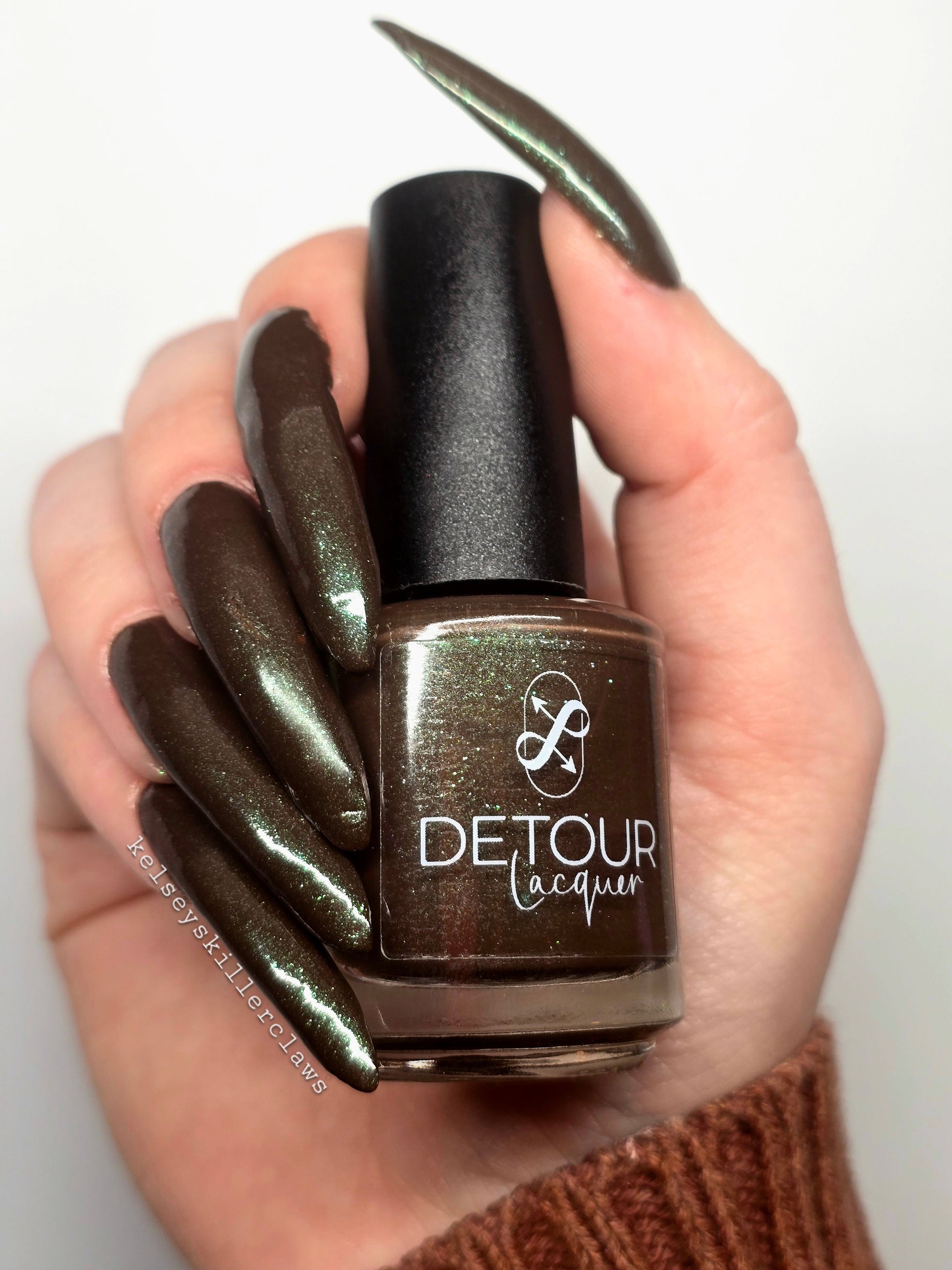 Chocolate Driftwood is a delectable chocolate brown polish with green shimmer and holo. The rich, earthy brown and soft suggestions of seaweed will take you away to a day at the beach.