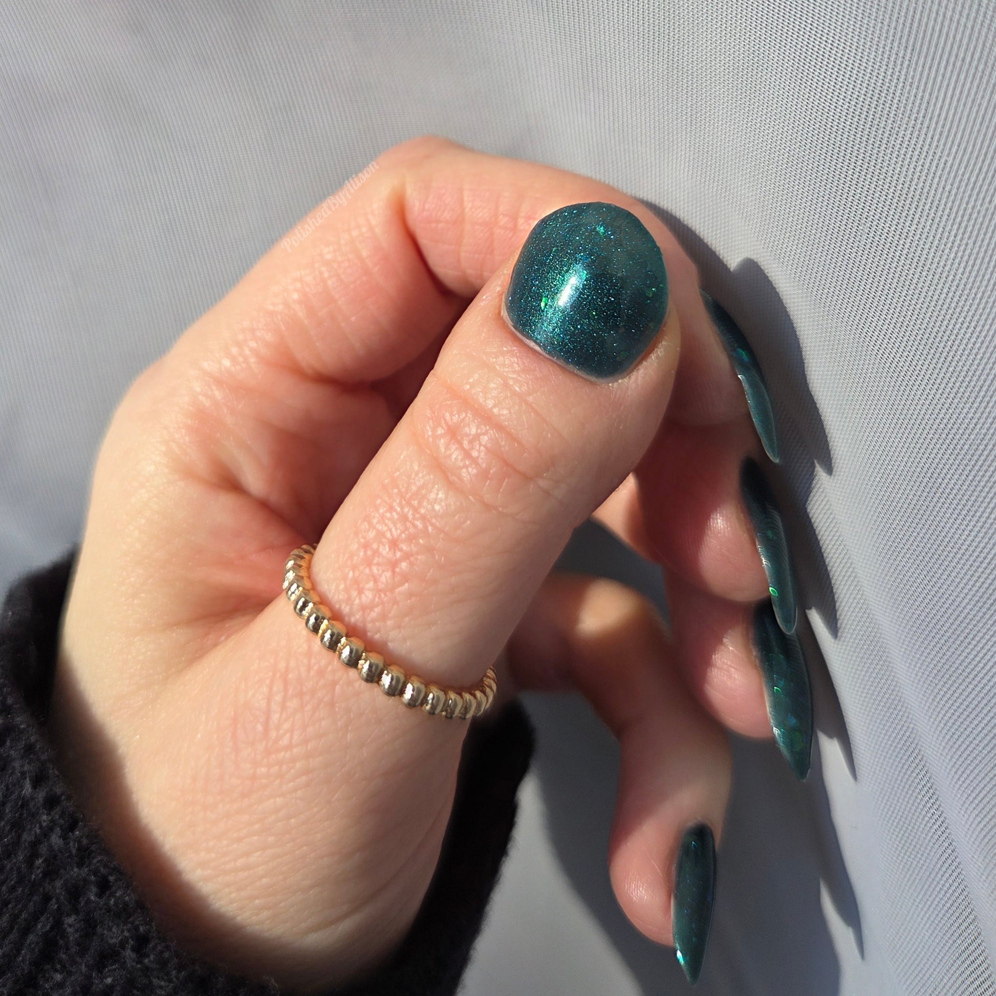 Take a stroll beneath the Oceanlit Sky, where you’ll be entranced by nature's beauty. This captivating polish has a deep peacock teal base, color shifting flakes, and blue microglitters. It's like staring into the ocean waves at night and noticing how the stars reflect off the water.