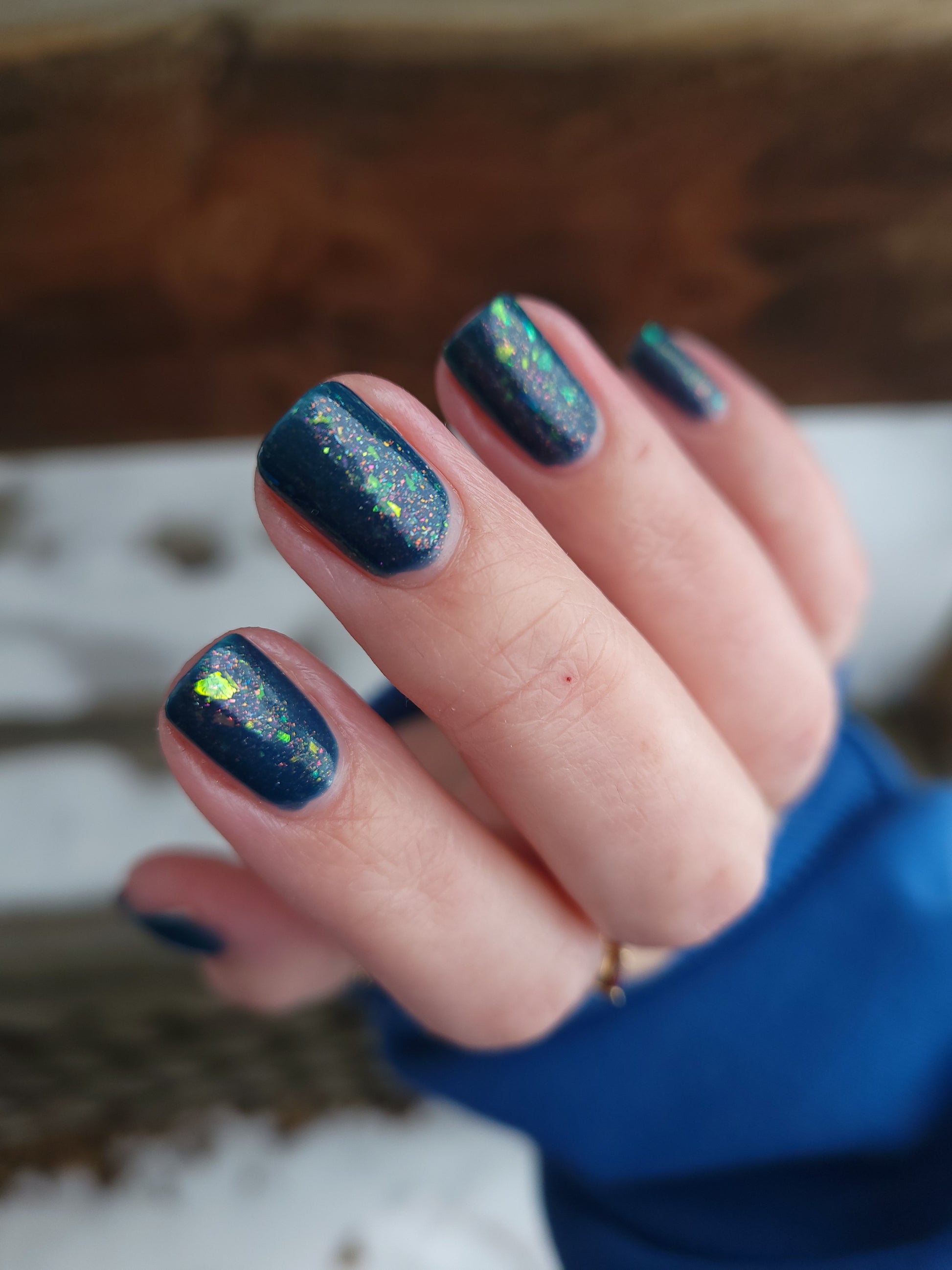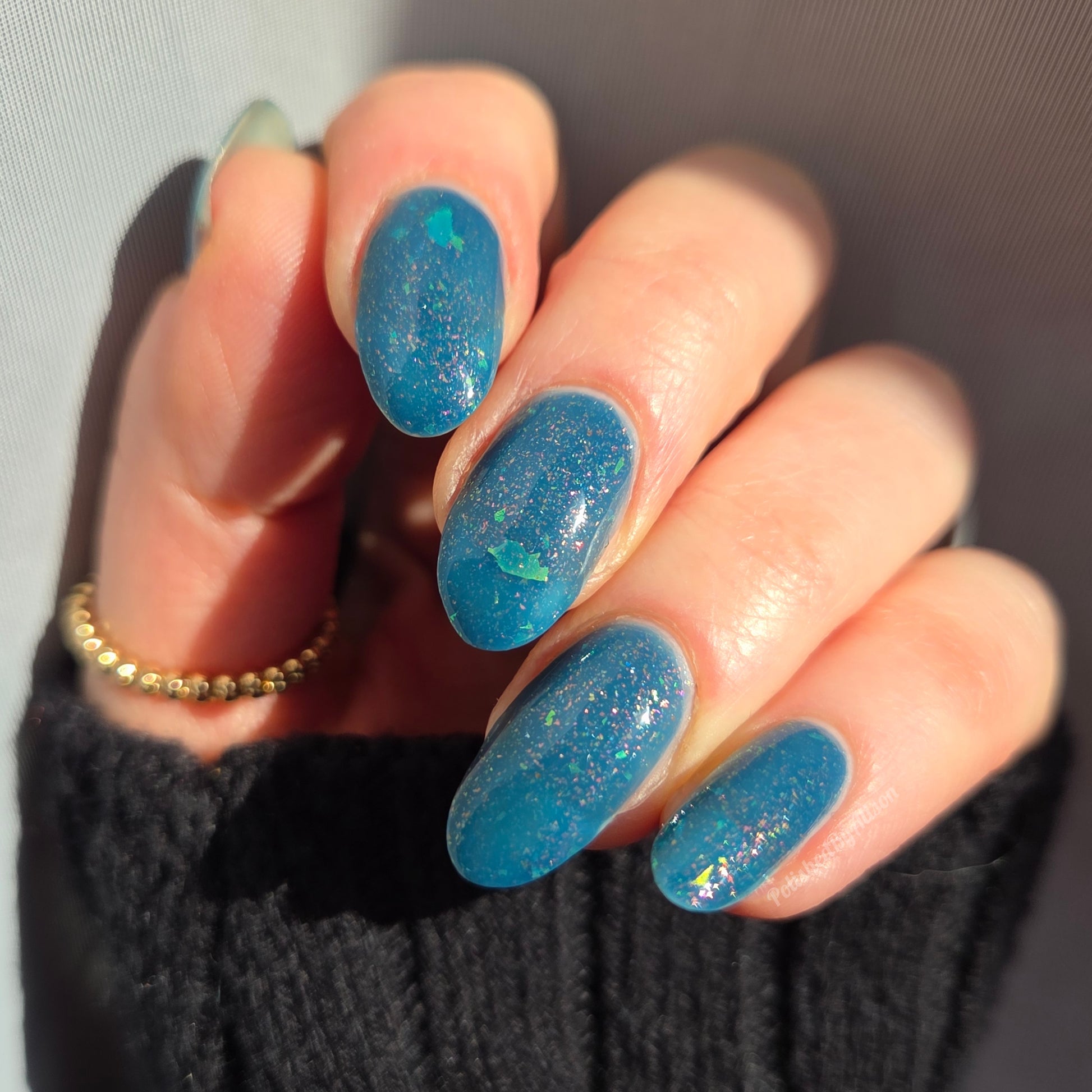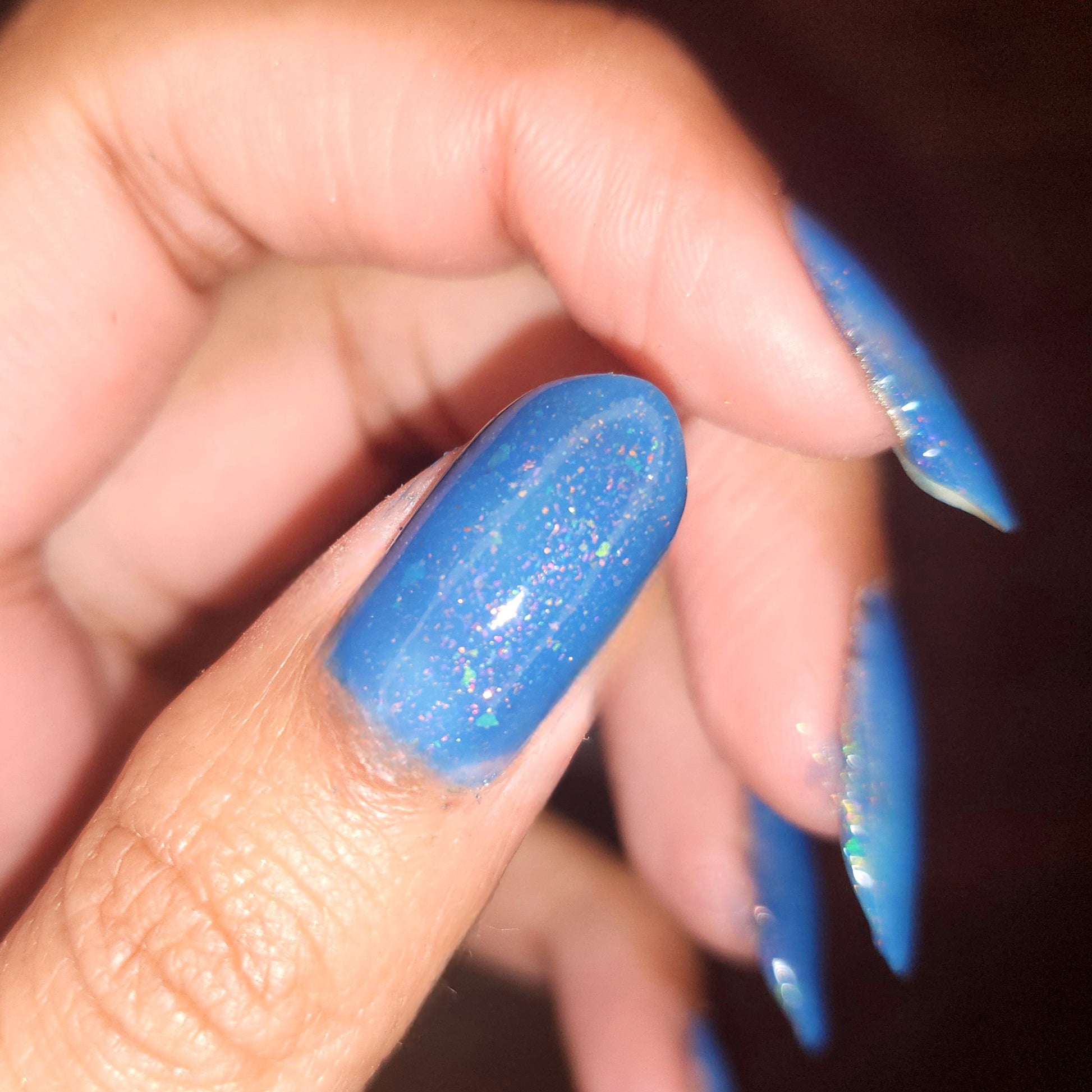 Wishing Star is magic in a bottle. This azure blue polish has iridescent flakes and an orange aurora shimmer. It's like wearing glistening sea glass on your fingertips (or toes!).